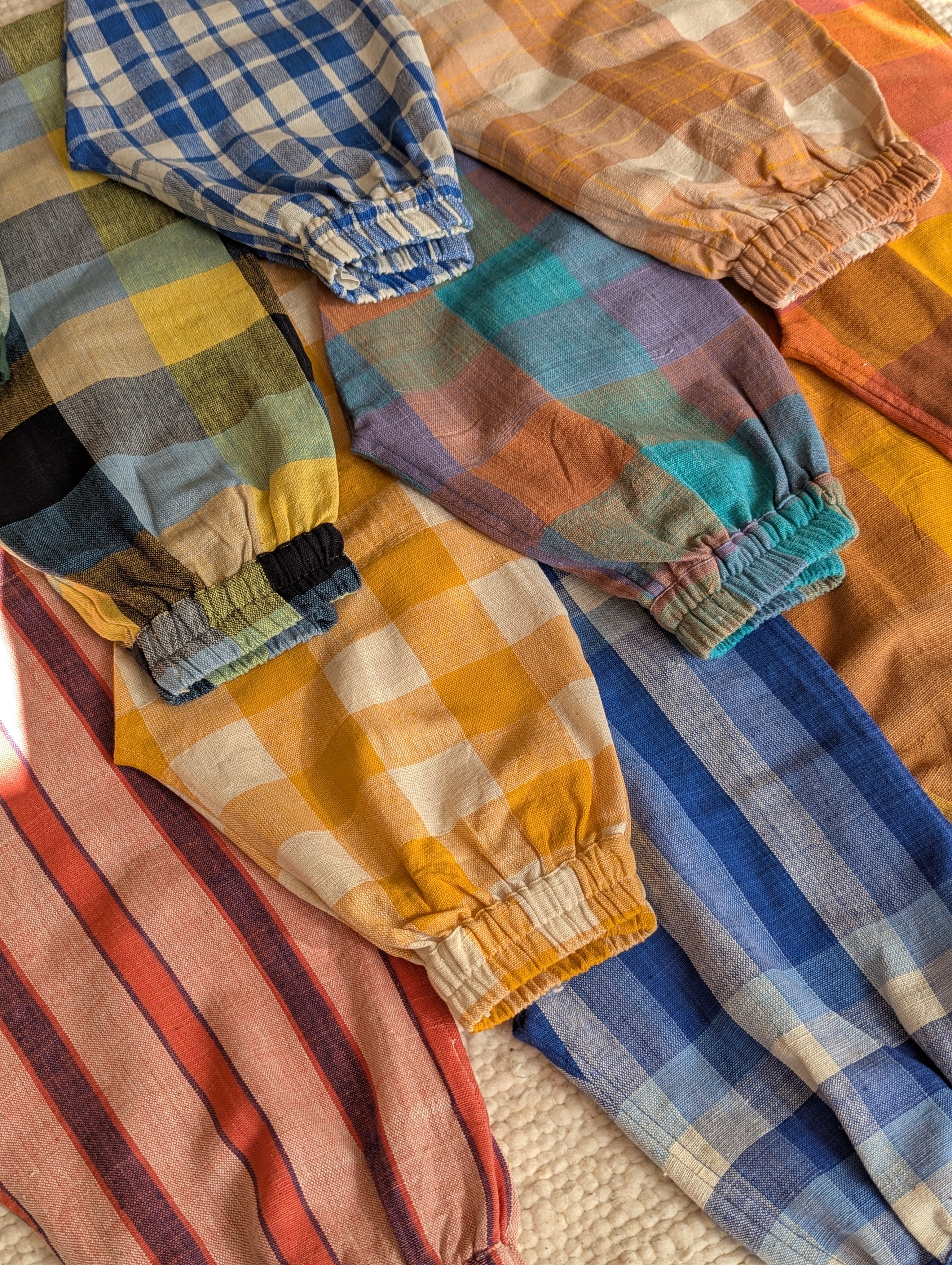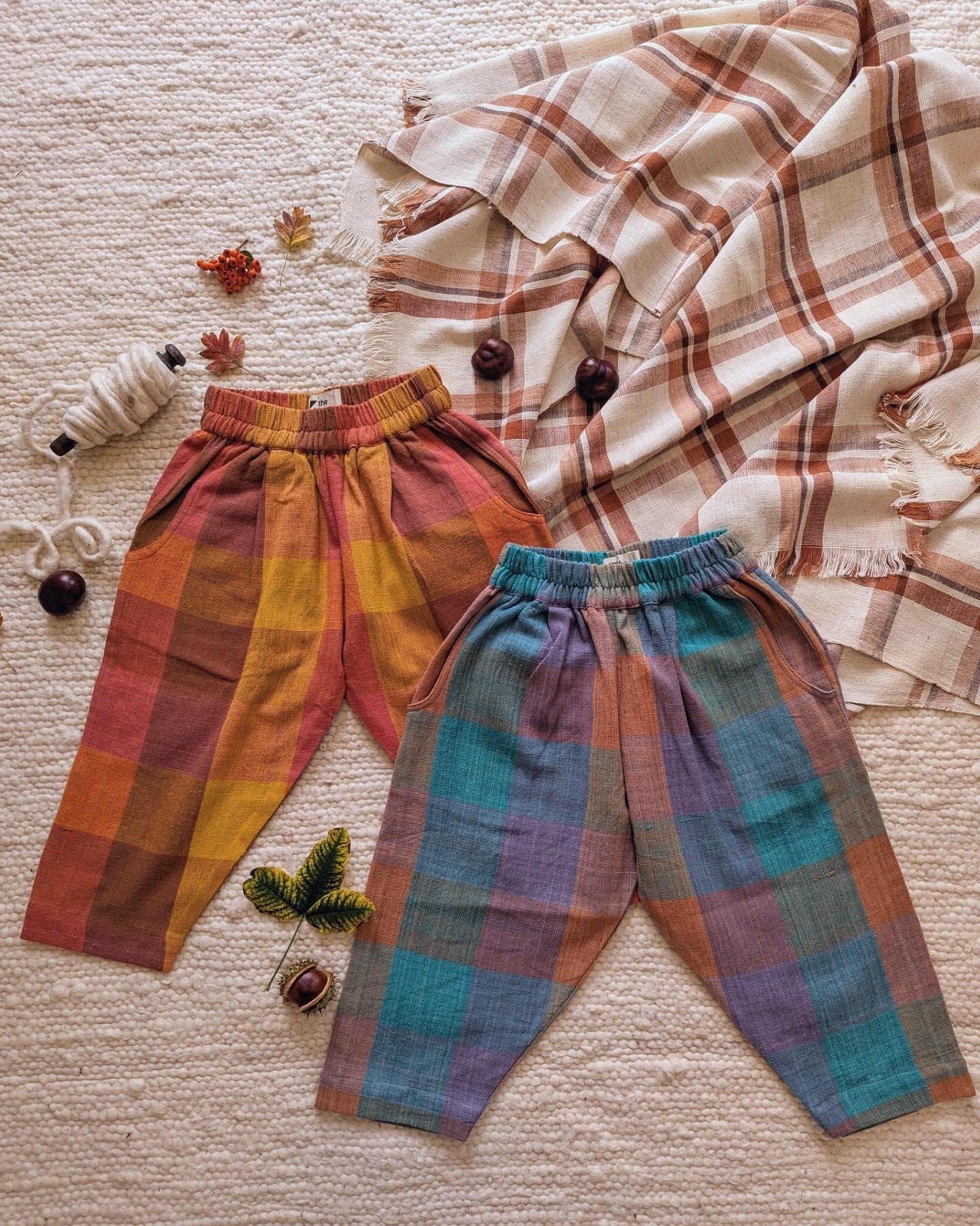 A very limited edition of handmade Kurma Trousers, truly special and very close to my heart. Once woven to grace homes and tables, these handloom Tablecloths now return with a new purpose - transformed into playful trousers for kids. Each pair has been carefully cut and sewn from hand-loomed cotton, woven by our very lovely weaving community in the Himalayas. Each pair, one of a kind, is handmade with love. Made to tell stories and carry on the legacy of a beautiful craft.