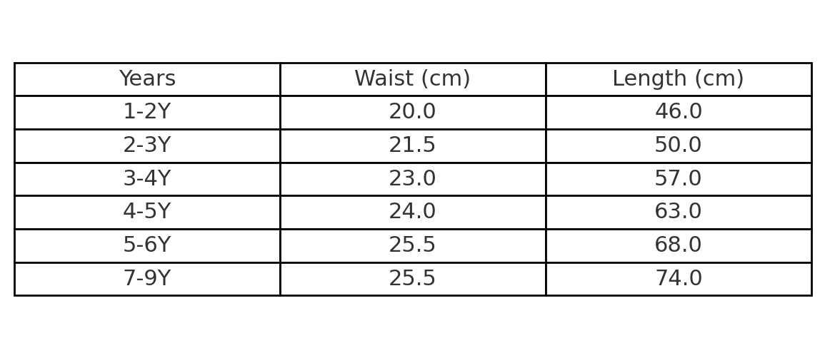 Size Guide : Our trousers are designed to be roomy and generous and we want to make sure your little one get the maximum wear out of them. They are generous and there is no need to size up. They are labelled at 1-2y, 2-3y, 3-4y so on but meant to last 2 to 4y, 3 to 5y etc. Please see the chart below for the measurements. Each pair is handmade so please expect a little variation.