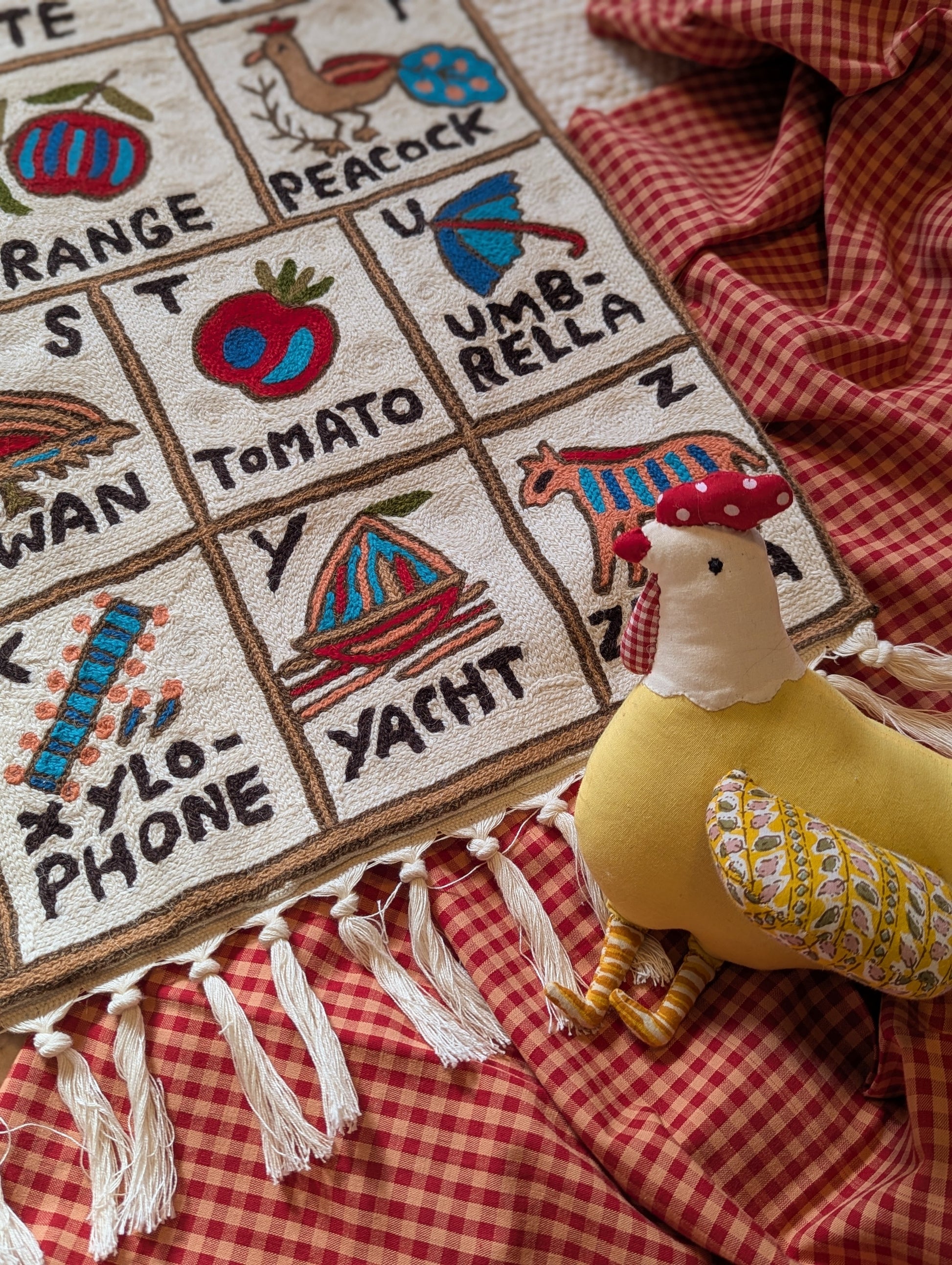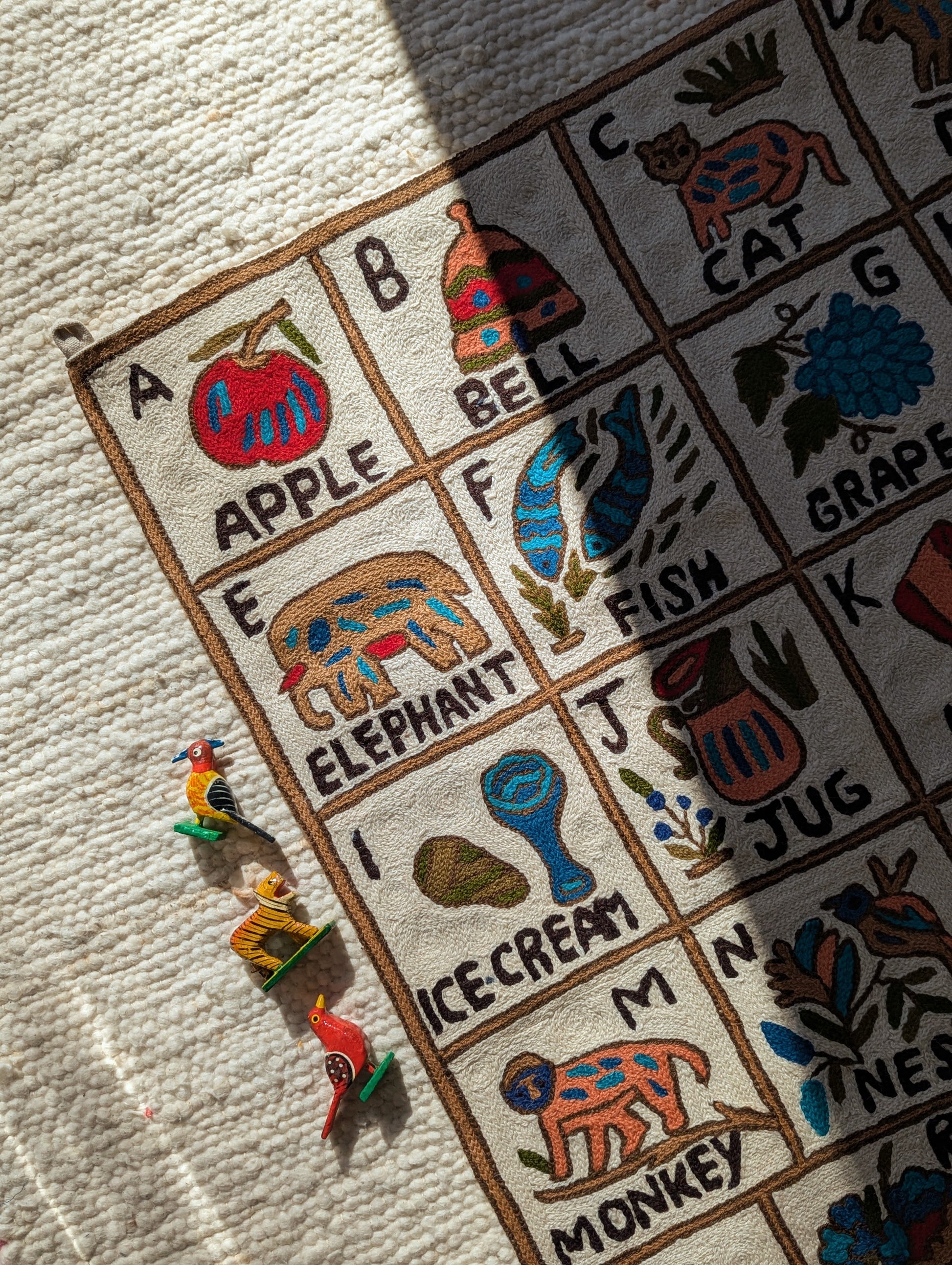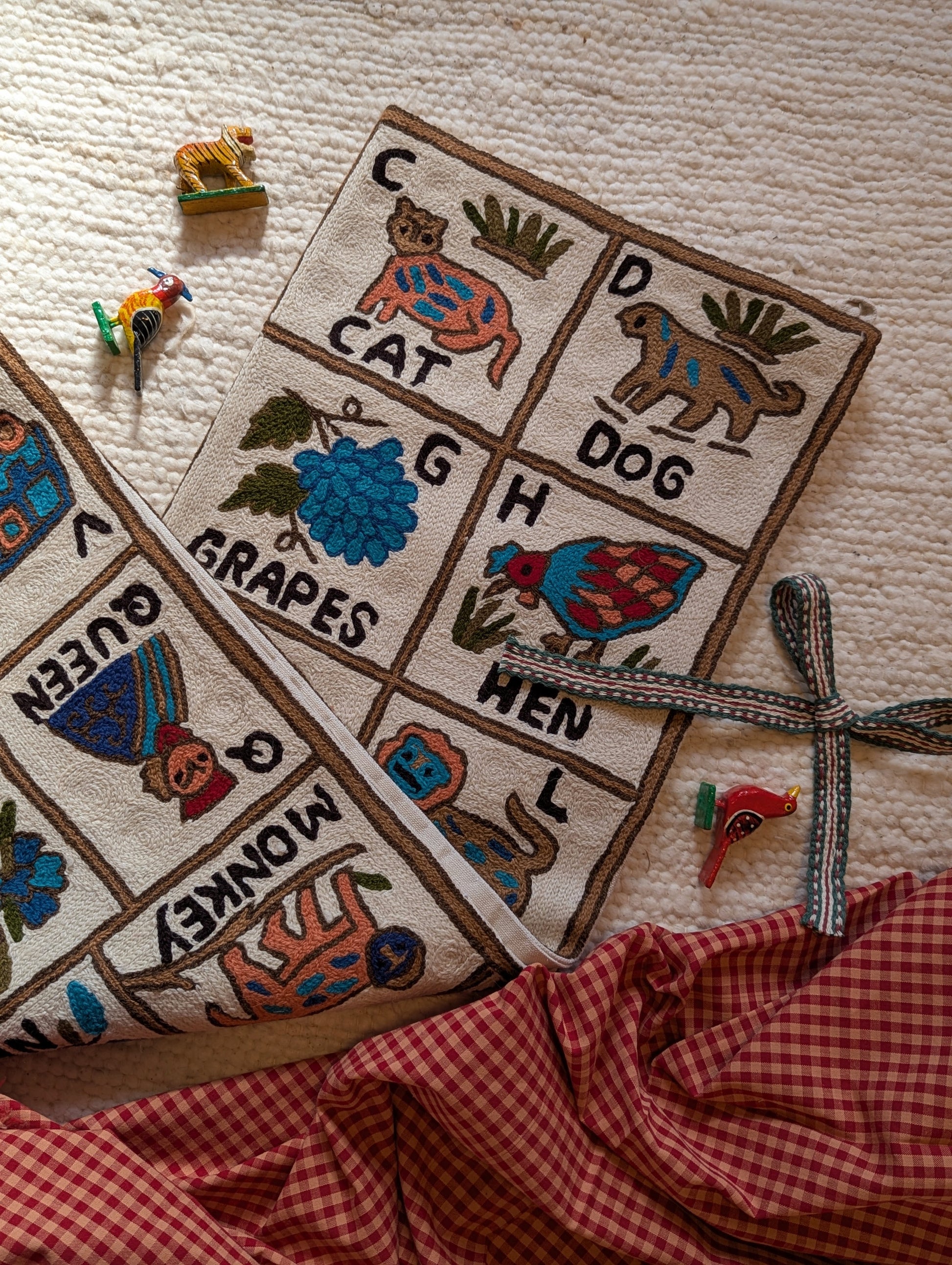 Hand Crewel Embroidery ABC Tapestry on an ecrubase.