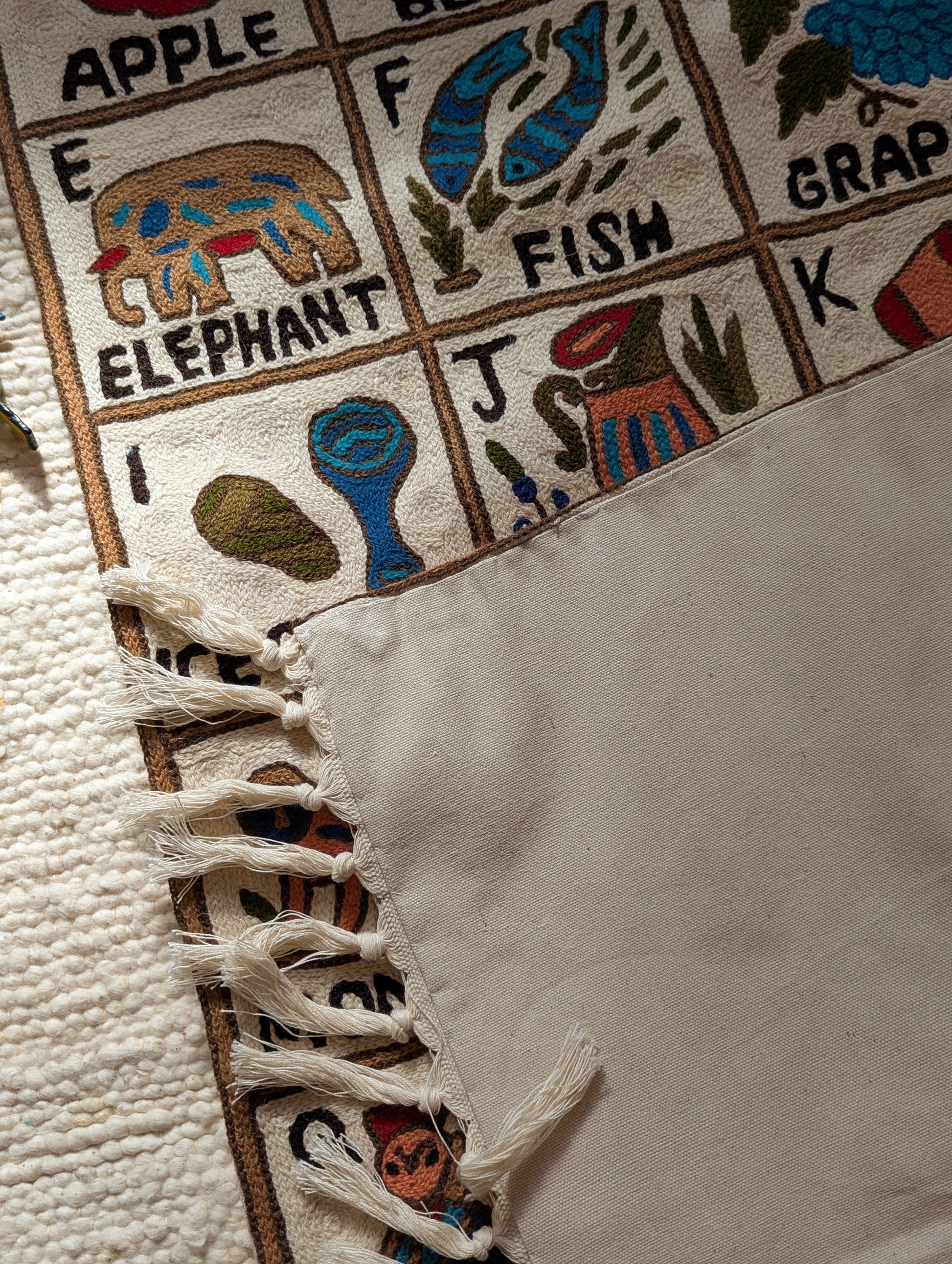 Thick canvas cotton backing, loops to hang up and finished with lovely tassels.