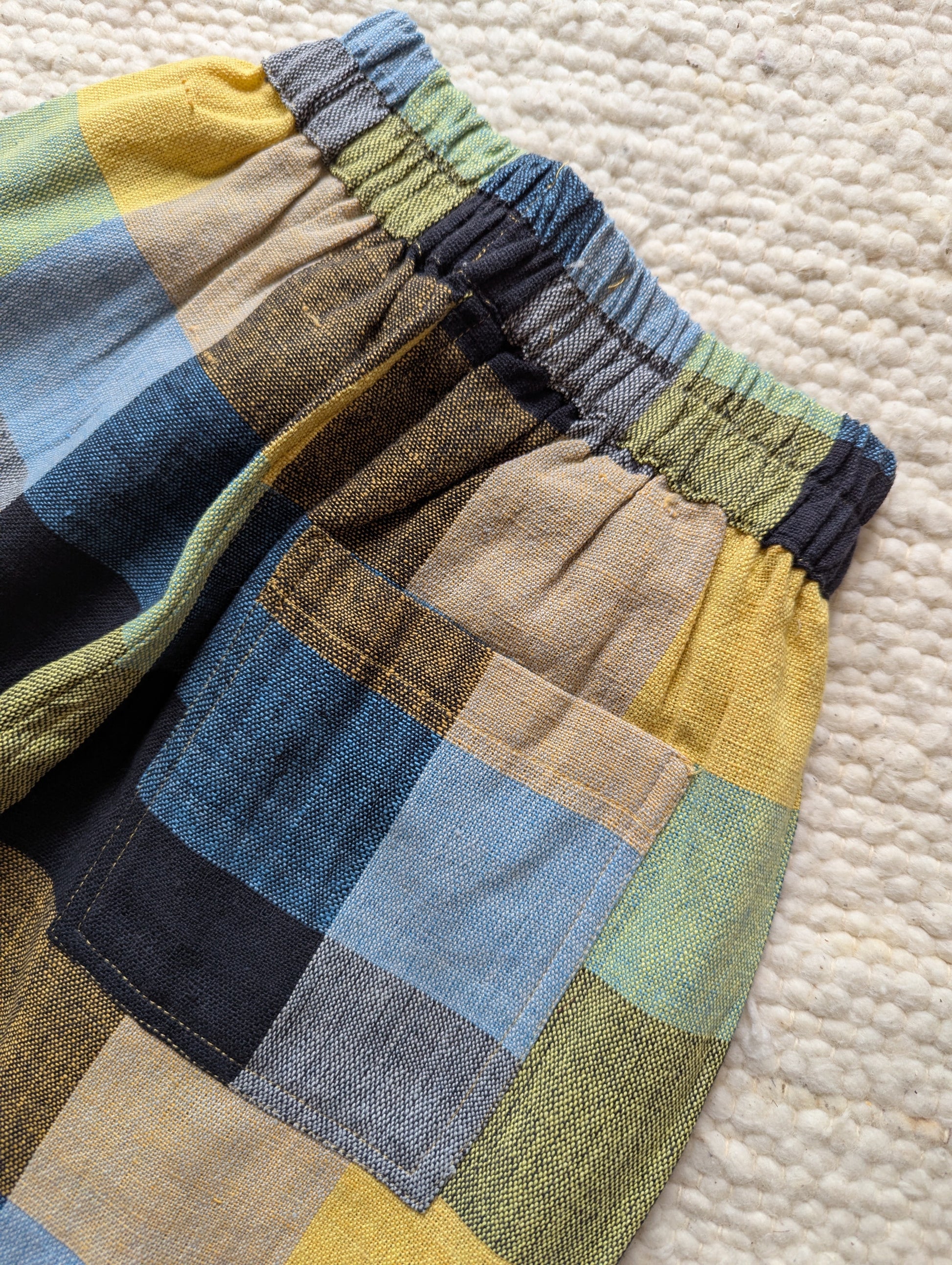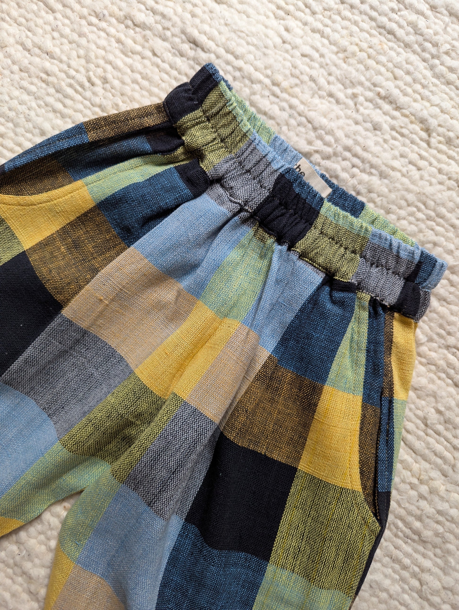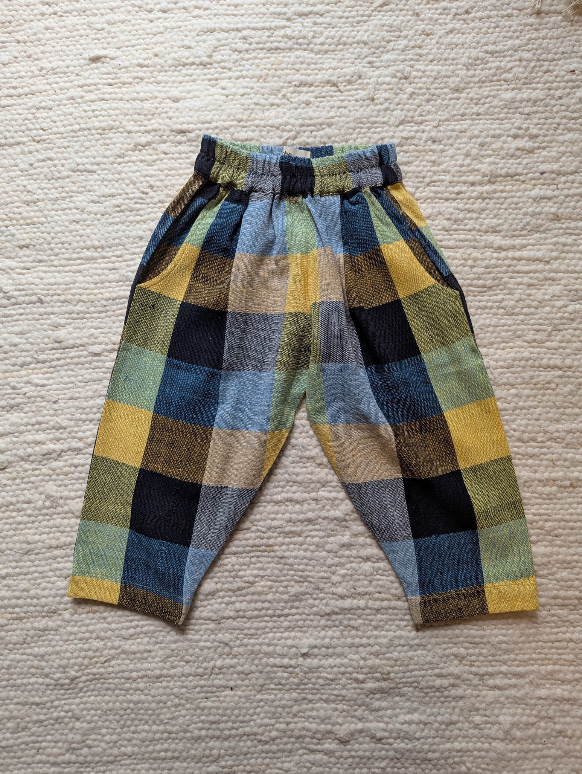 Handmade trousers in a striking mix of deep navy, soft sky blue, earthy green, and golden yellow.. lovely bold checks. The cotton is thick and durable, perfect for this weather. Designed to be roomy, allowing endless play and adventure. The trousers have elasticated waistbands, gently tapered legs, side pockets, and a back patch pocket for all the little treasures! We strive to give you quality, style and comfort in our trousers.