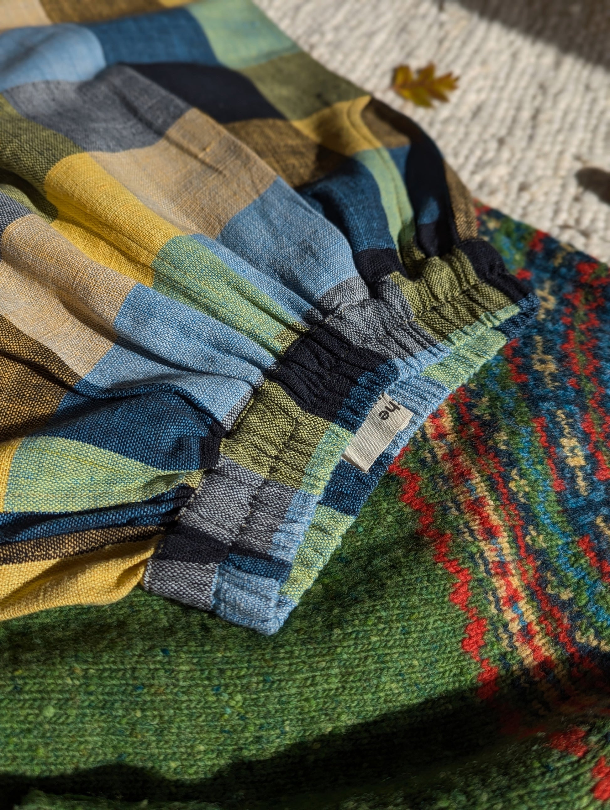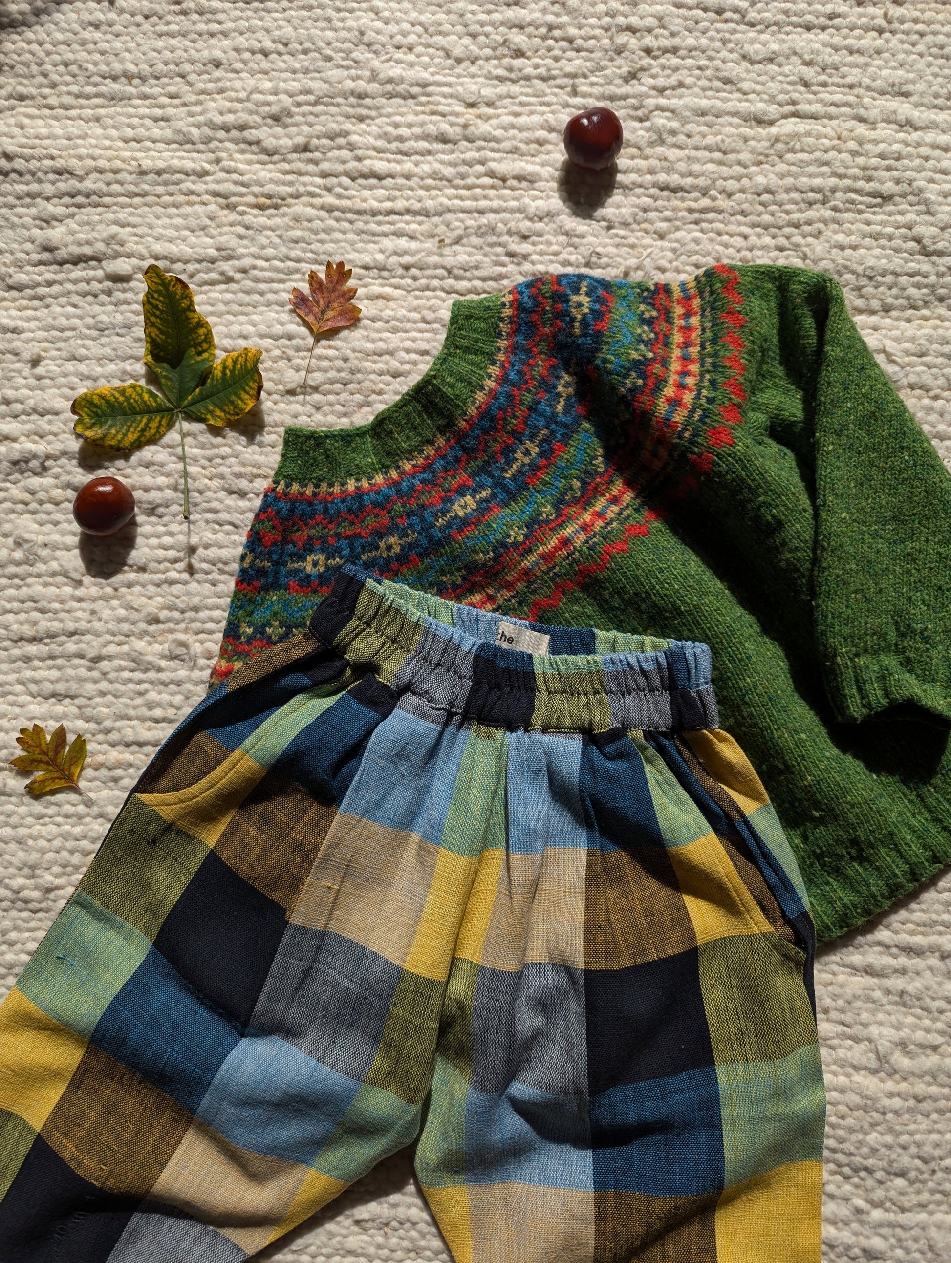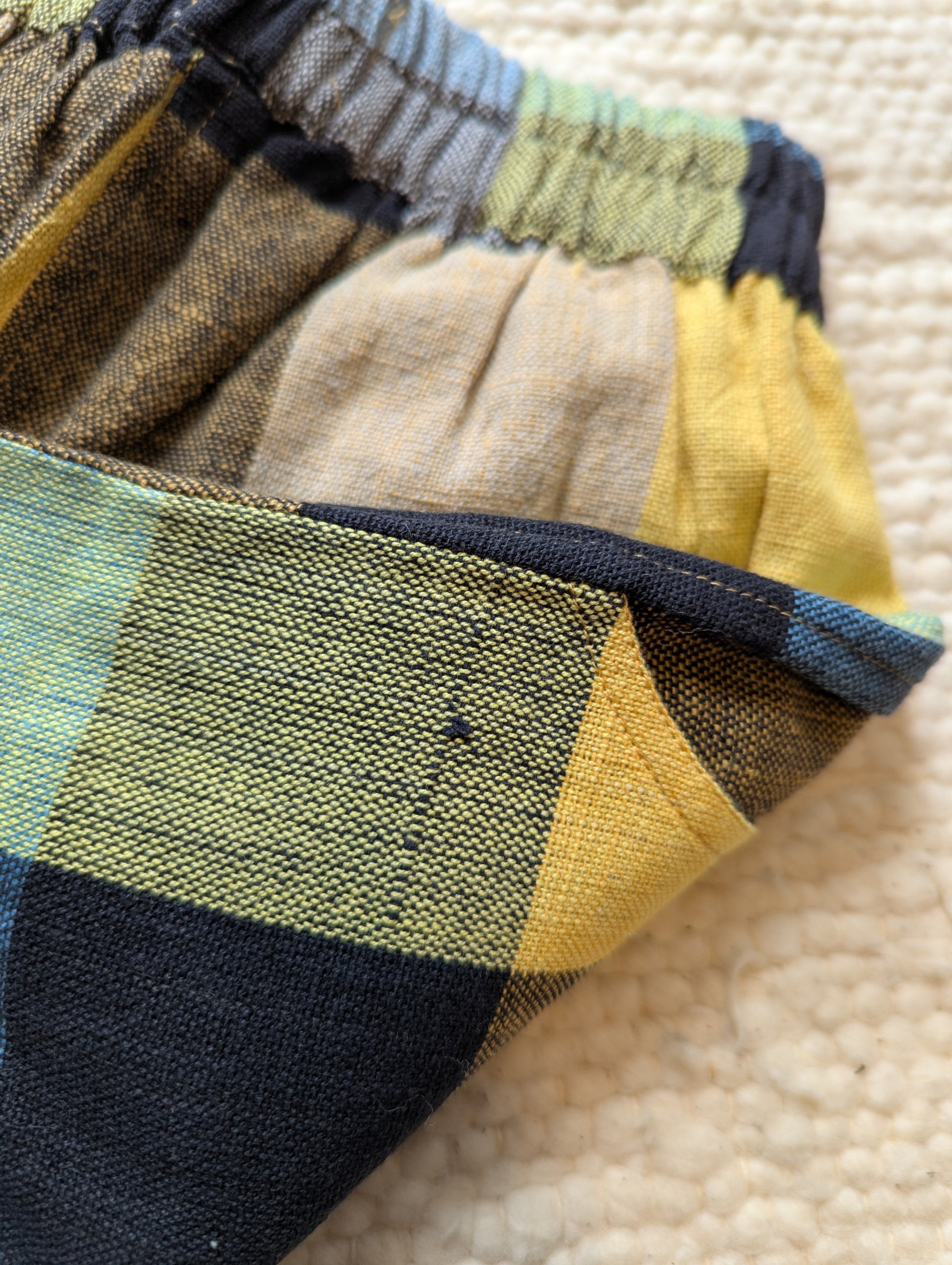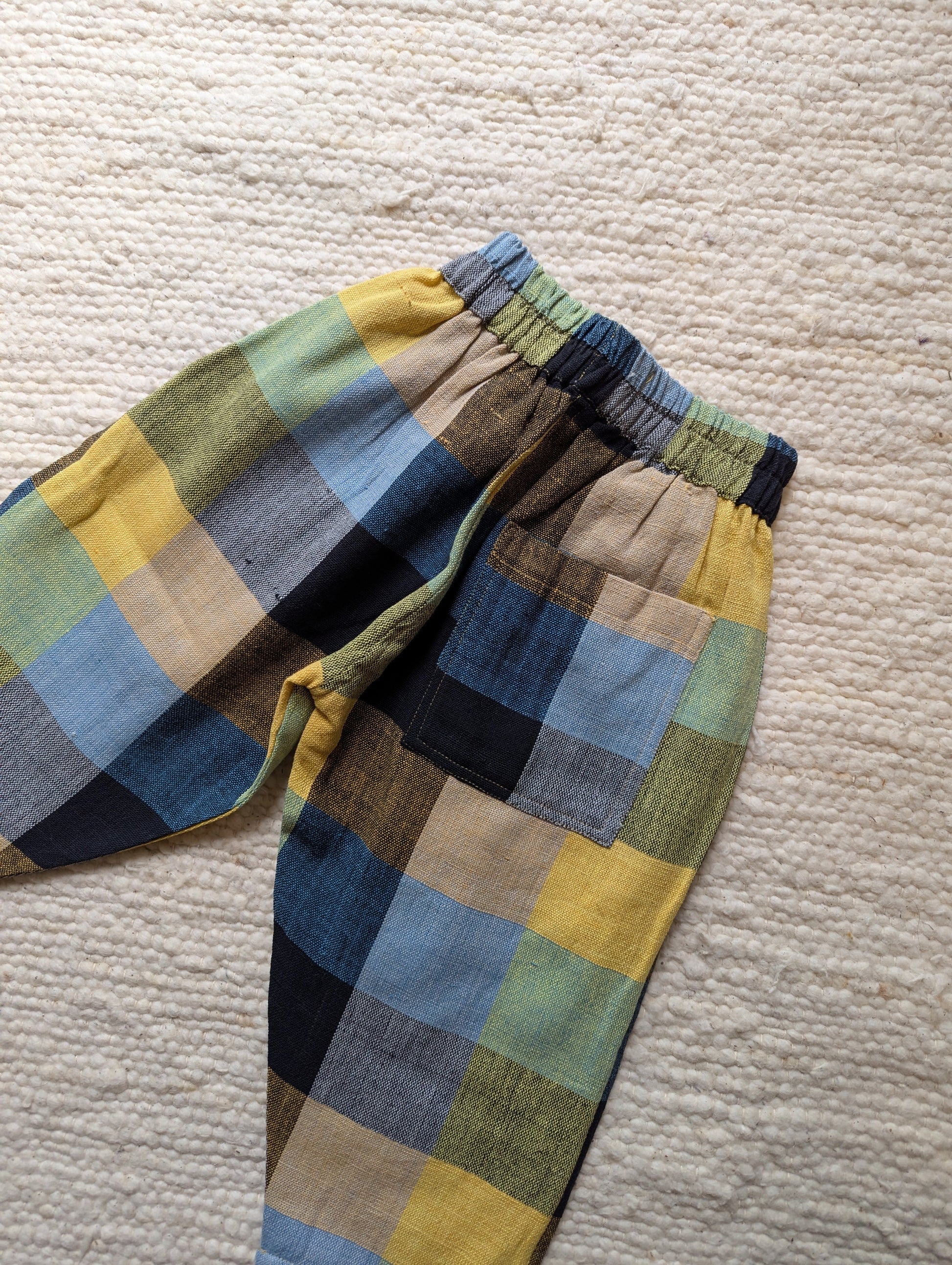 Handmade trousers in a striking mix of deep navy, soft sky blue, earthy green, and golden yellow.. lovely bold checks. The cotton is thick and durable, perfect for this weather. Designed to be roomy, allowing endless play and adventure. The trousers have elasticated waistbands, gently tapered legs, side pockets, and a back patch pocket for all the little treasures! We strive to give you quality, style and comfort in our trousers.
