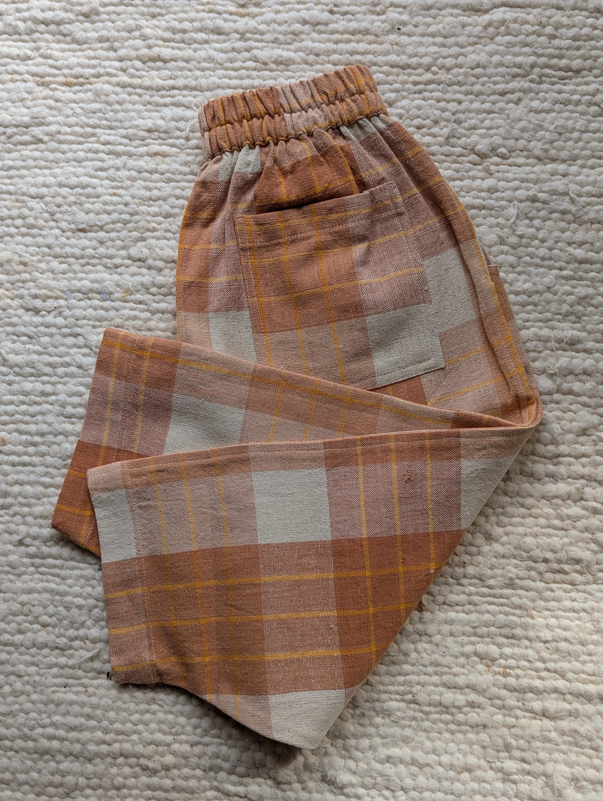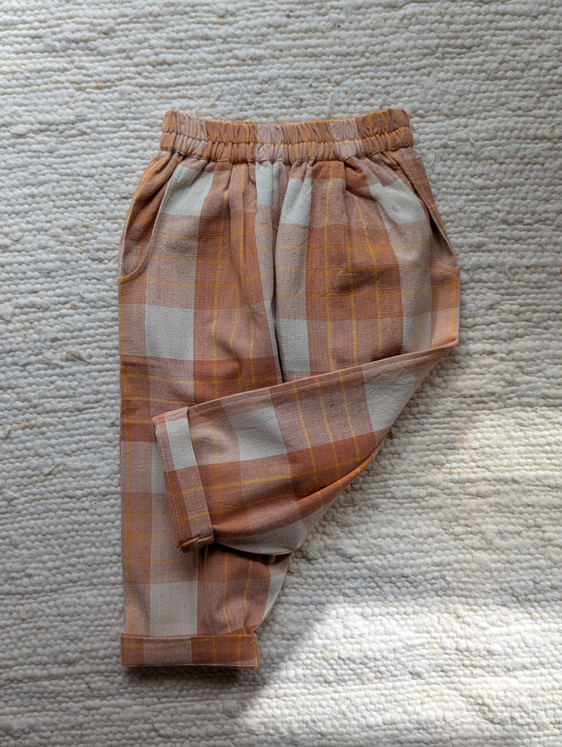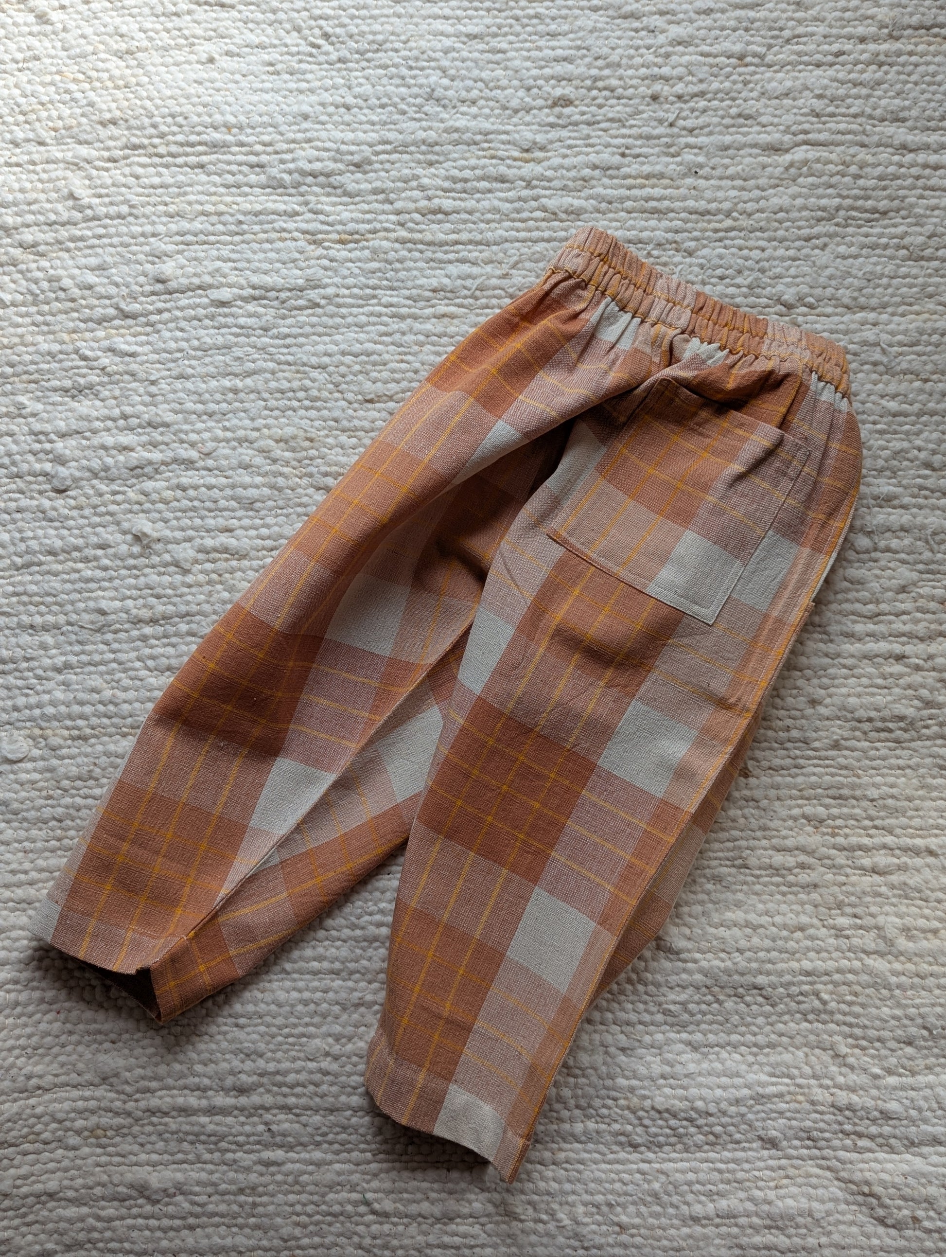 Handmade trousers in a warm harvest colours....checkered weave using brown, ecru and gold. The cotton is thick and durable, perfect for this weather. Designed to be roomy, allowing endless play and adventure. The trousers have elasticated waistbands, gently tapered legs, side pockets, and a back patch pocket for all the little treasures! We strive to give you quality, style and comfort in our trousers.