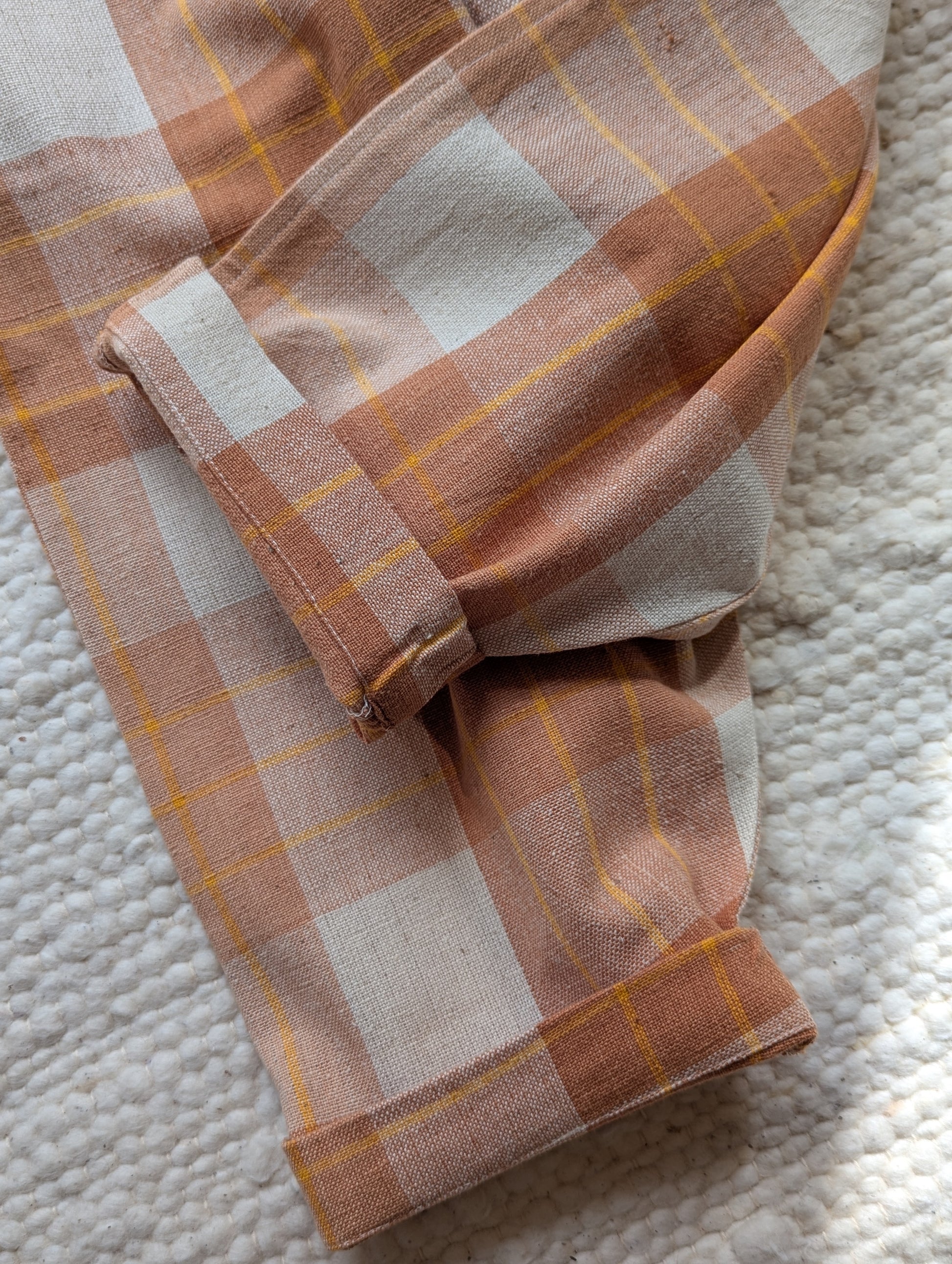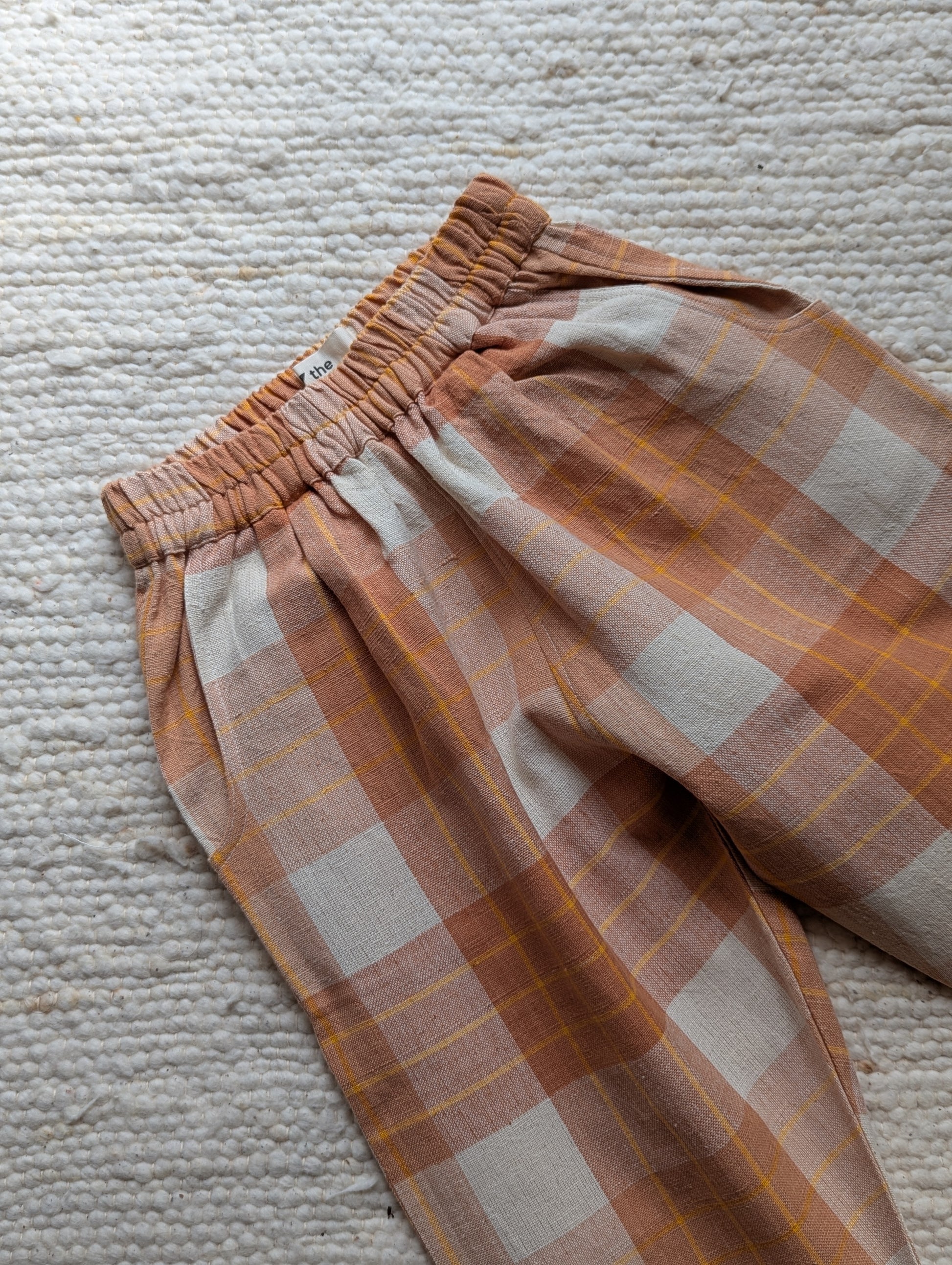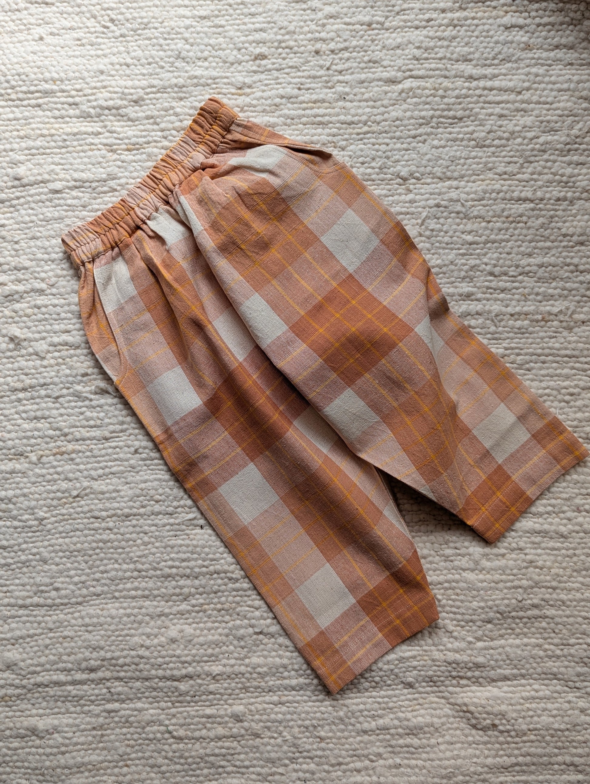 Handmade trousers in a warm harvest colours....checkered weave using brown, ecru and gold. The cotton is thick and durable, perfect for this weather. Designed to be roomy, allowing endless play and adventure. The trousers have elasticated waistbands, gently tapered legs, side pockets, and a back patch pocket for all the little treasures! We strive to give you quality, style and comfort in our trousers.