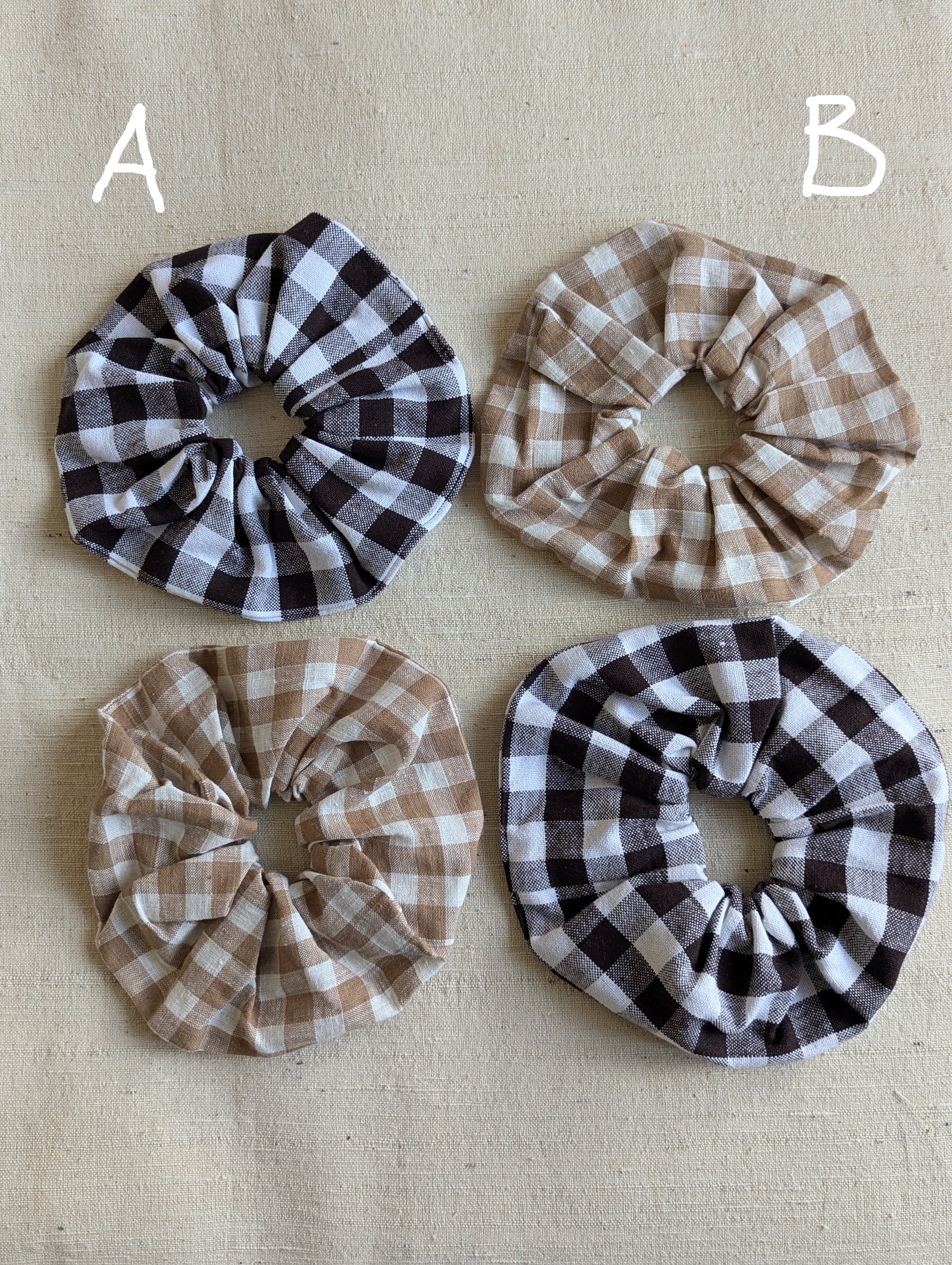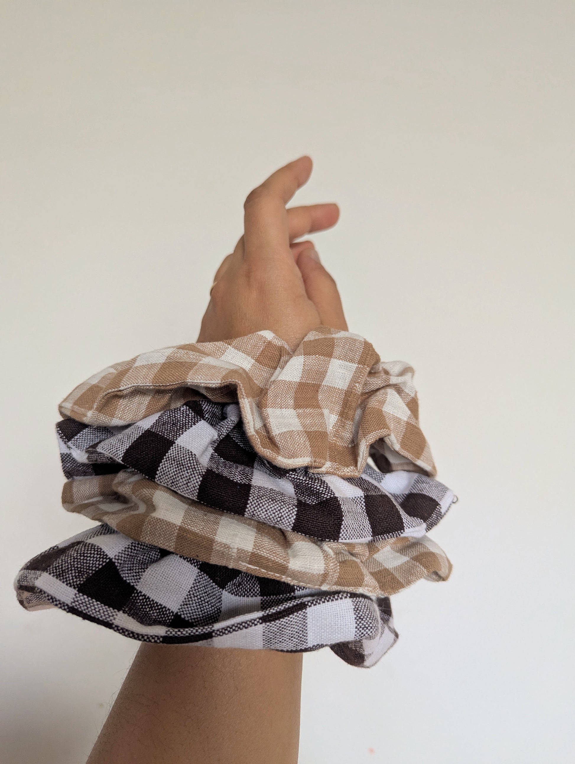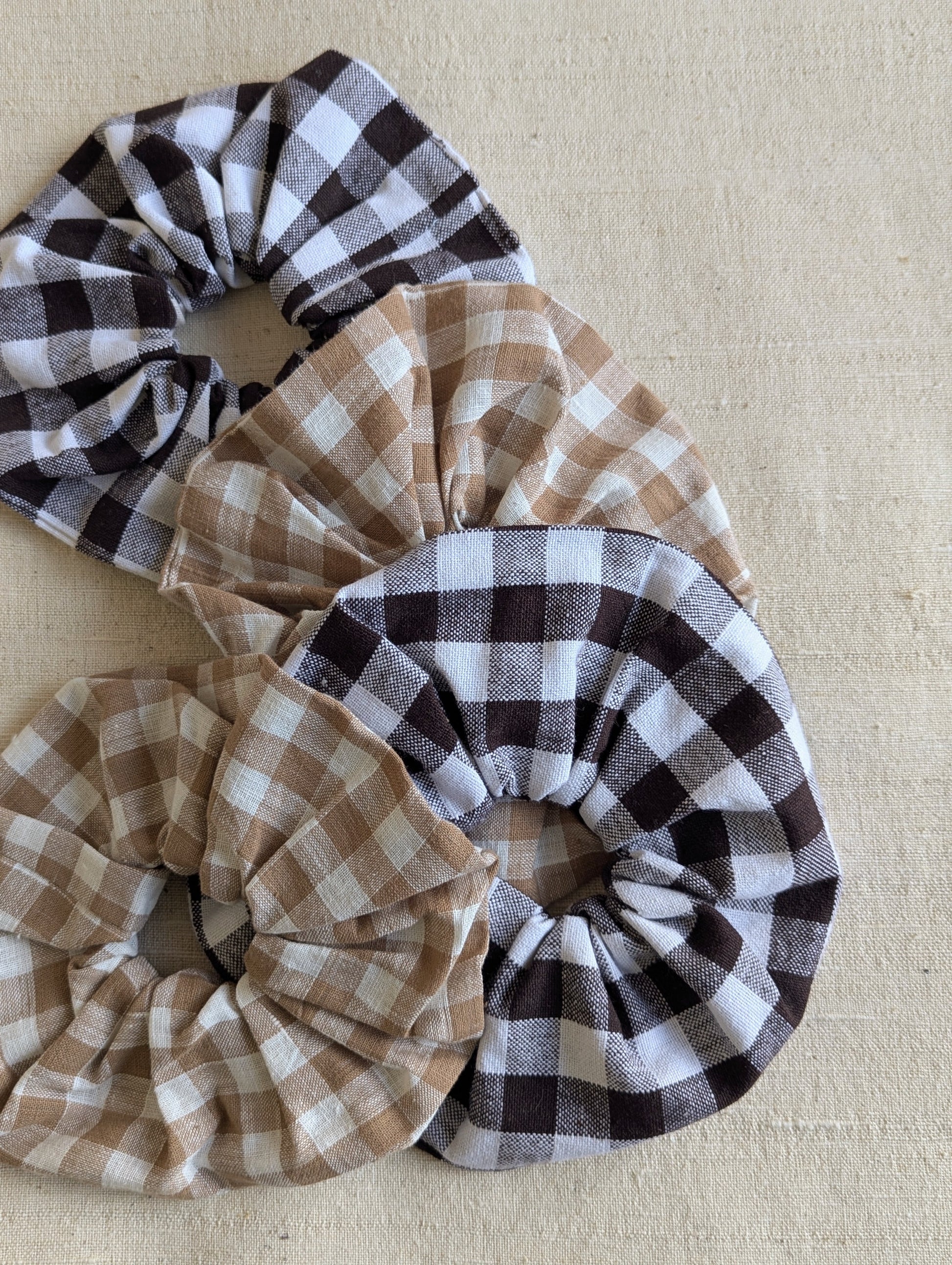 Handloom cotton large scrunchies in 2 shades of brown gingham. Please select the one you like from the options available.
