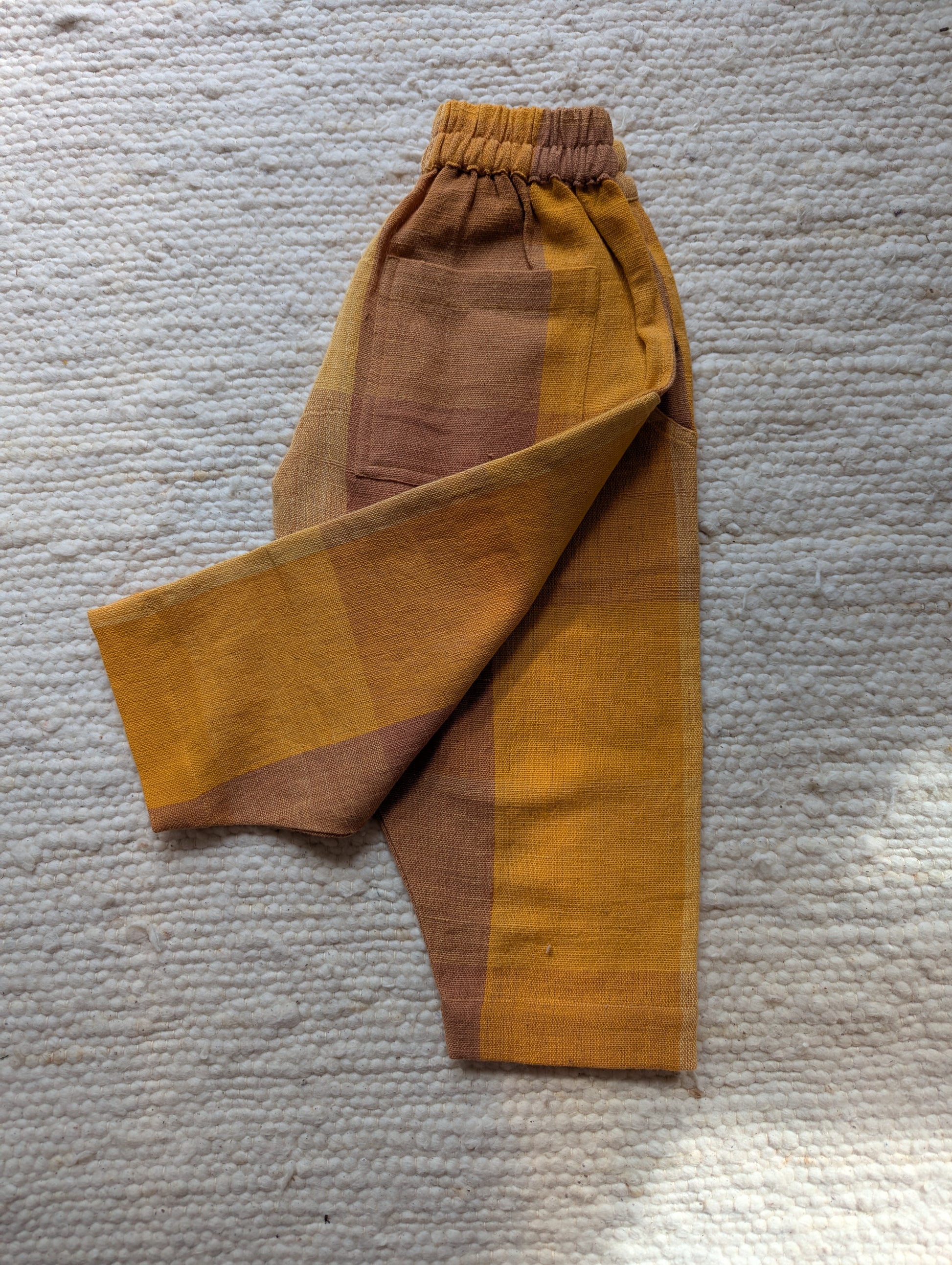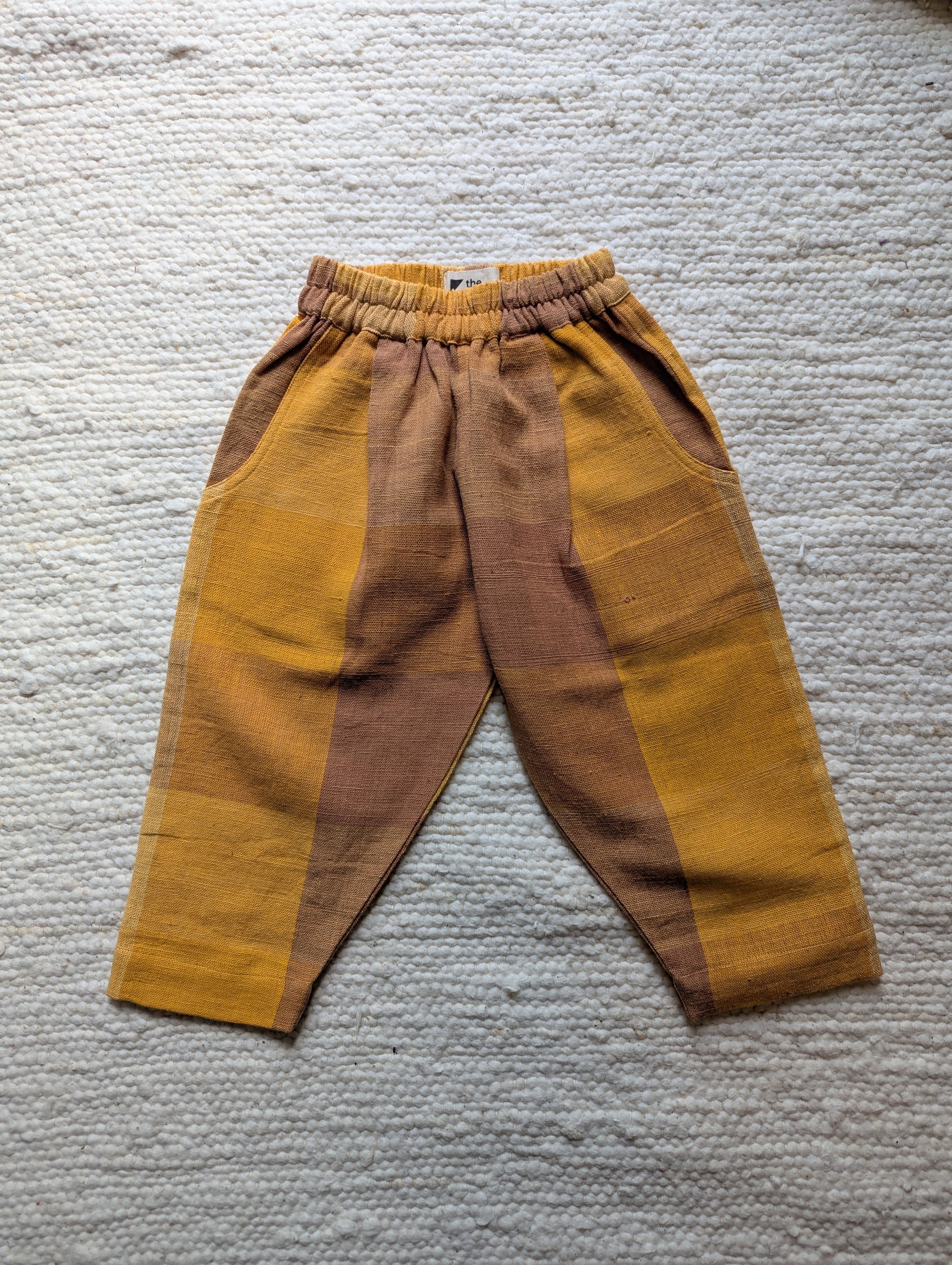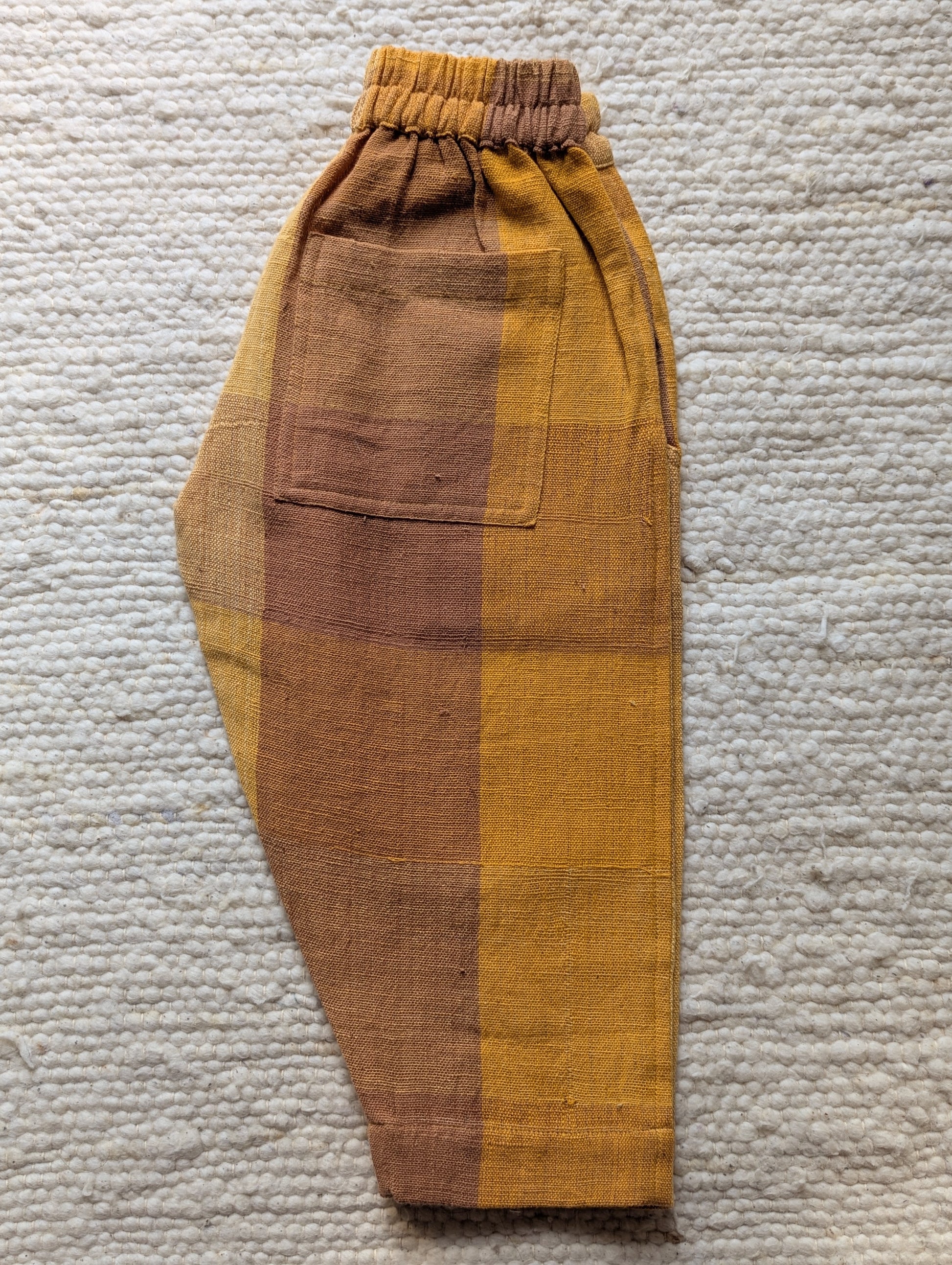 Beautiful warm rich mustard and browns woven pattern. The cotton is thick and durable, perfect for this weather. Designed to be roomy, allowing endless play and adventure. The trousers have elasticated waistbands, gently tapered legs, side pockets, and a back patch pocket for all the little treasures! We strive to give you quality, style and comfort in our trousers.