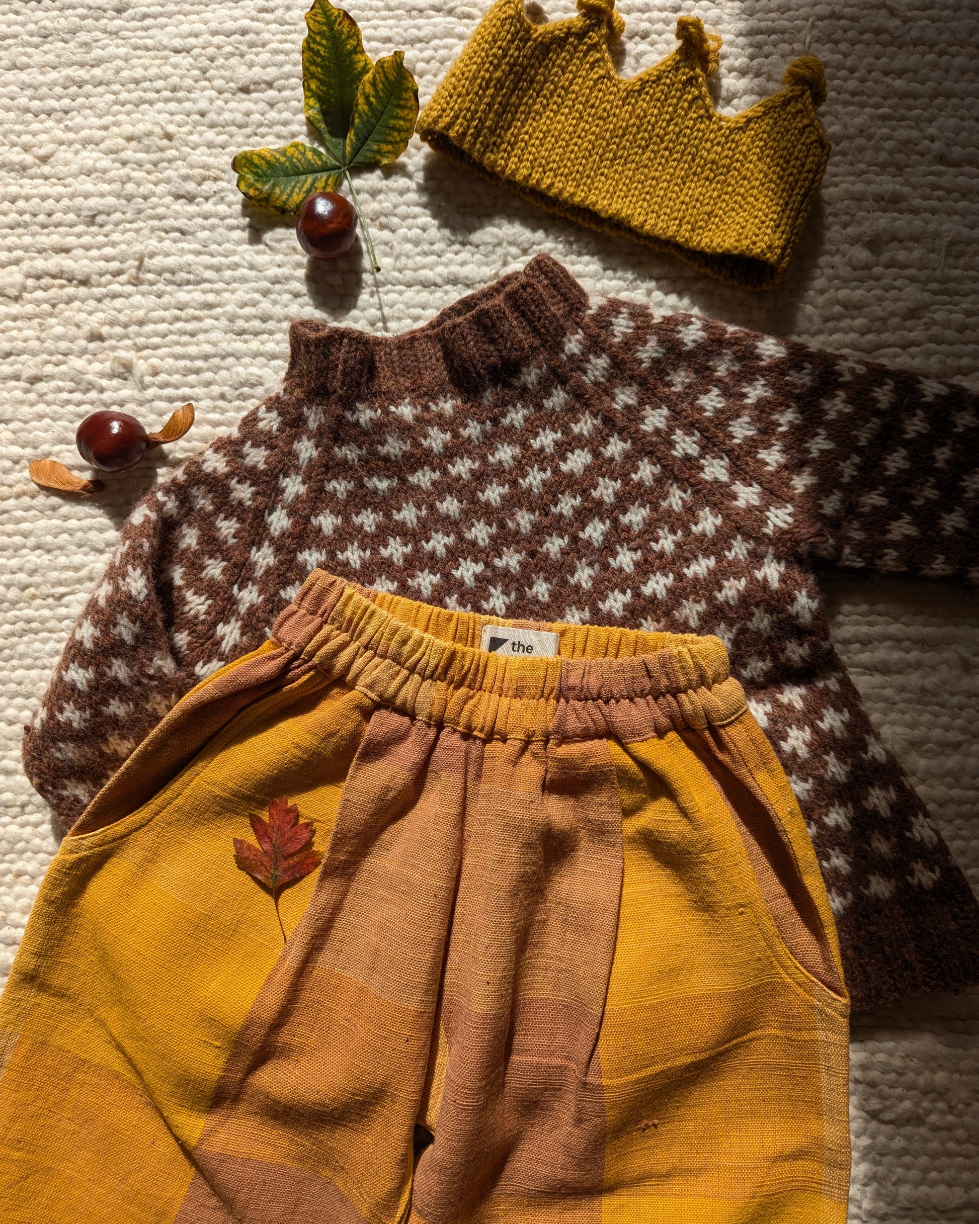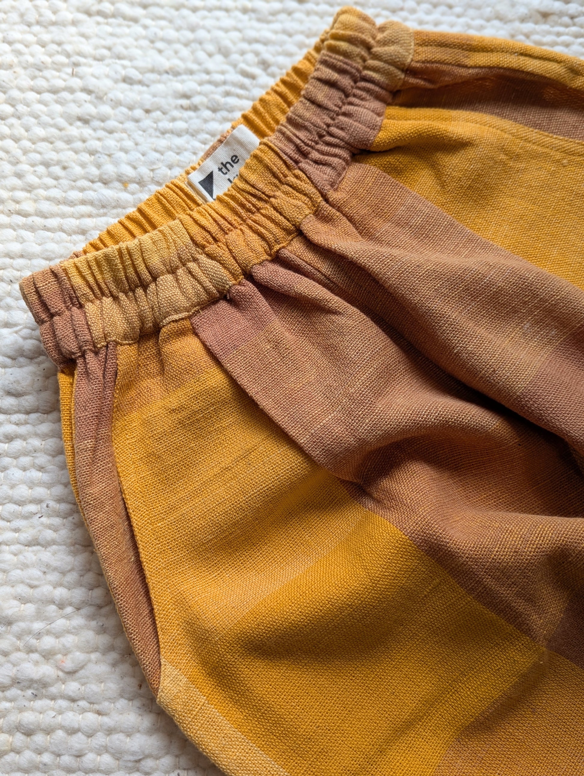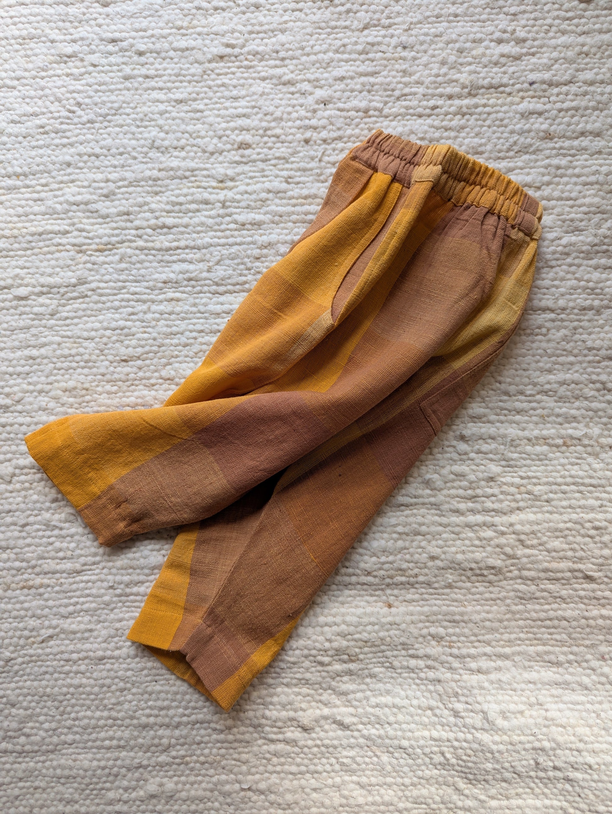 Beautiful warm rich mustard and browns woven pattern. The cotton is thick and durable, perfect for this weather. Designed to be roomy, allowing endless play and adventure. The trousers have elasticated waistbands, gently tapered legs, side pockets, and a back patch pocket for all the little treasures! We strive to give you quality, style and comfort in our trousers.