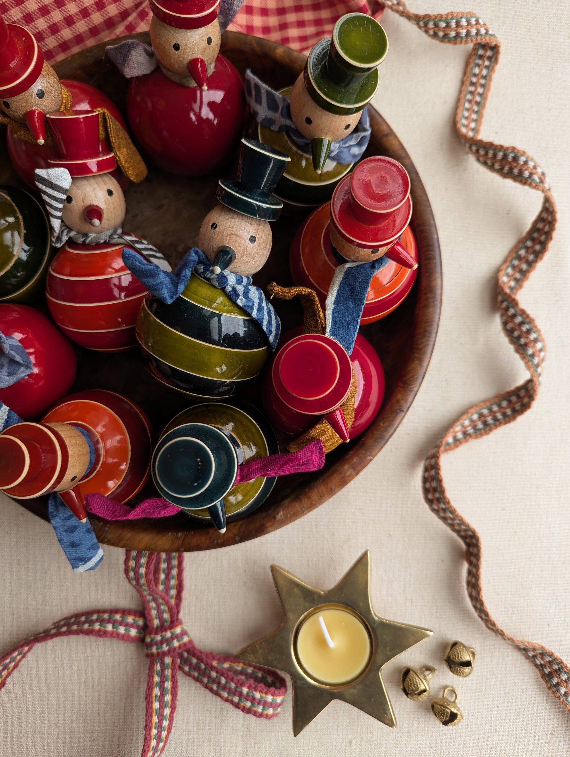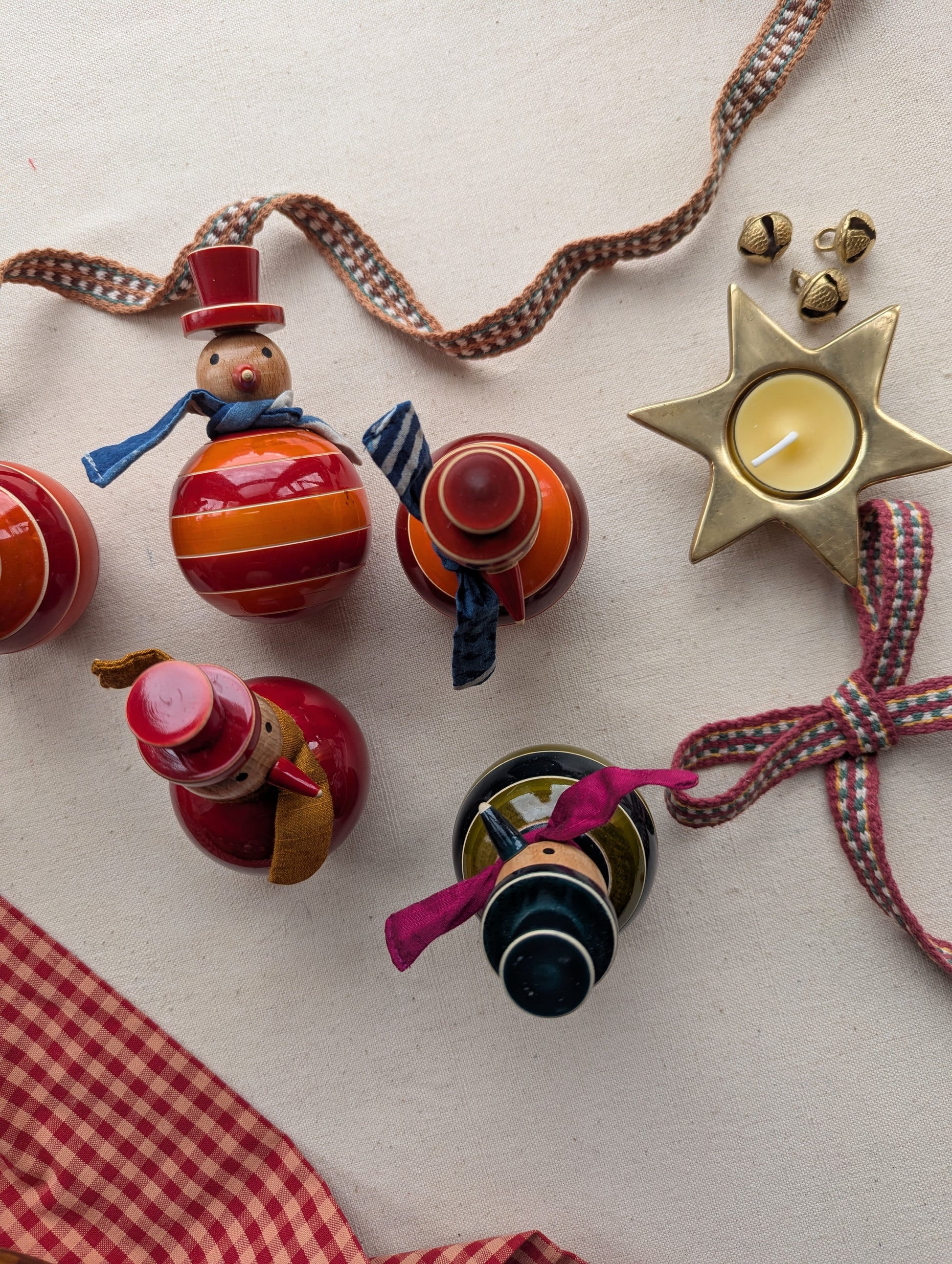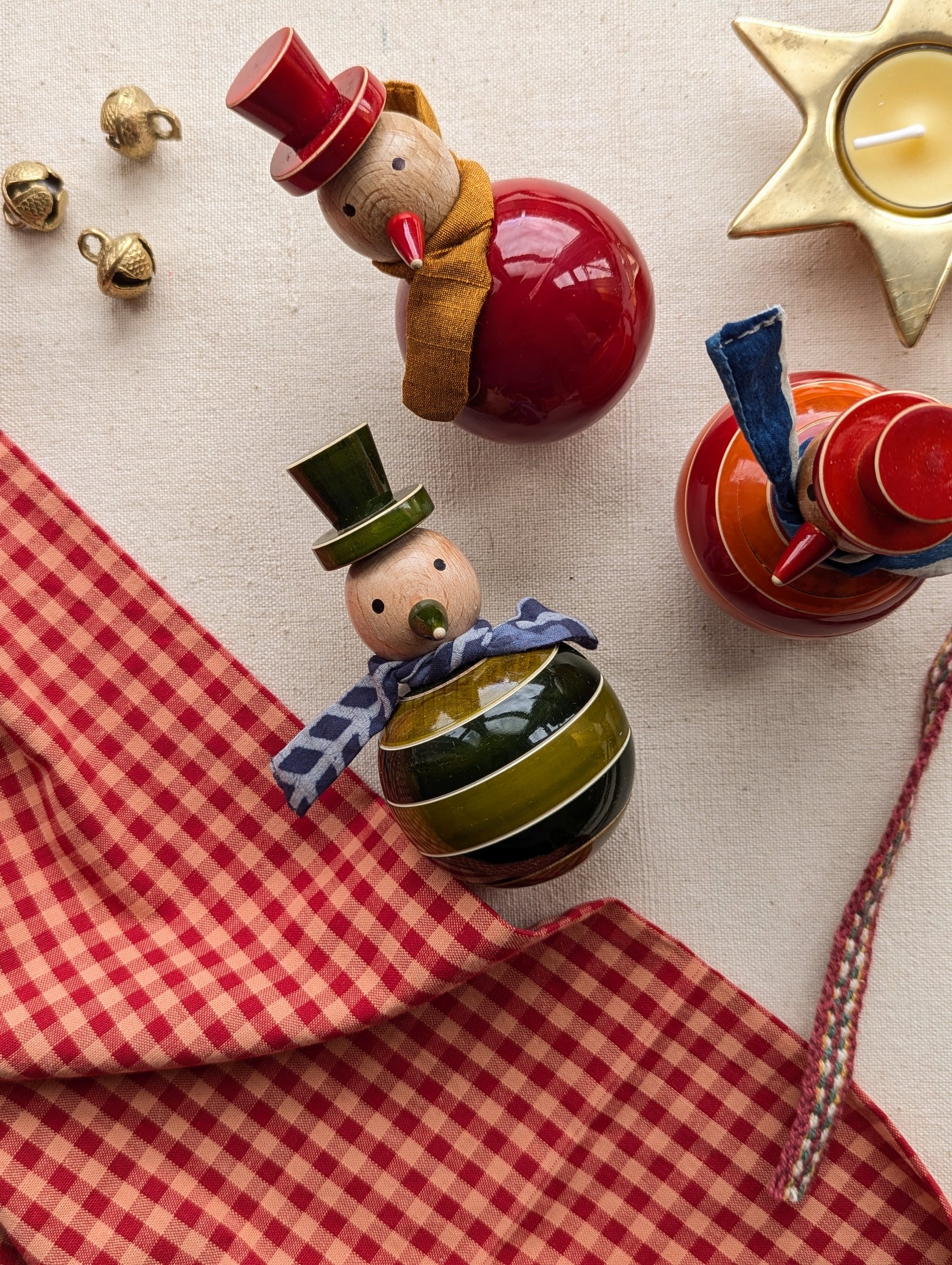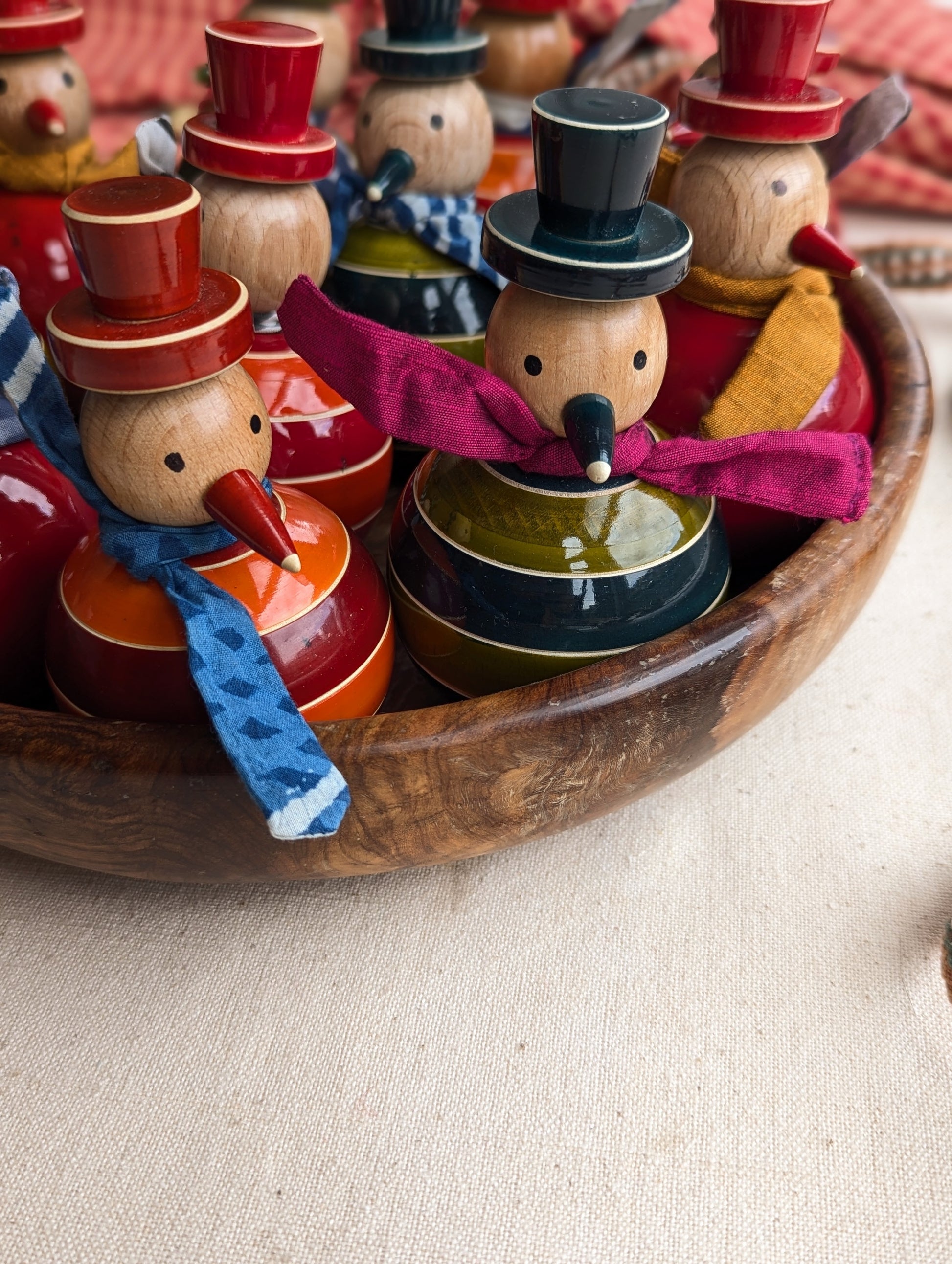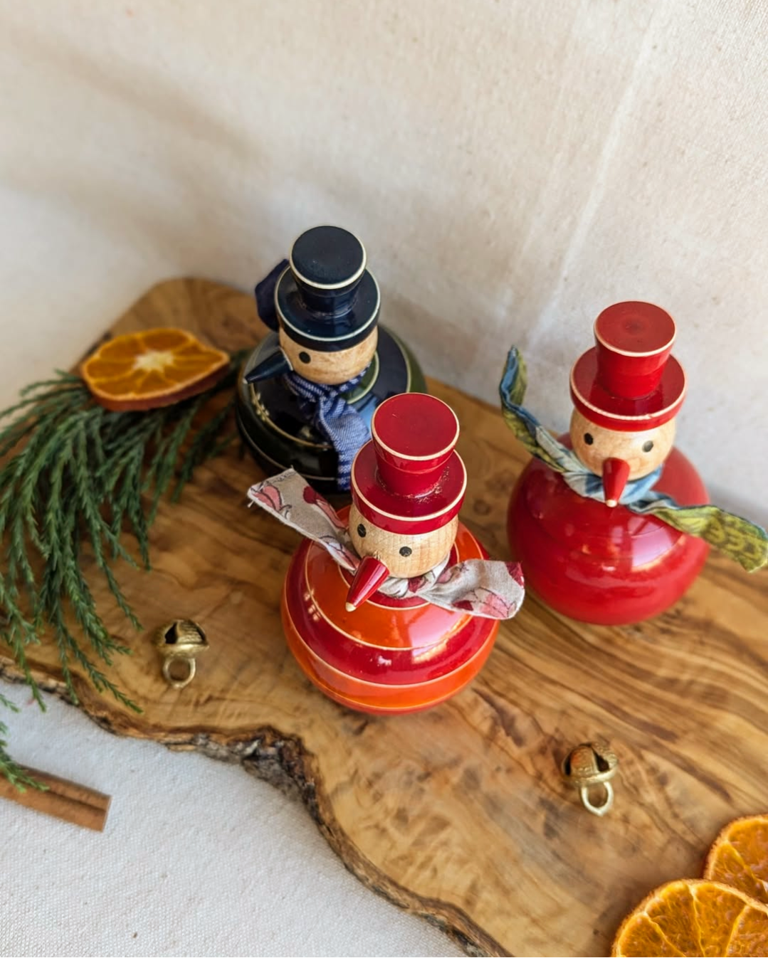 Adorable little dancing wobbly snowmen, each wearing a beautiful hand stitched scarf! Look lovely dancing away on a shelf. A sweet handmade present :) or add to your festive decor.