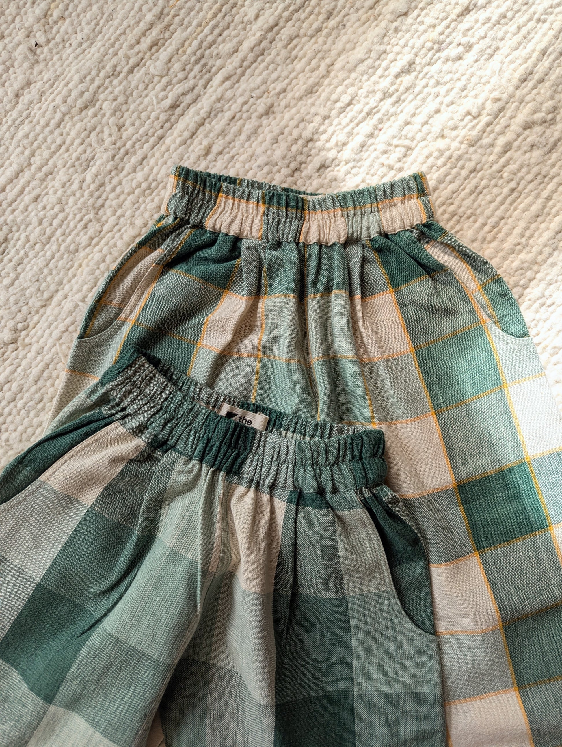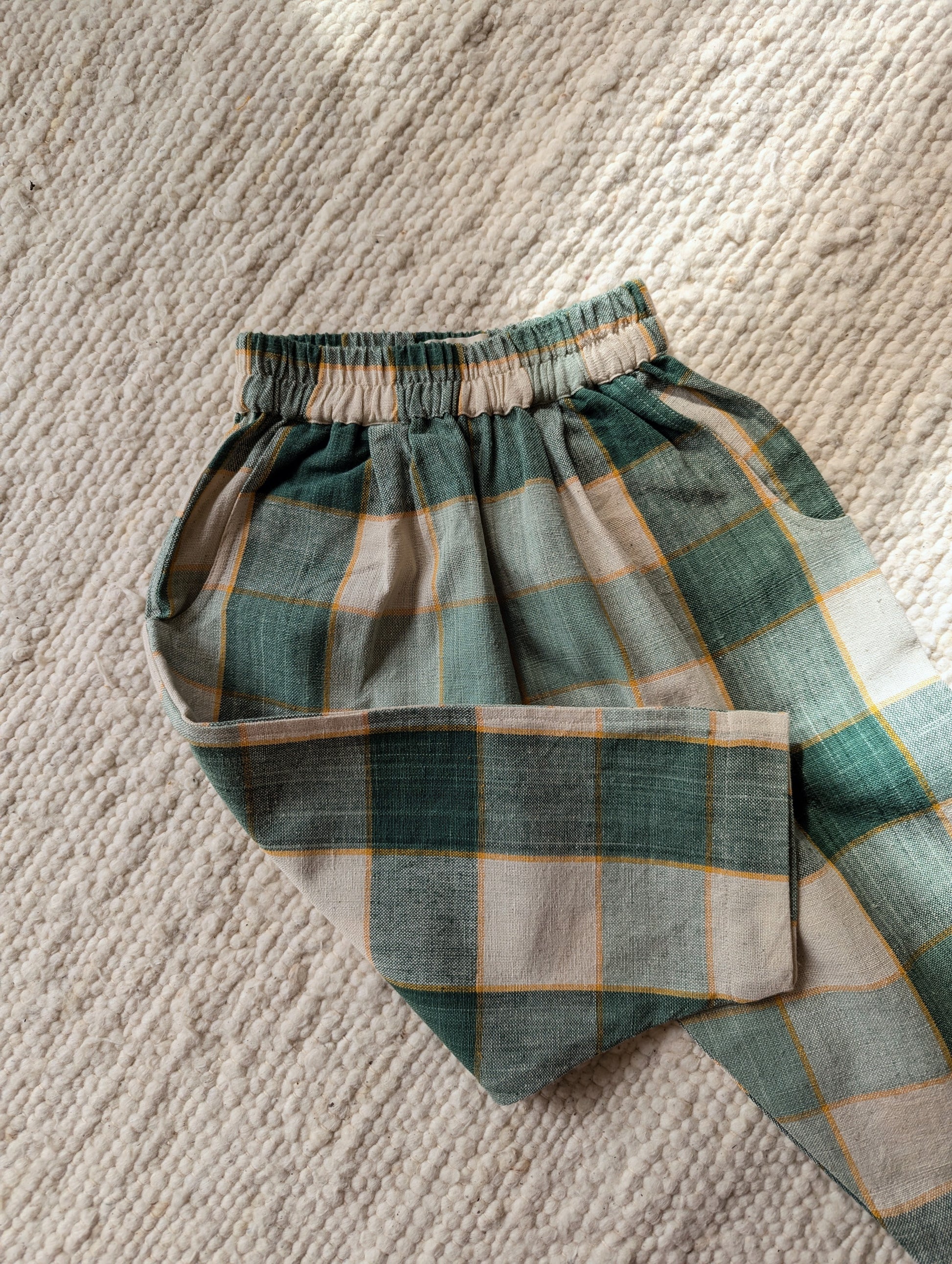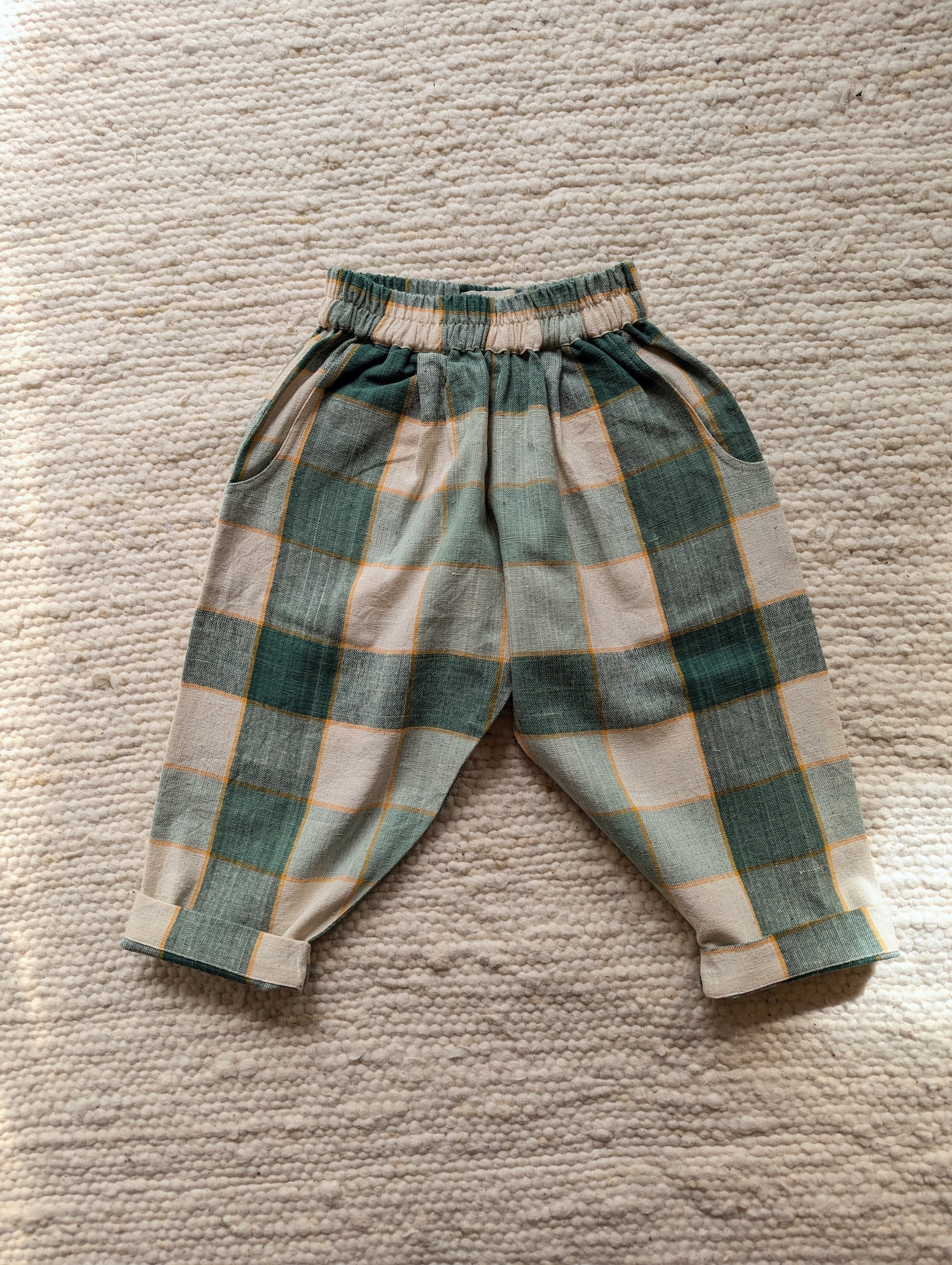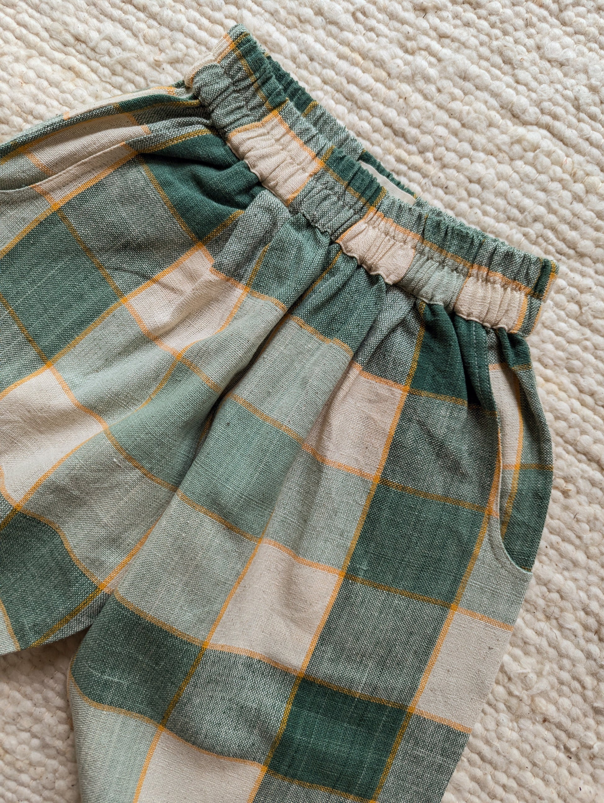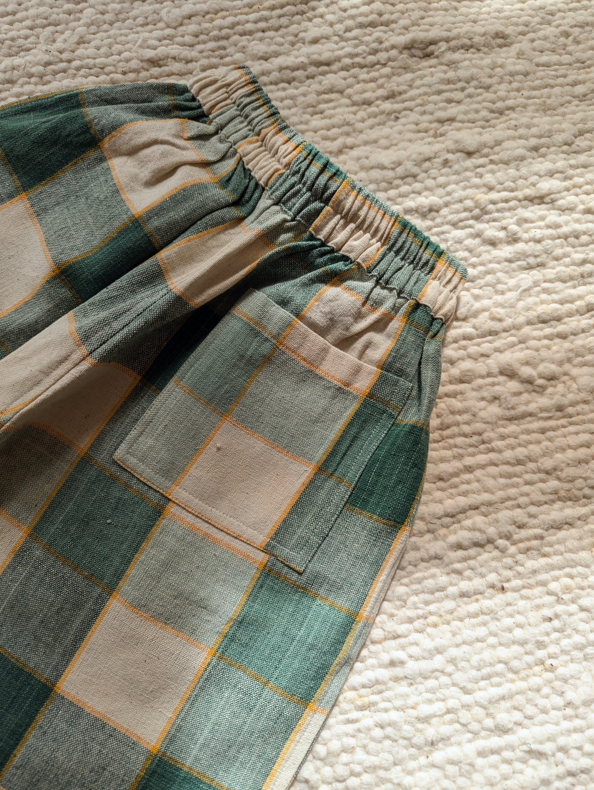 Handmade trousers in a beautiful pine green and warm ecru check with a hint of honey gold. The cotton is thick and durable, perfect for this weather. Designed to be roomy, allowing endless play and adventure. The trousers have elasticated waistbands, gently tapered legs, side pockets, and a back patch pocket for all the little treasures! We strive to give you quality, style and comfort in our trousers.