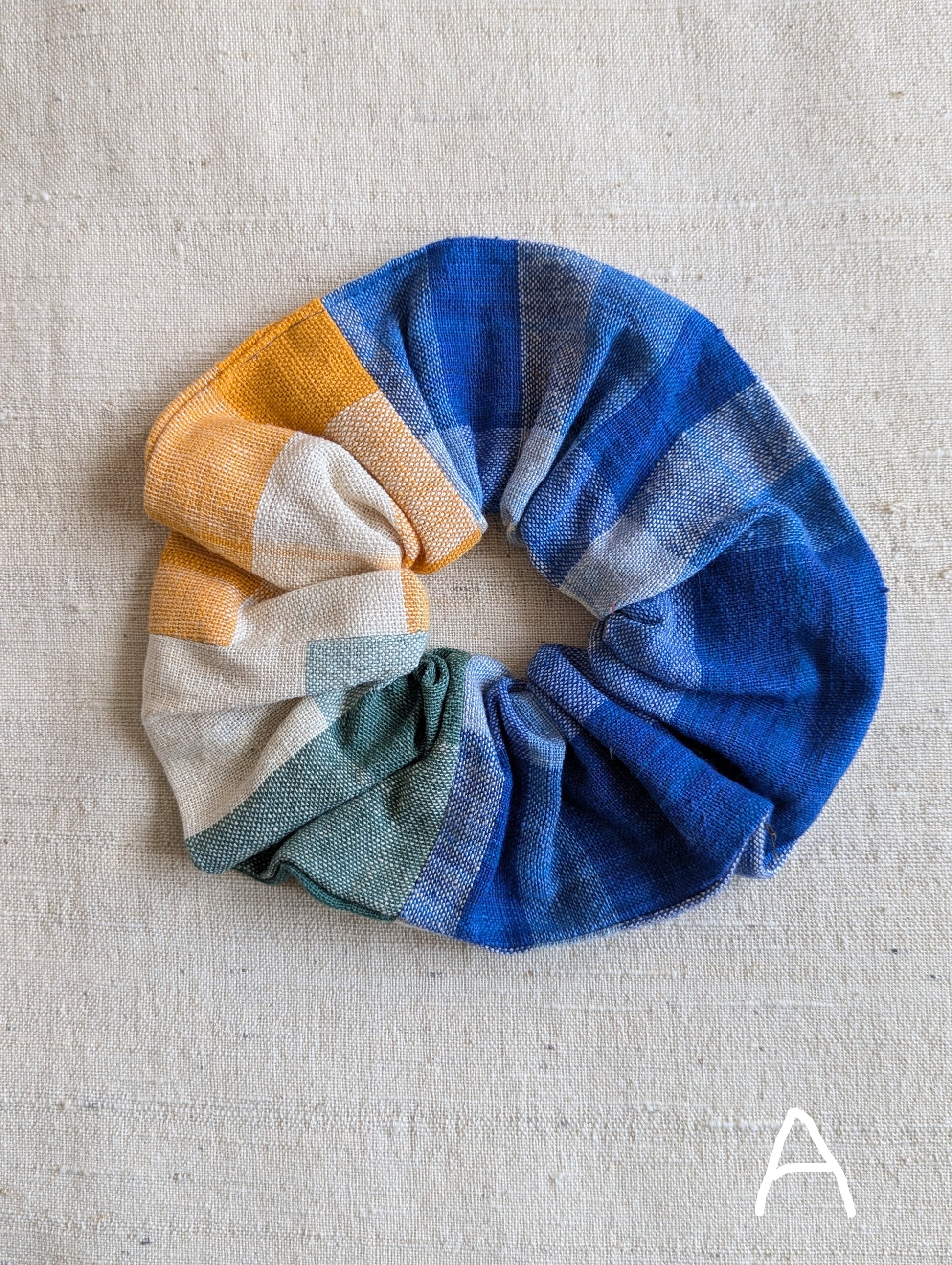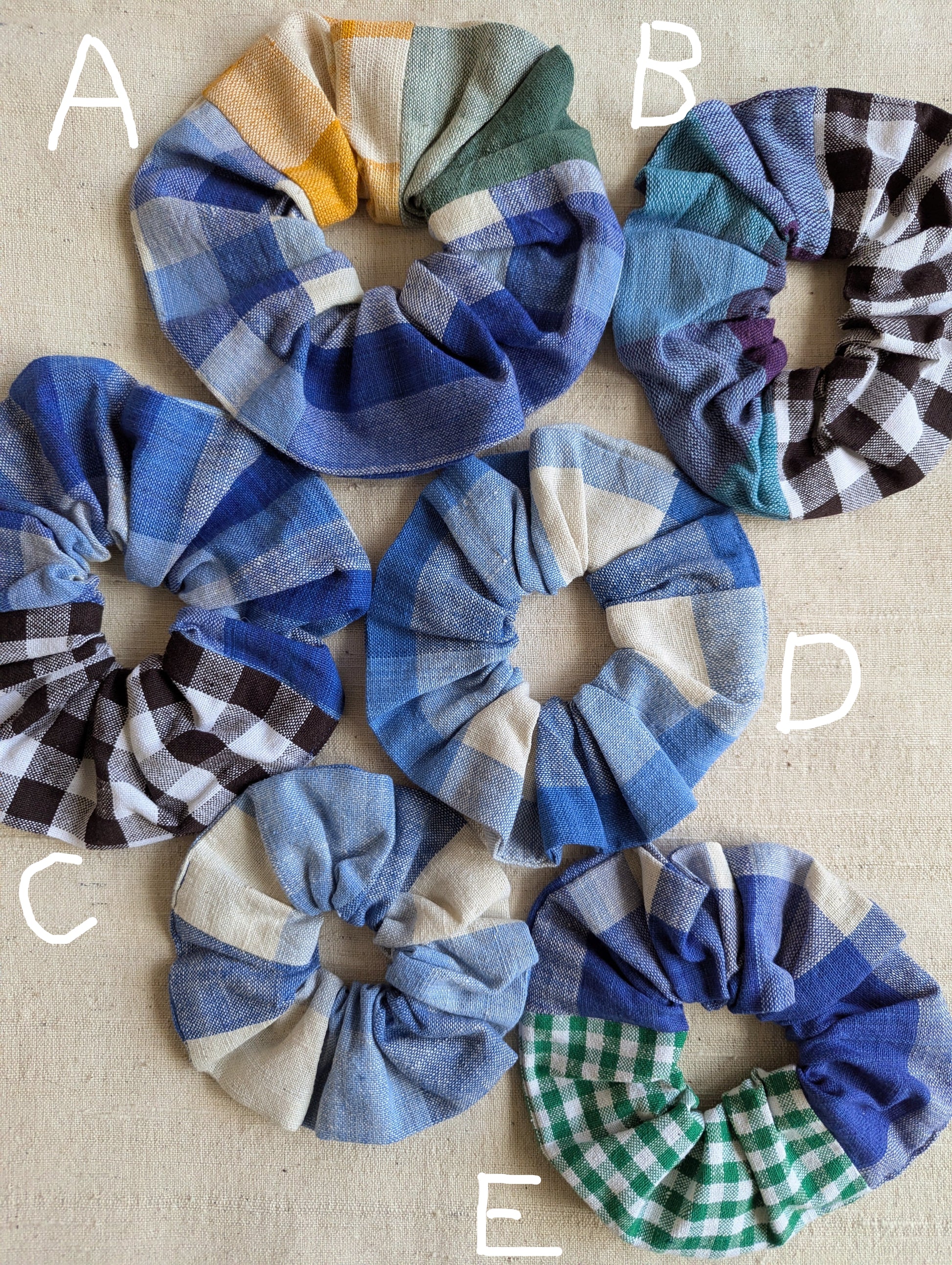 Nothing goes to waste here....We have used every bit of our off cuts and remnant handwoven cotton fabrics from the trousers. All scrunchies are handmade in the UK by lovely Rox from YOUNG DOUBLE. A gorgeous mix of colour and pattern...making every piece unique!