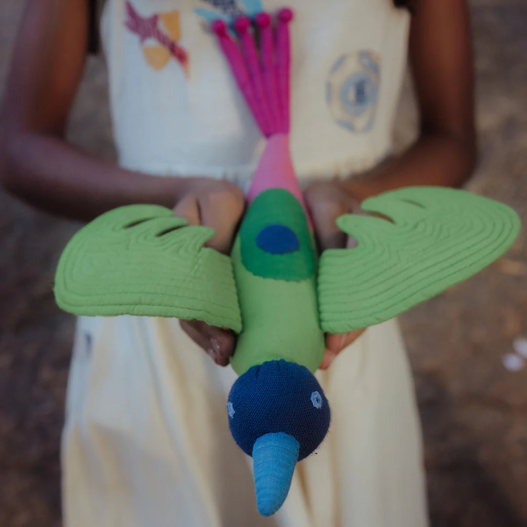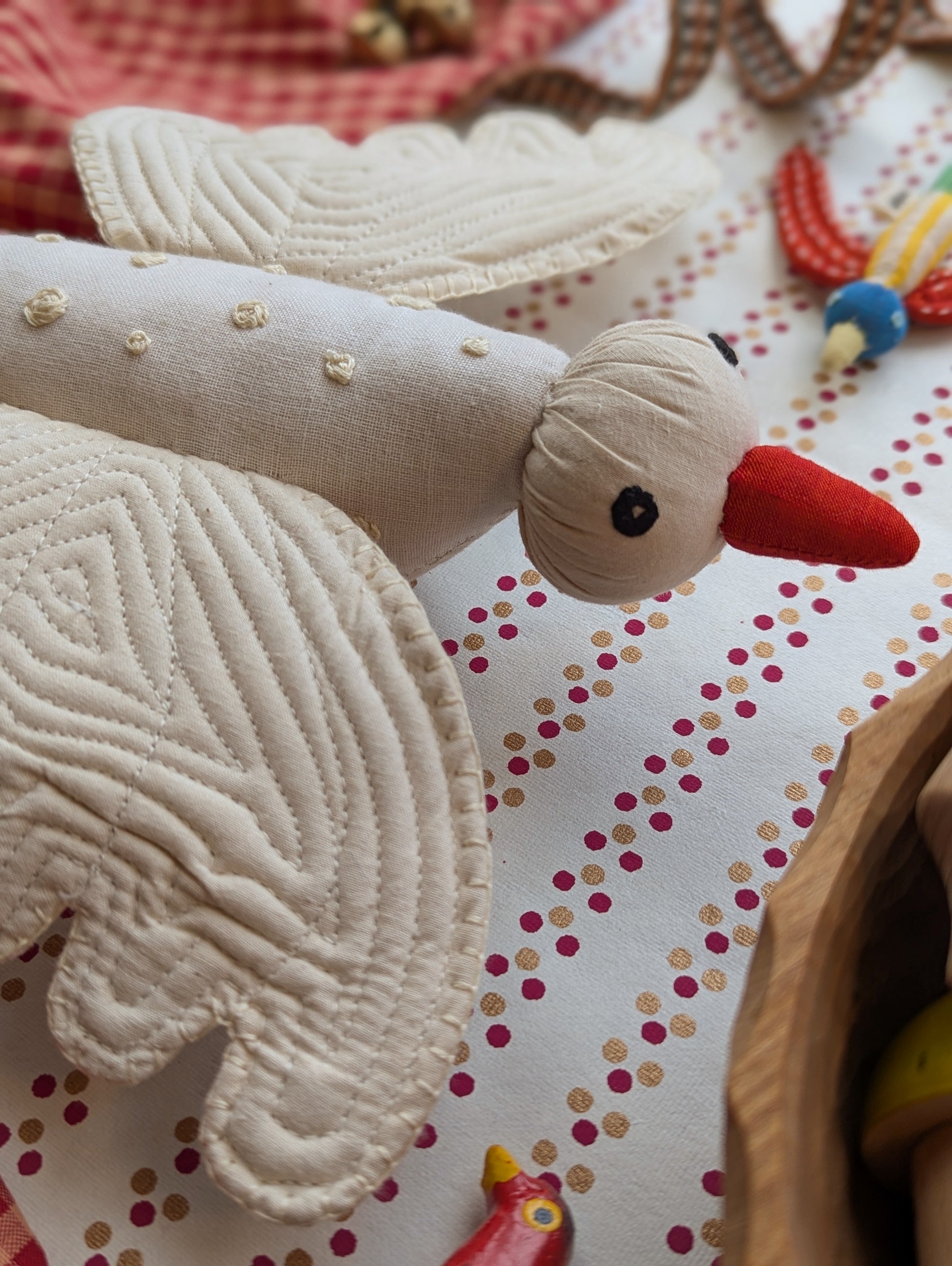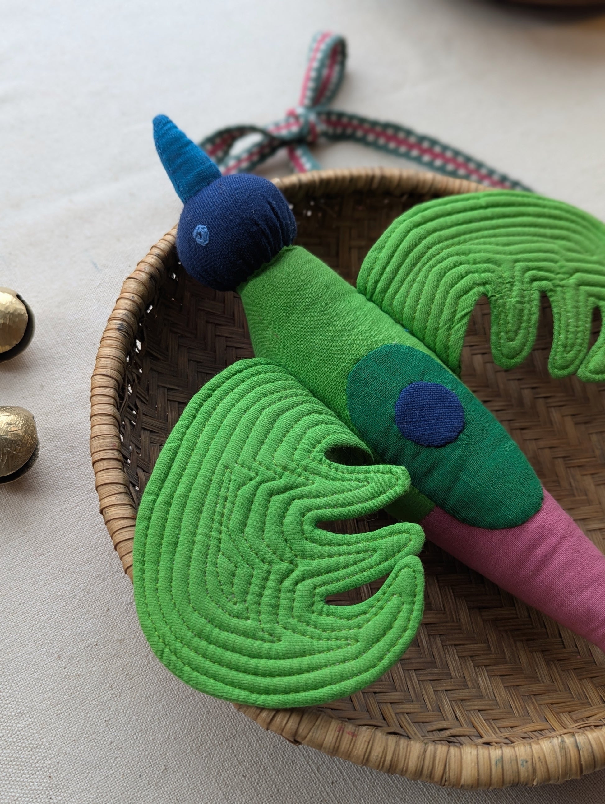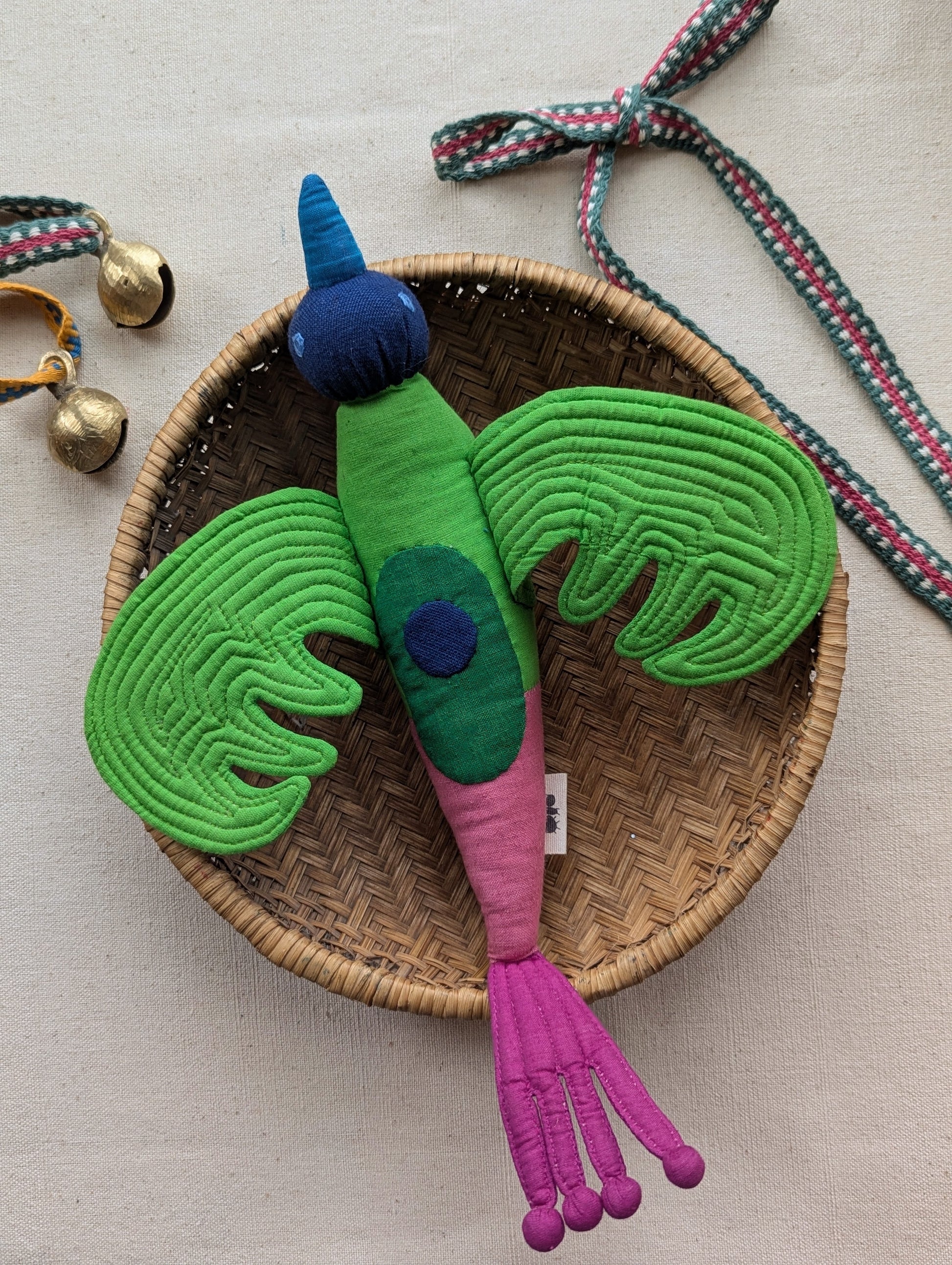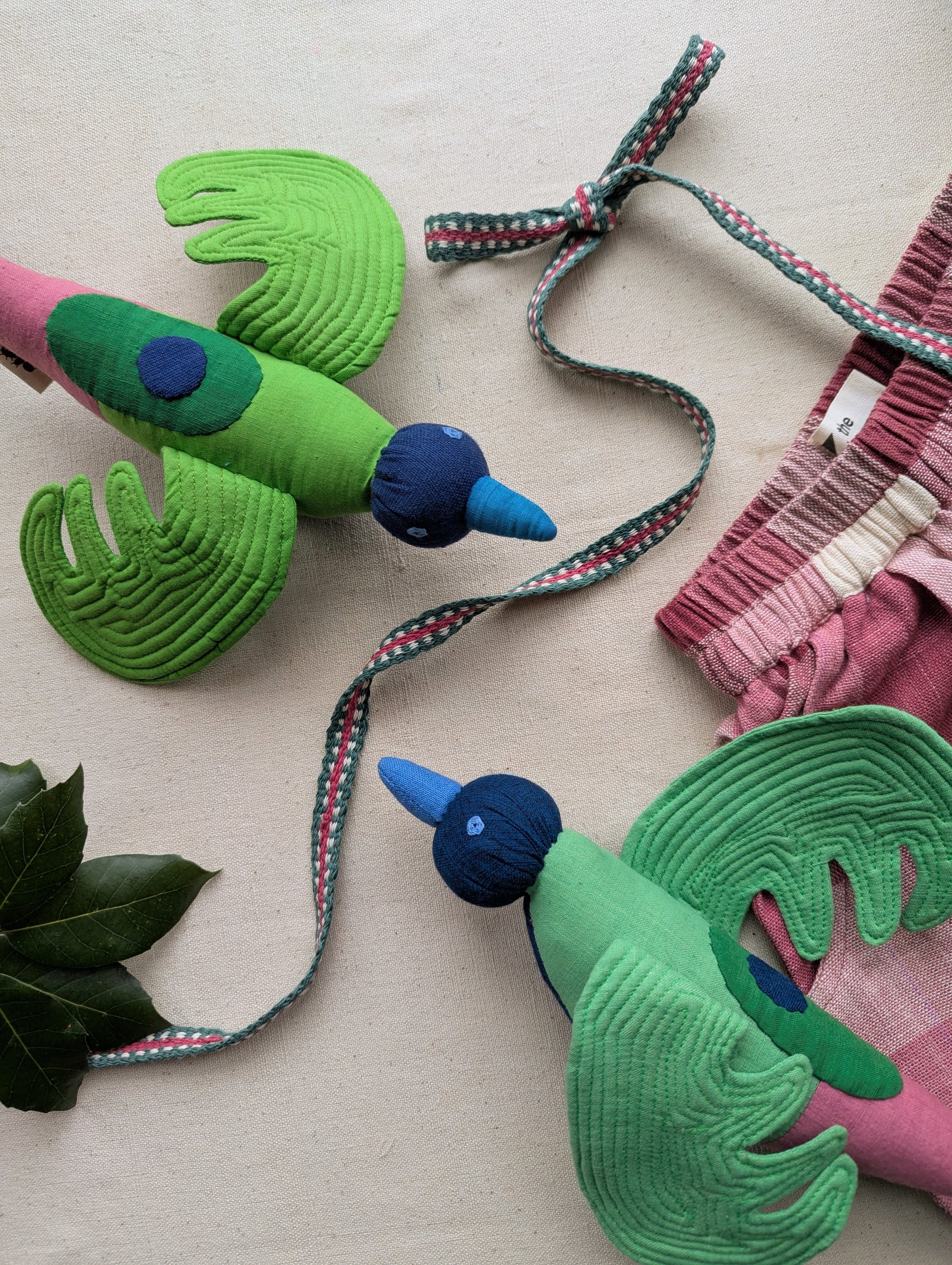These beautiful birds (Pancchis) dot the horizon, with beaks like flying chillies & wings like hibiscus petals and songs of many lands. They take roost in the world of children as this textile toy. The handmade Panchhi toy is crafted by master artisans, with delightful textures on the wings & a bright beak. It is the perfect companion to soar into a world of make-believe.