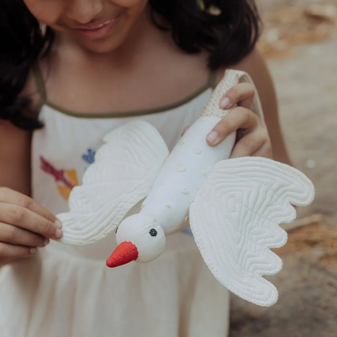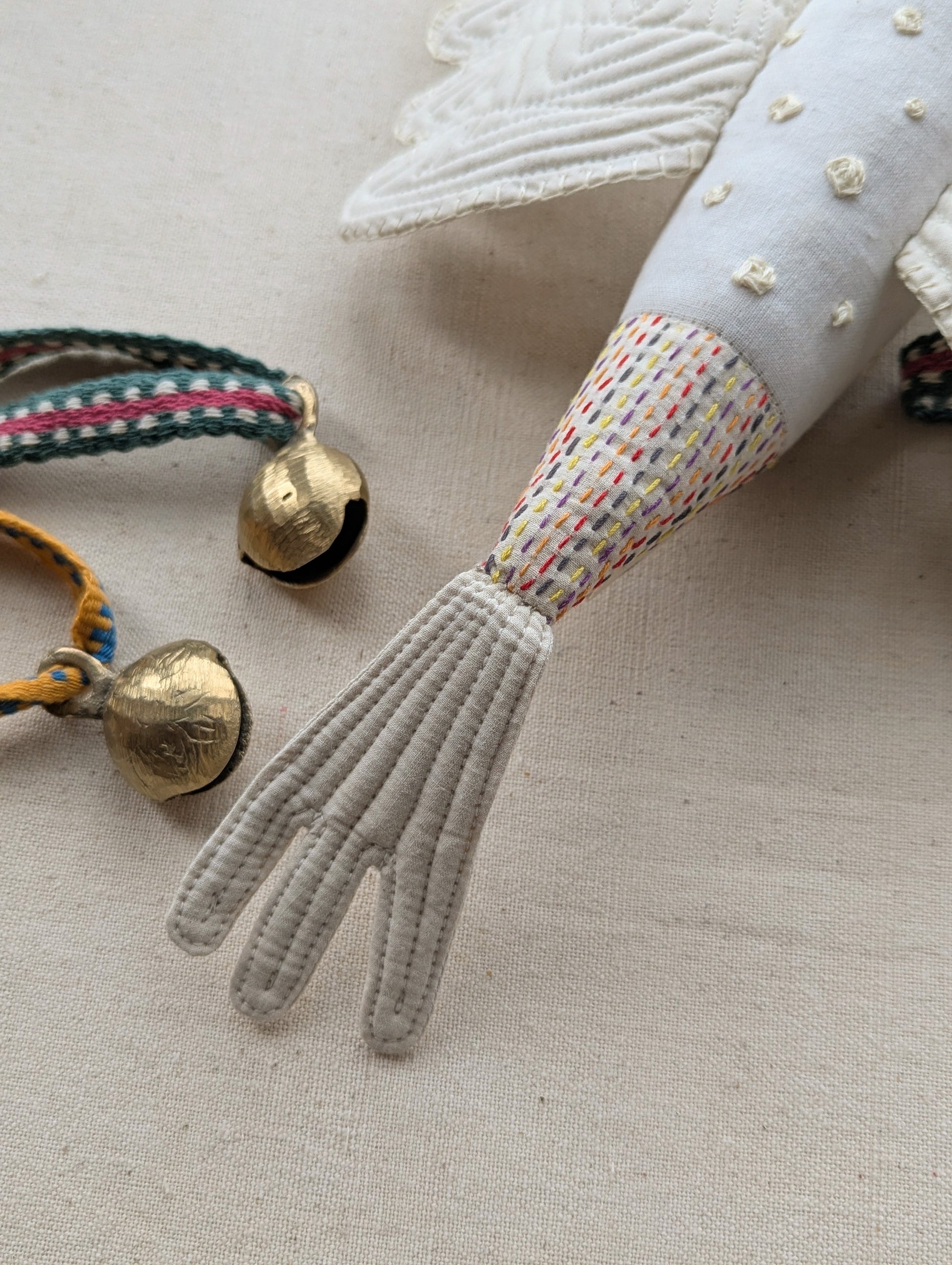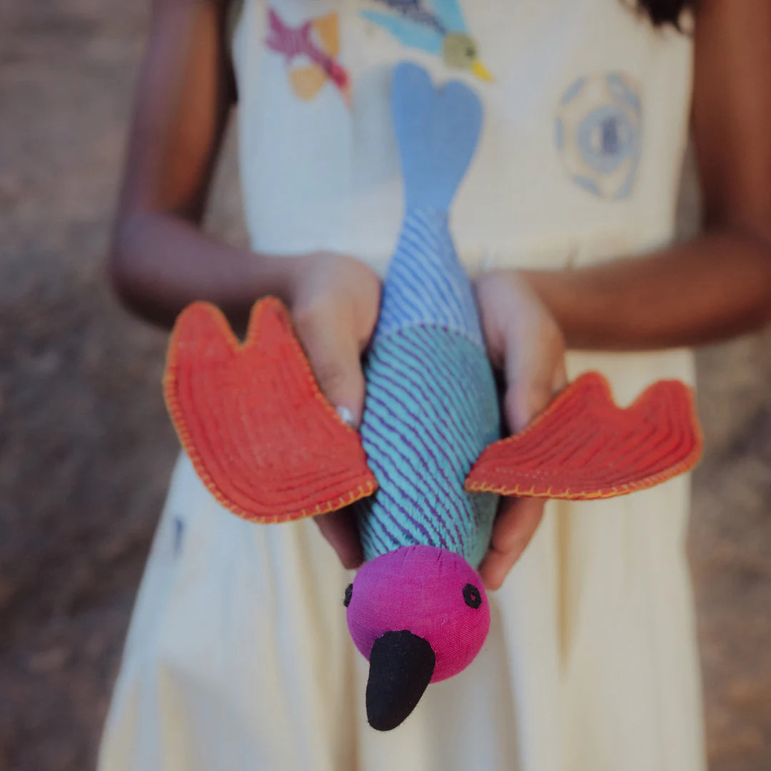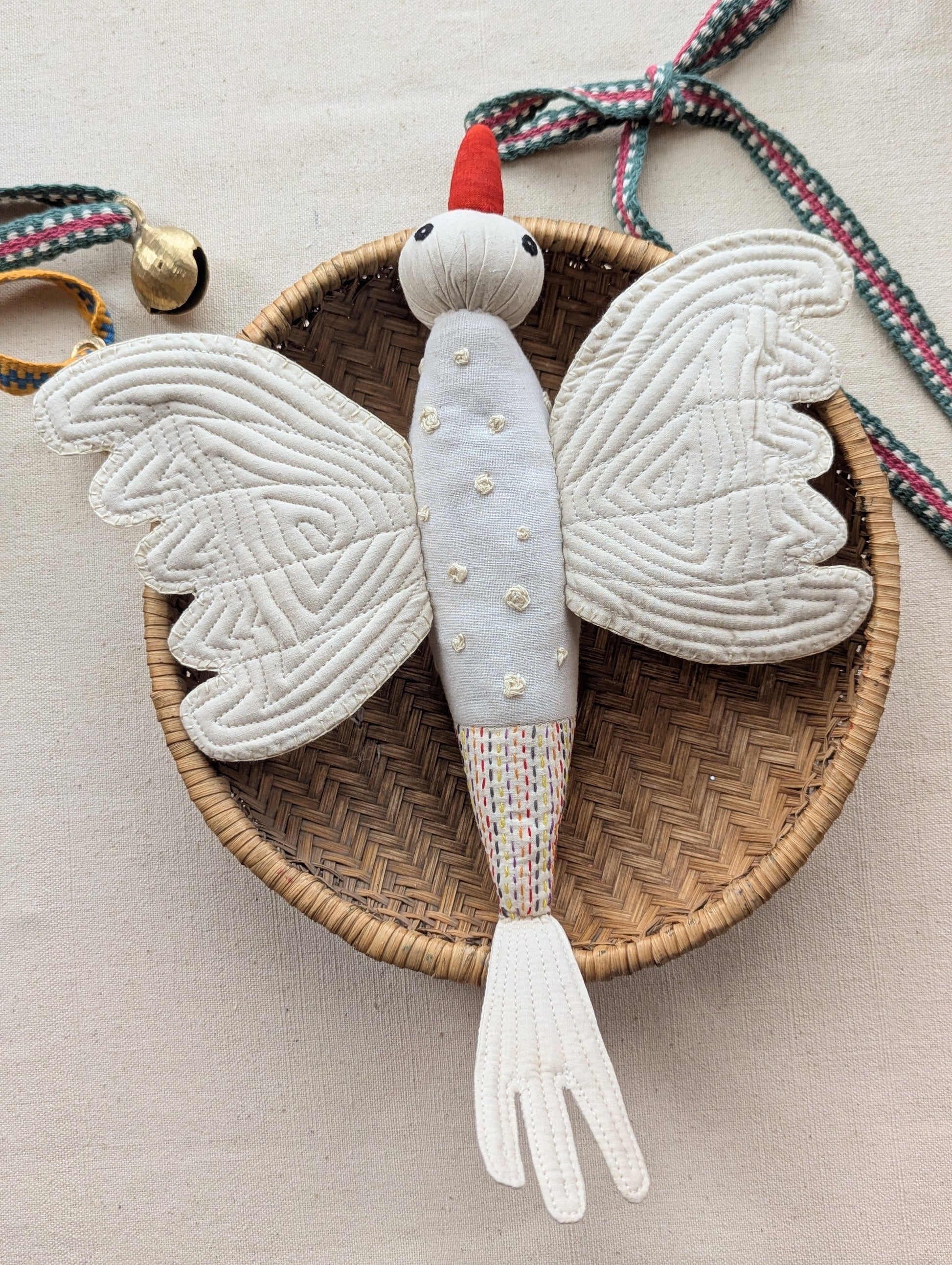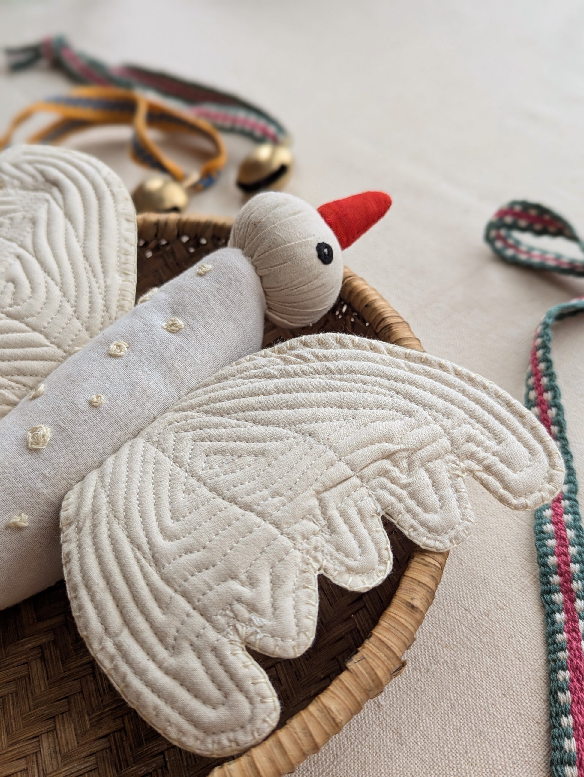 These beautiful birds (Pancchis) dot the horizon, with beaks like flying chillies & wings like hibiscus petals and songs of many lands. They take roost in the world of children as this textile toy. The handmade Panchhi toy is crafted by master artisans, with delightful textures on the wings & a bright beak. It is the perfect companion to soar into a world of make-believe.