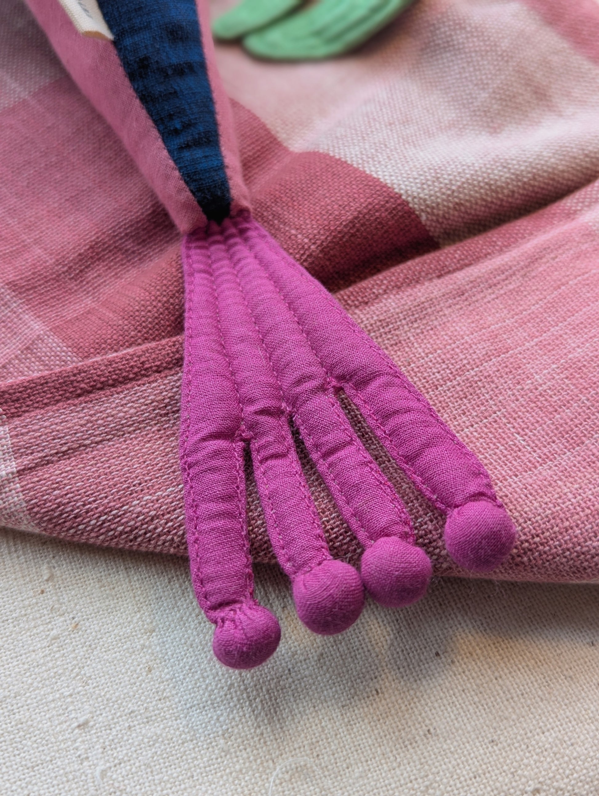 Made with 100% handloom cotton. Can be machine/hand wash cold, on gentle cycle. Not for children under 3 years old.
