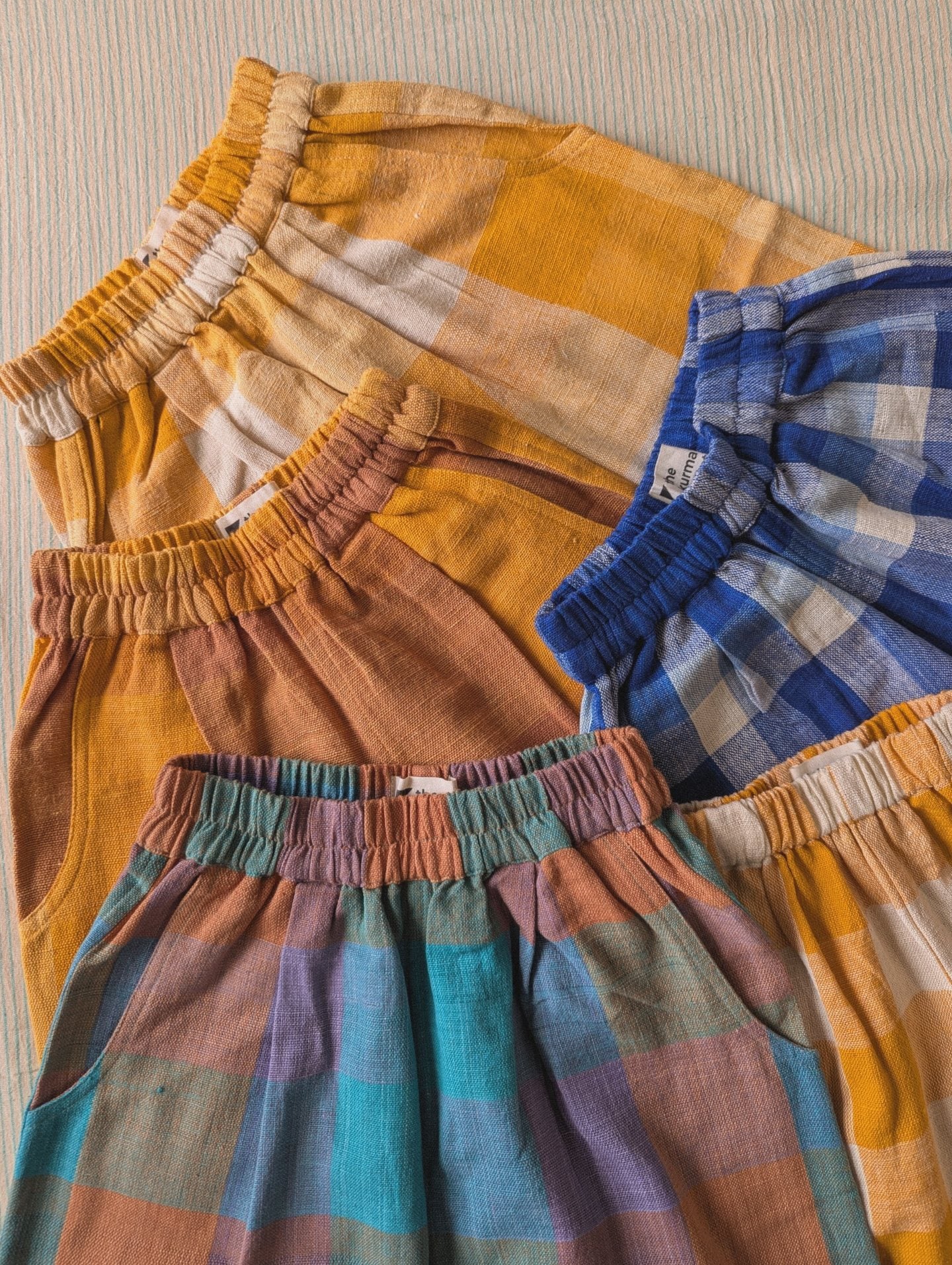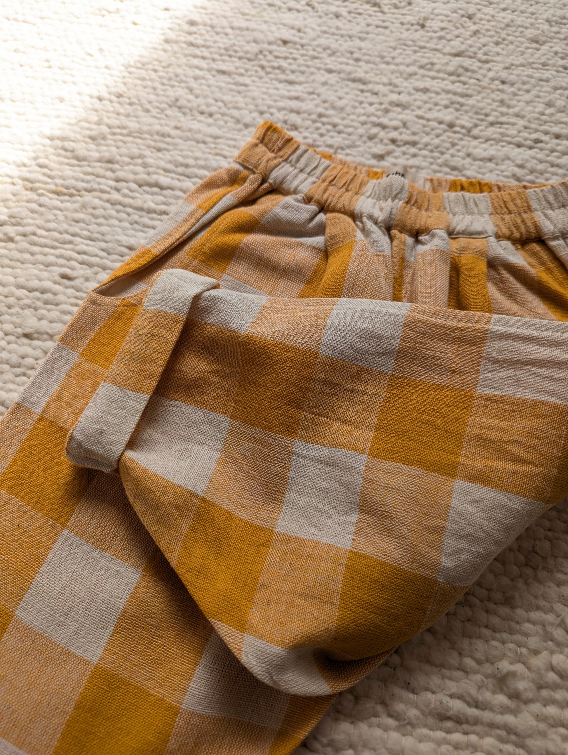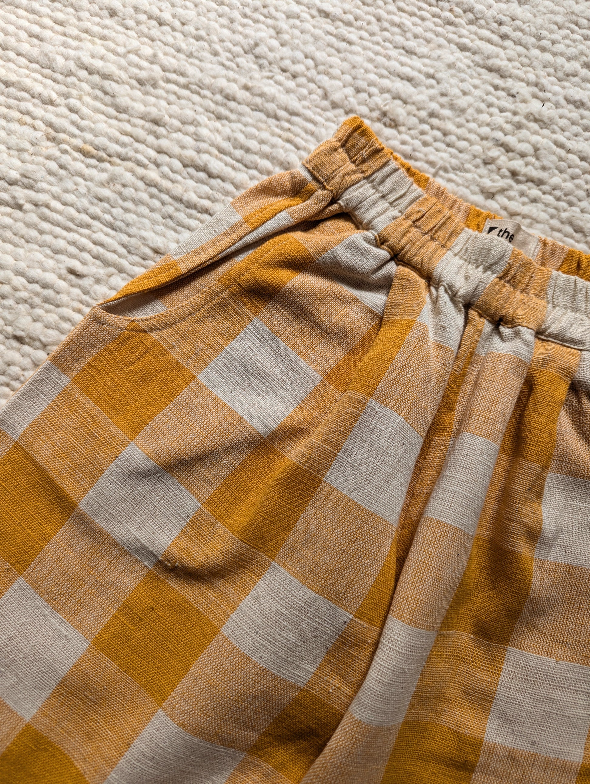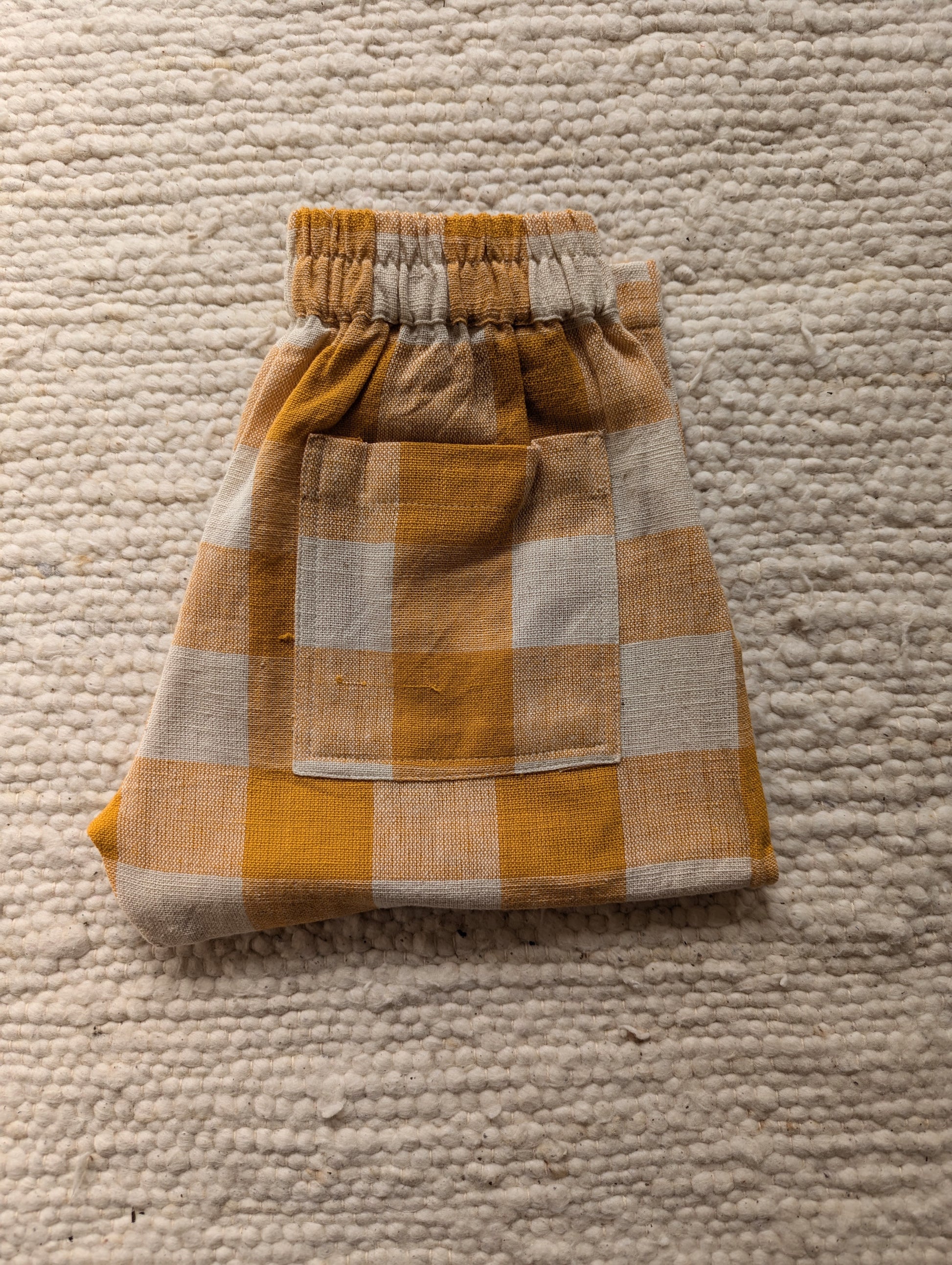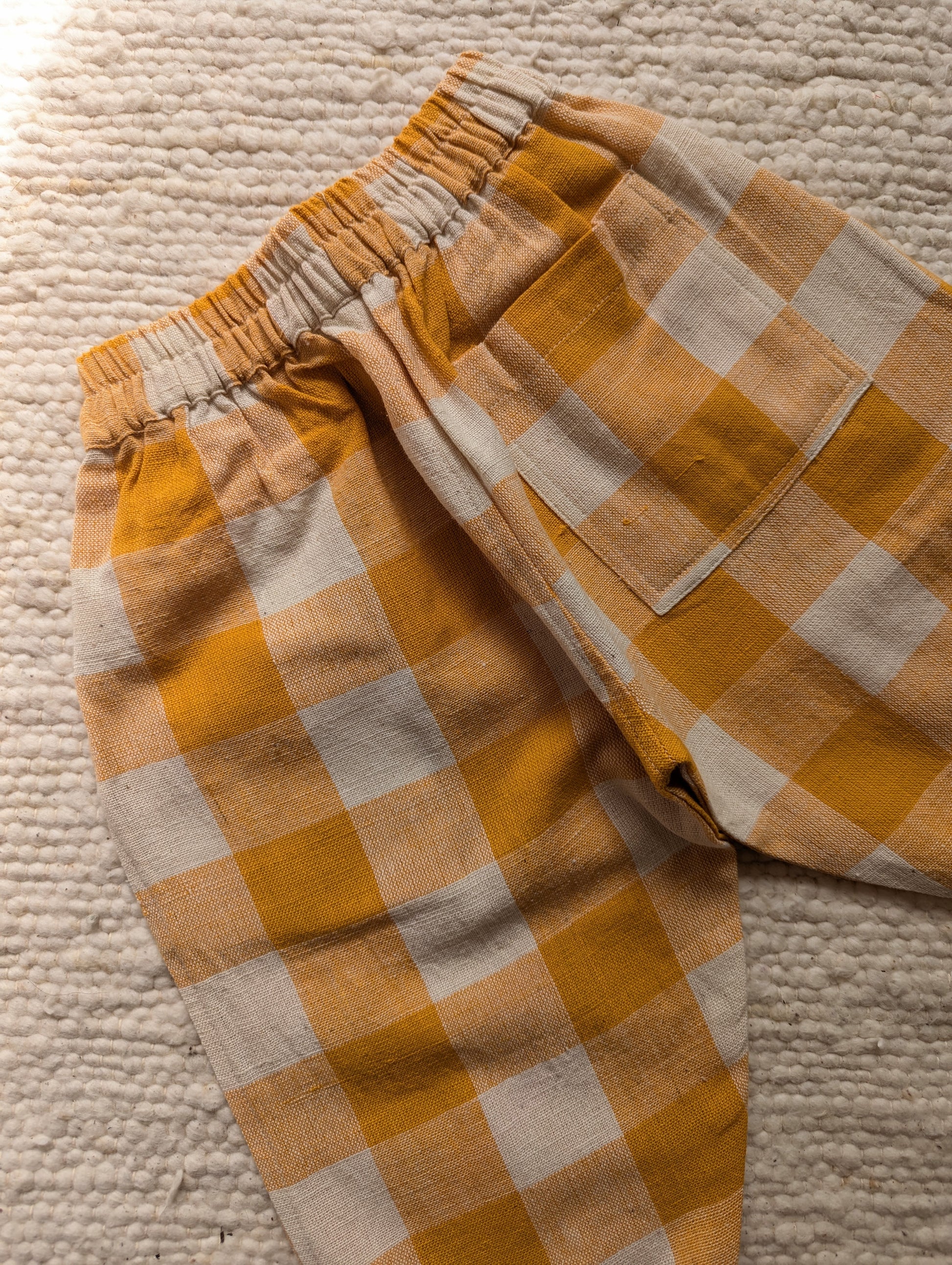 Handmade trousers in a warm marigold yellow and ecru small picnic check. Such a happy pair! The cotton is thick and durable, perfect for this weather. Designed to be roomy, allowing endless play and adventure. The trousers have elasticated waistbands, gently tapered legs, side pockets, and a back patch pocket for all the little treasures! We strive to give you quality, style and comfort in our trousers.