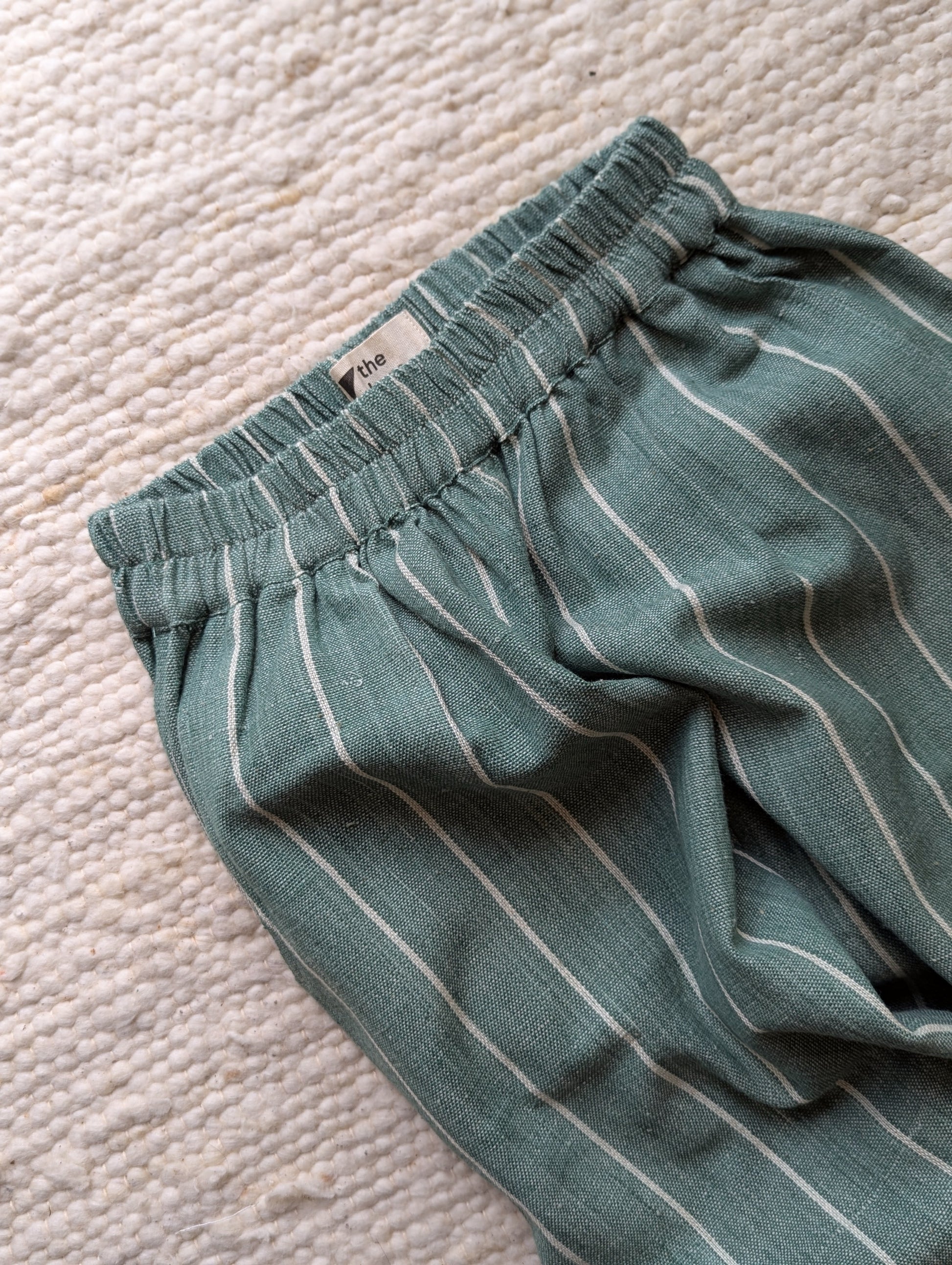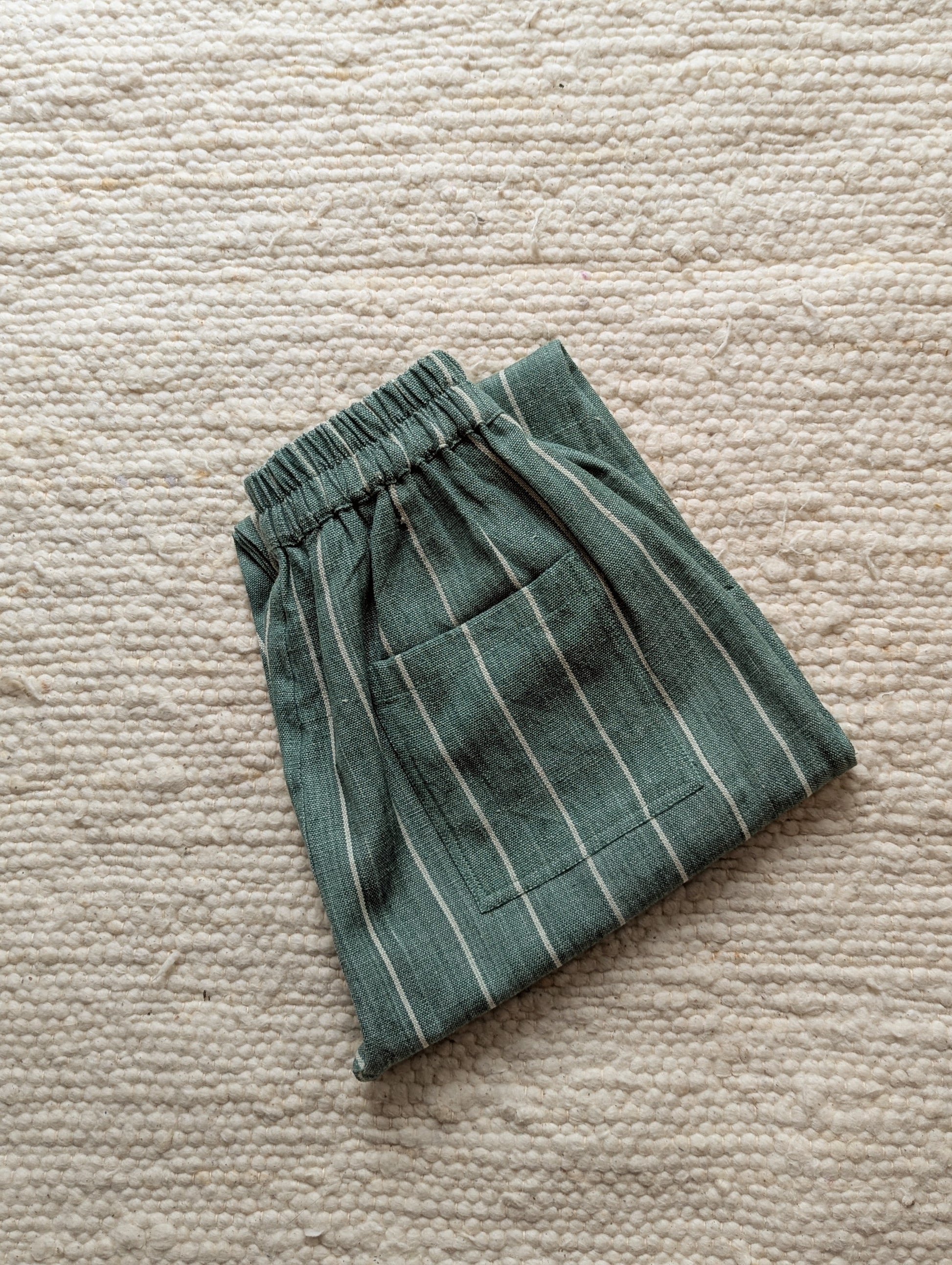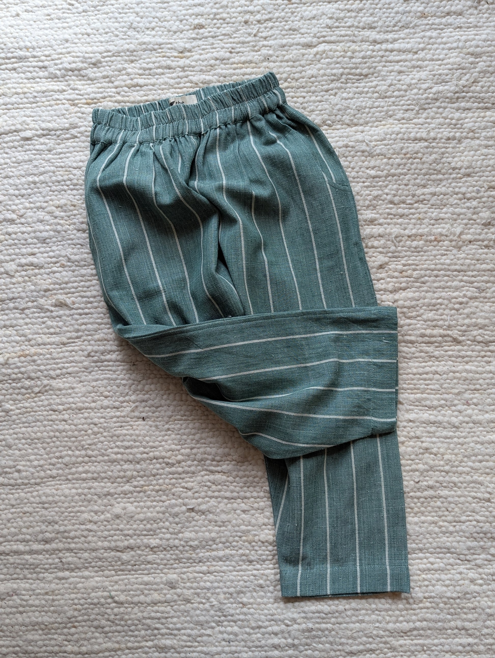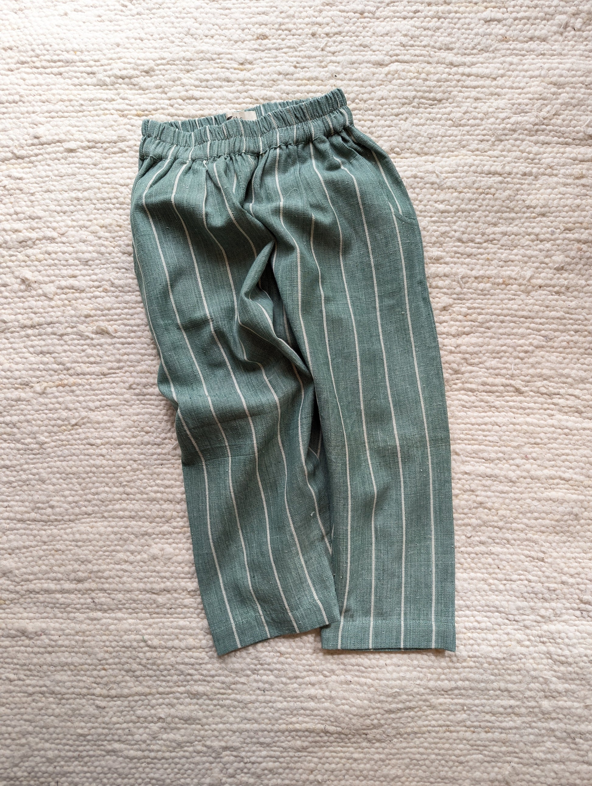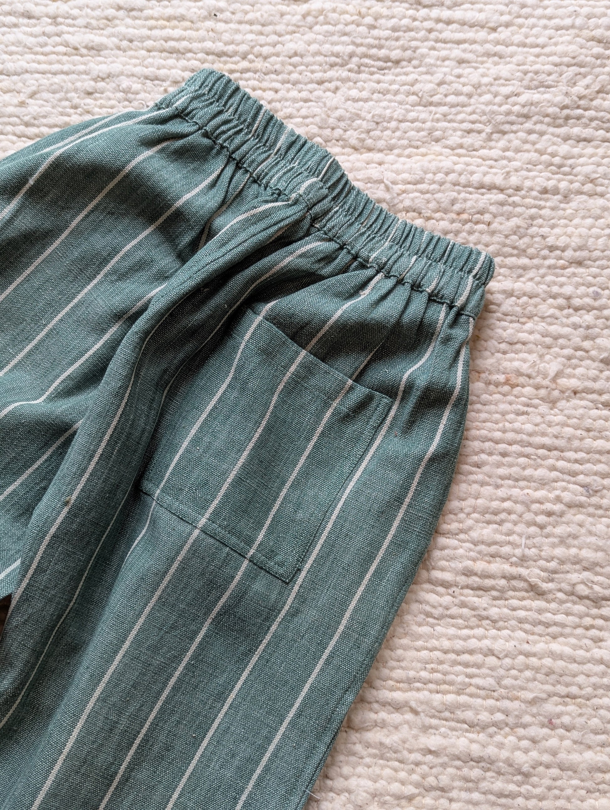 Handmade trousers using striped moss green and ecru fabric. The cotton is thick and durable, perfect for this weather. Designed to be roomy, allowing endless play and adventure. The trousers have elasticated waistbands, gently tapered legs, side pockets, and a back patch pocket for all the little treasures! We strive to give you quality, style and comfort in our trousers.