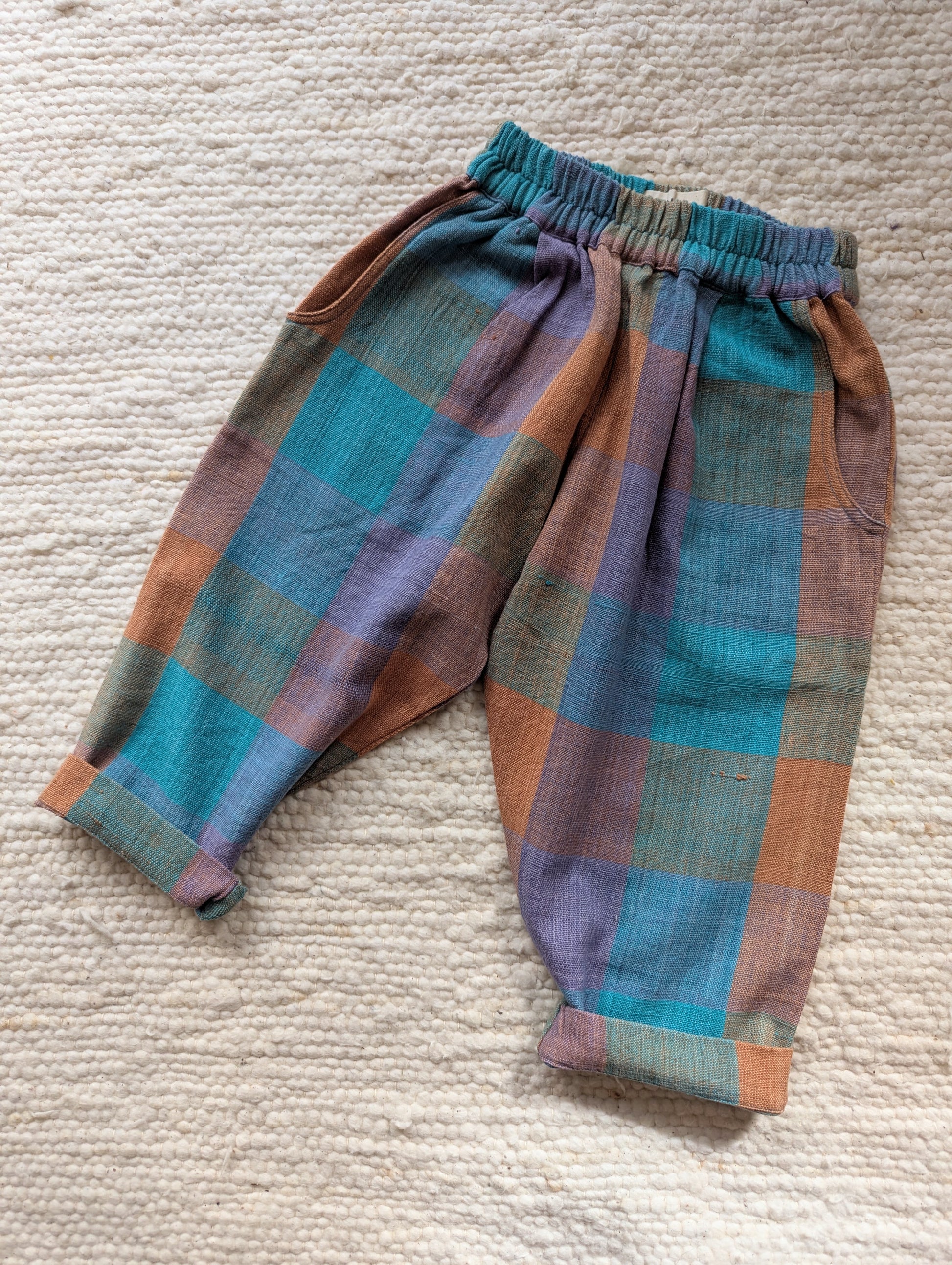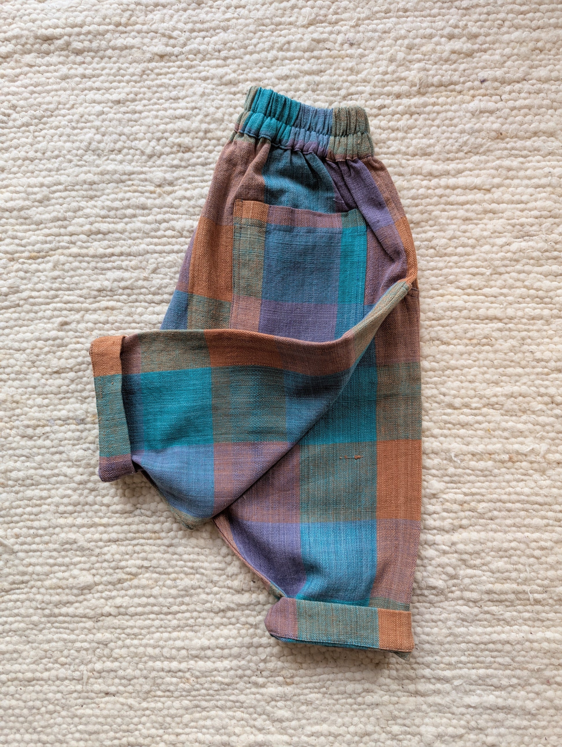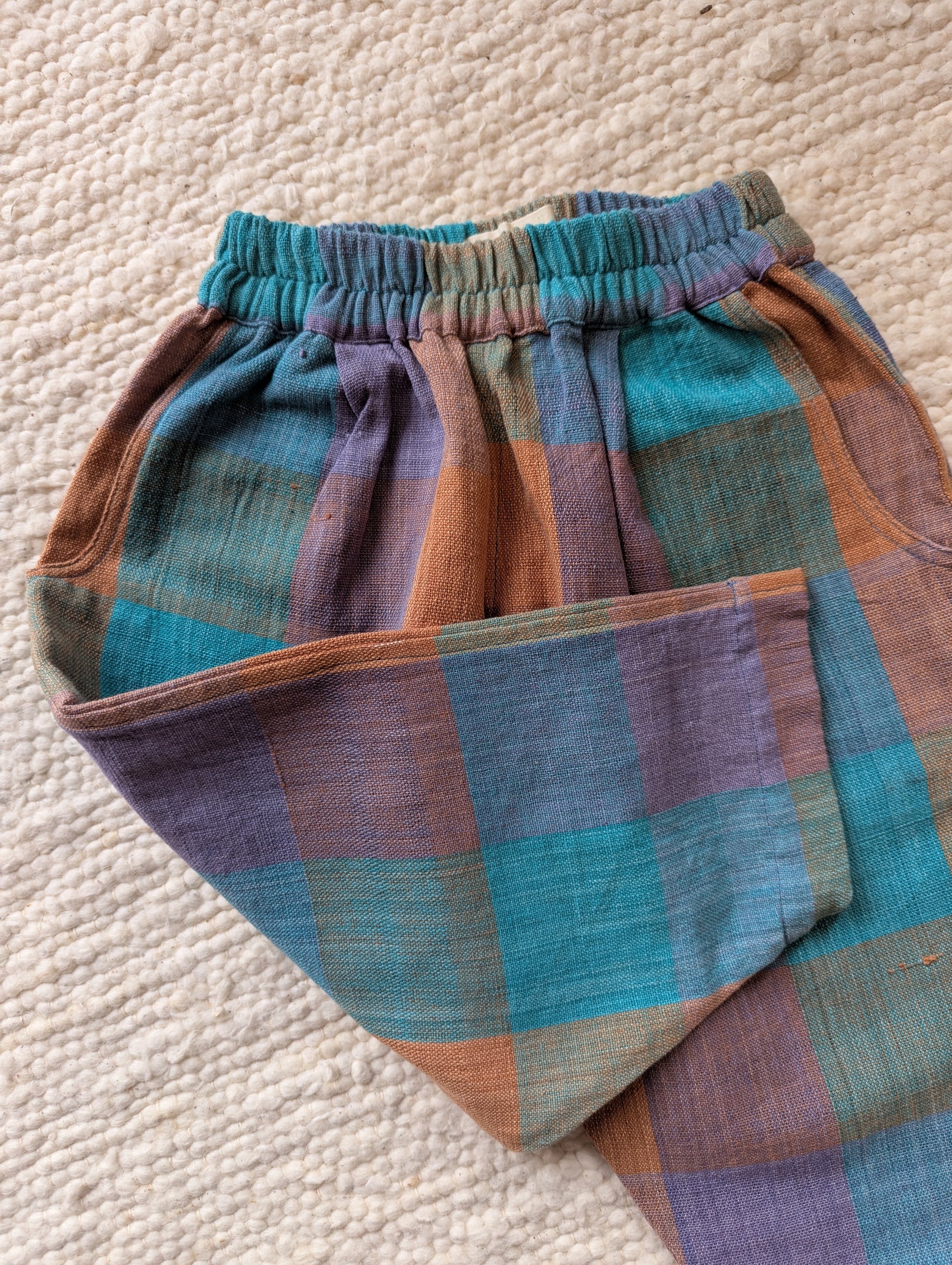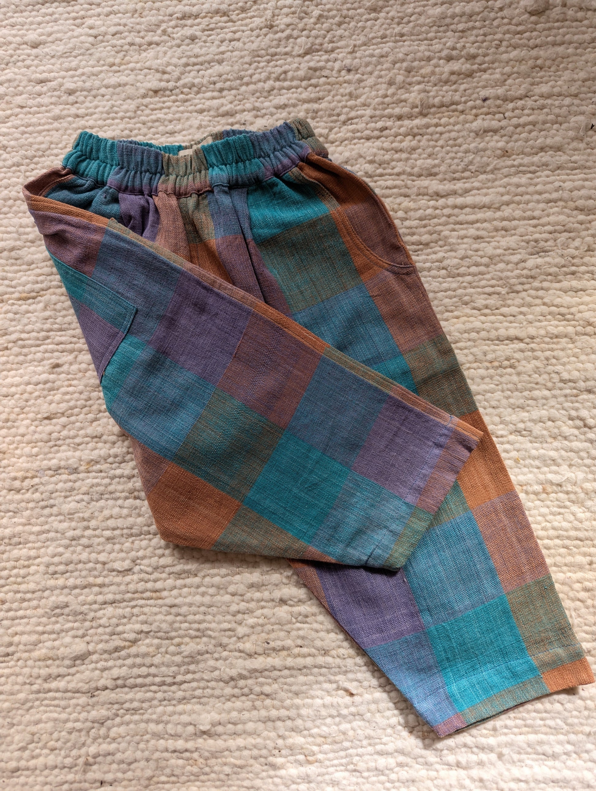 Handmade trousers in a cross check weave and gorgeous earthy hues of multicolours. The cotton is thick and durable, perfect for this weather. Designed to be roomy, allowing endless play and adventure. The trousers have elasticated waistbands, gently tapered legs, side pockets, and a back patch pocket for all the little treasures! We strive to give you quality, style and comfort in our trousers.