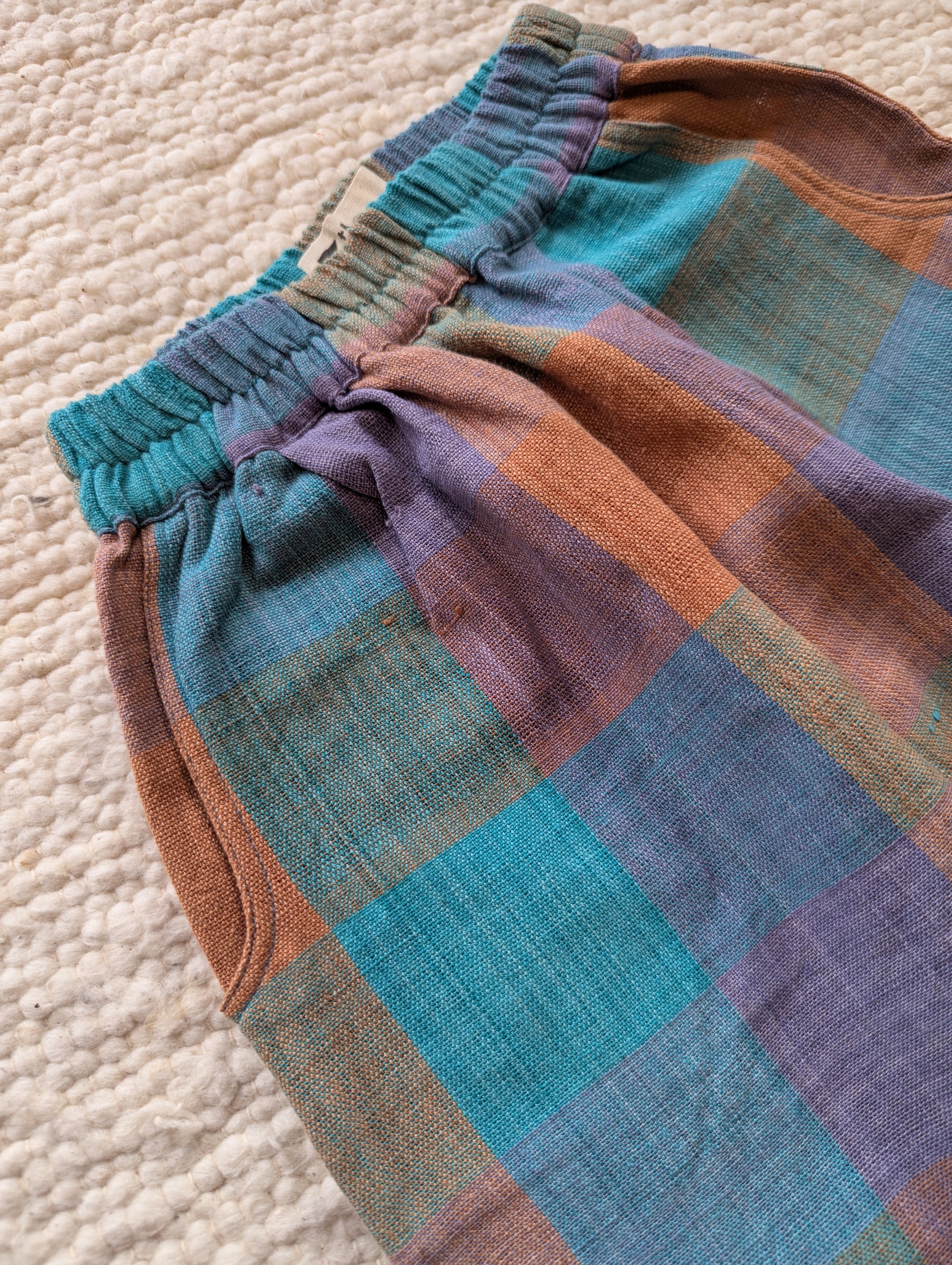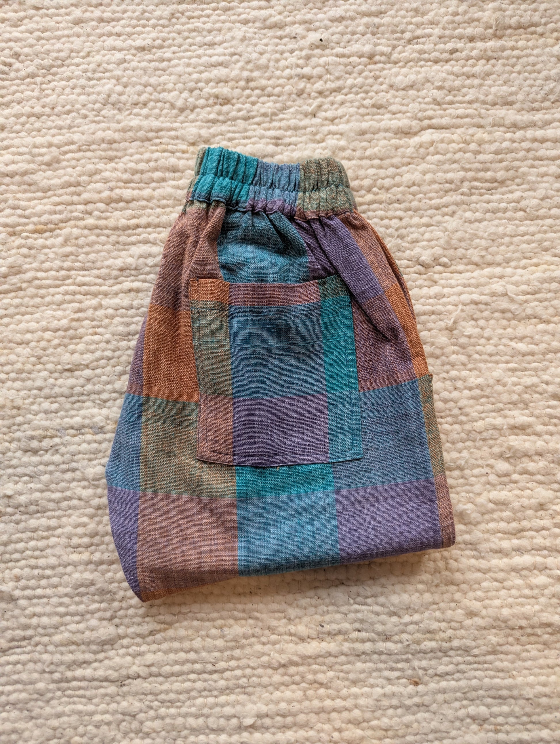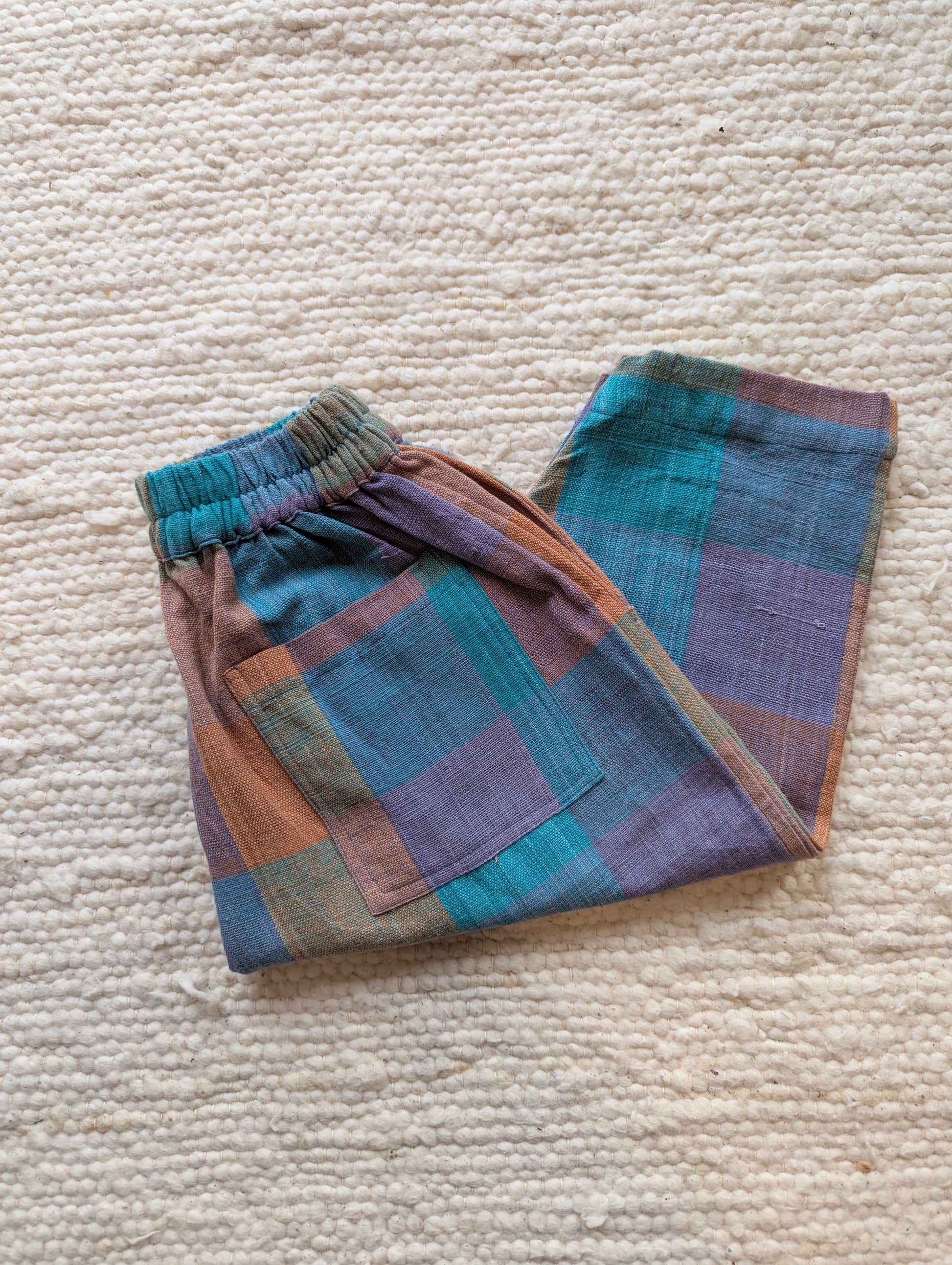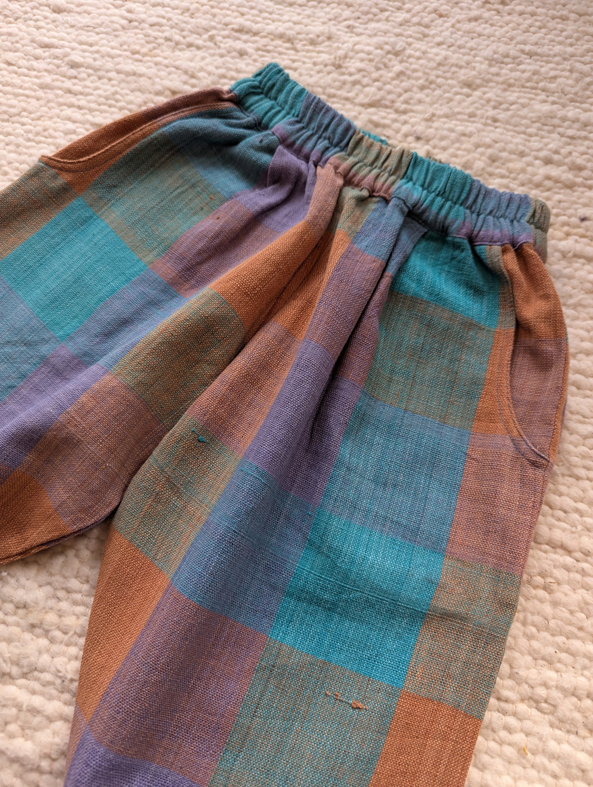 Handmade trousers in a cross check weave and gorgeous earthy hues of multicolours. The cotton is thick and durable, perfect for this weather. Designed to be roomy, allowing endless play and adventure. The trousers have elasticated waistbands, gently tapered legs, side pockets, and a back patch pocket for all the little treasures! We strive to give you quality, style and comfort in our trousers.