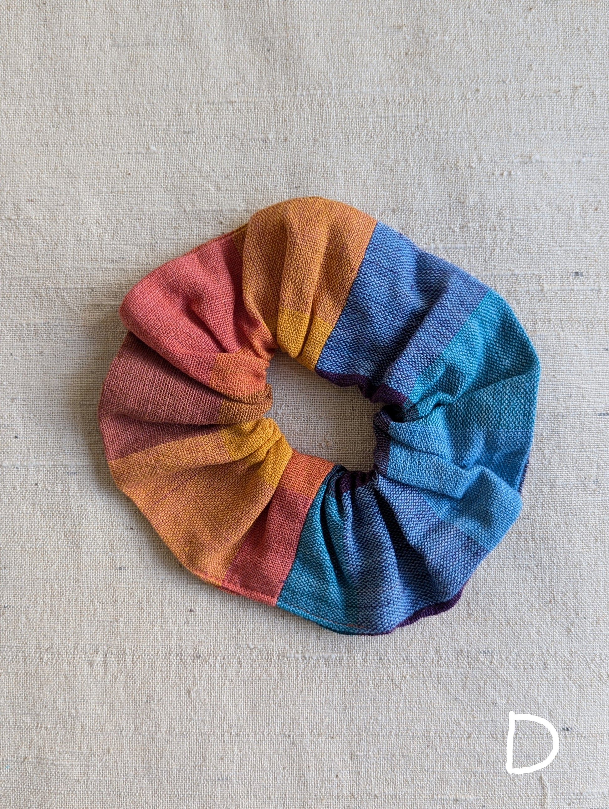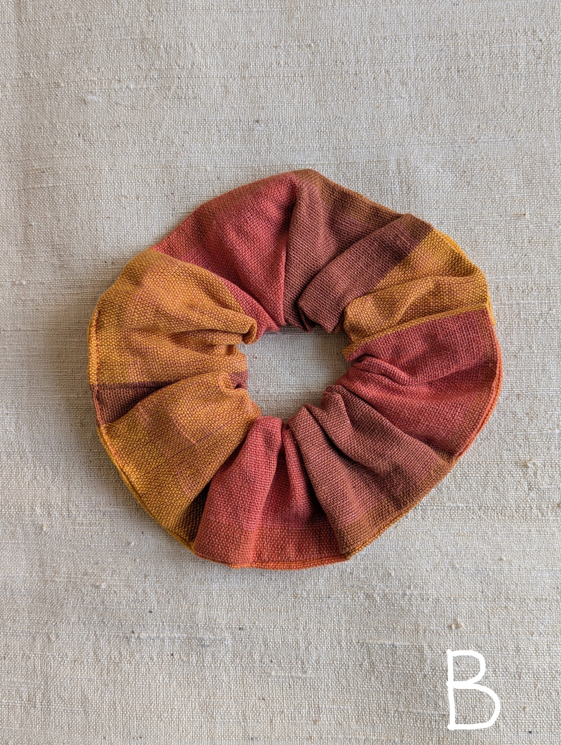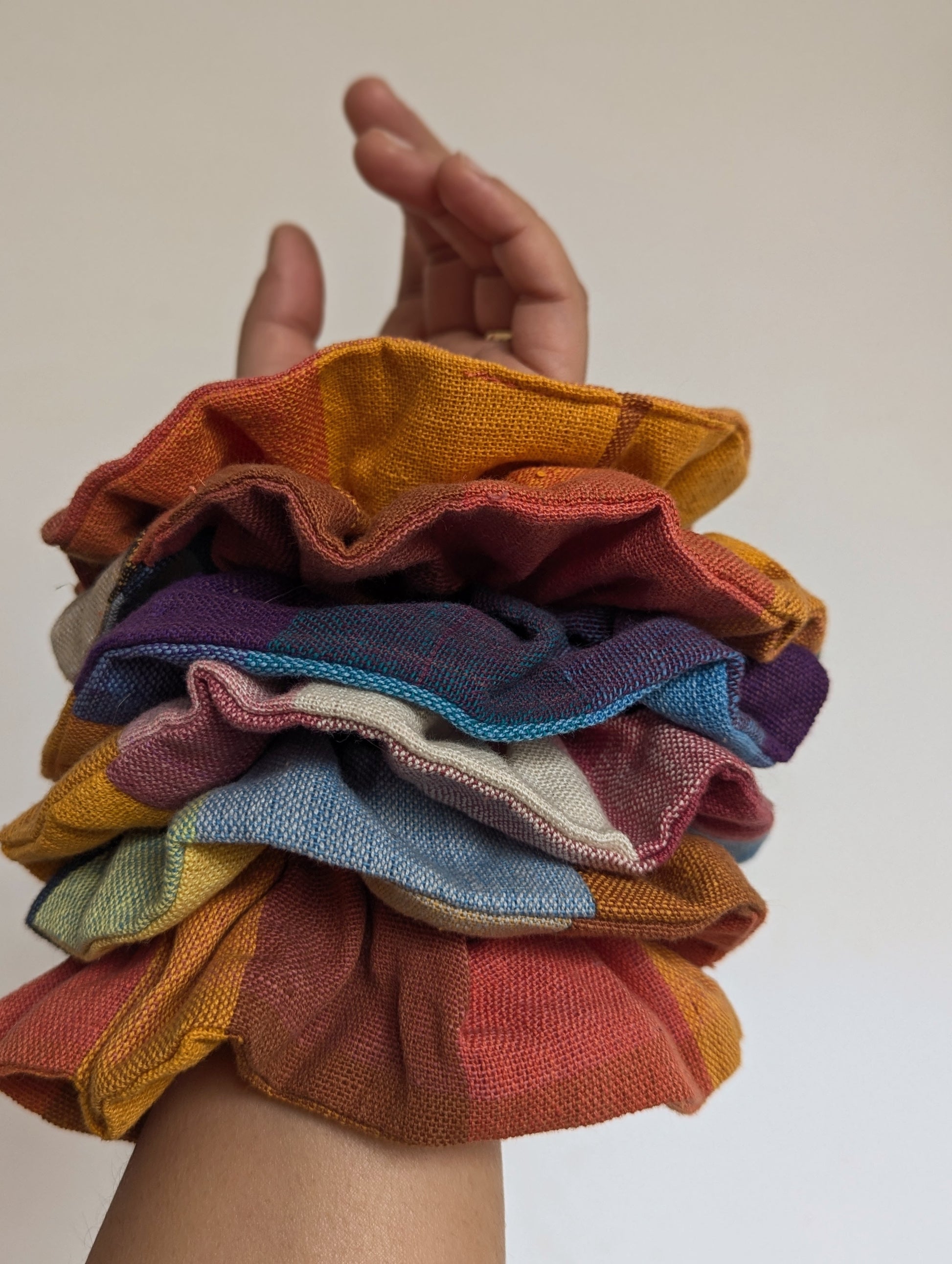 Handloom cotton large scrunchies in gorgeous warm shades of oranges/yellow. Please select the one you like from the options available.