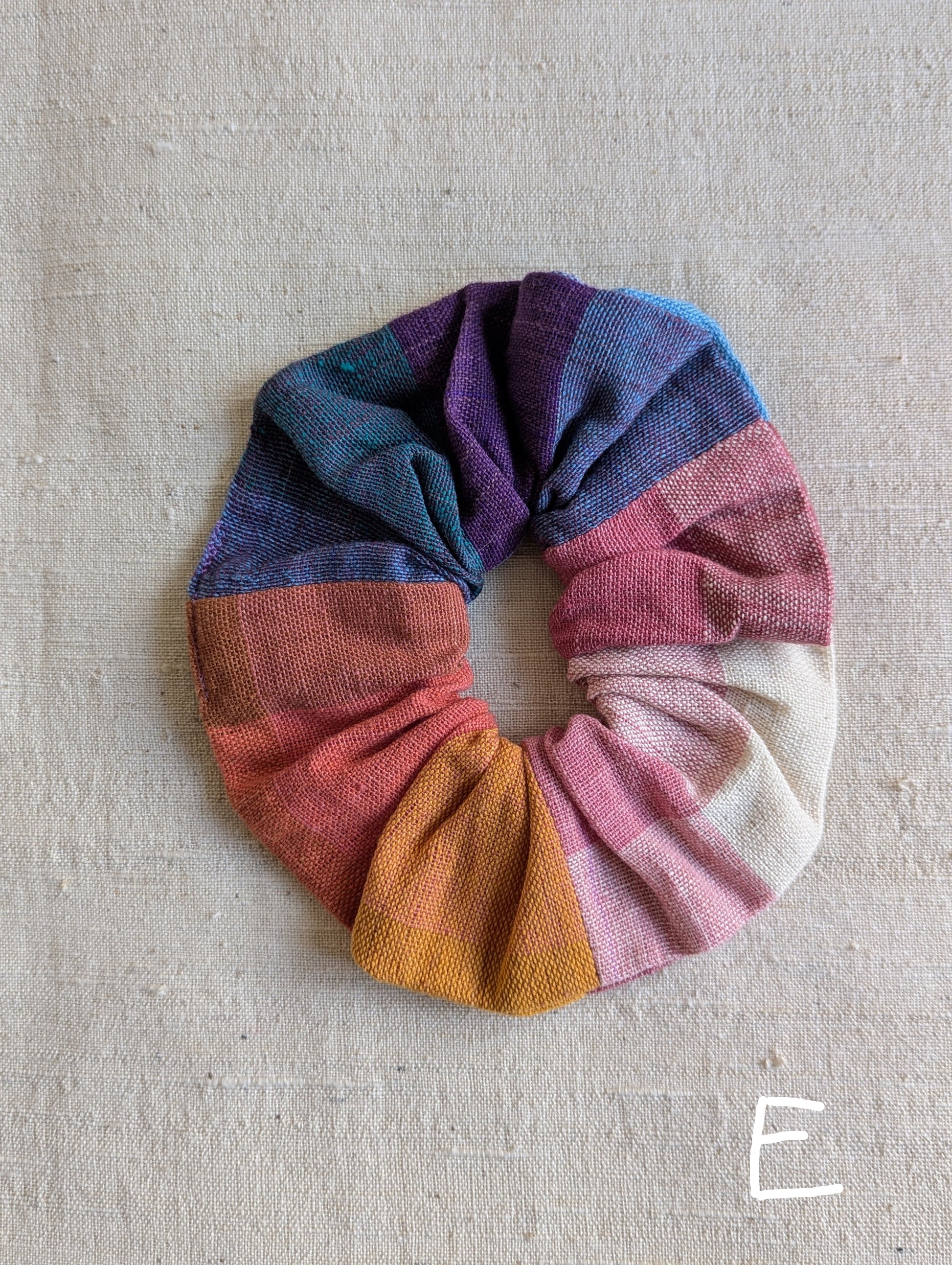 Nothing goes to waste here....We have used every bit of our off cuts and remnant handwoven cotton fabrics from the trousers. All scrunchies are handmade in the UK by lovely Rox from YOUNG DOUBLE. A gorgeous mix of colour and pattern...making every piece unique!