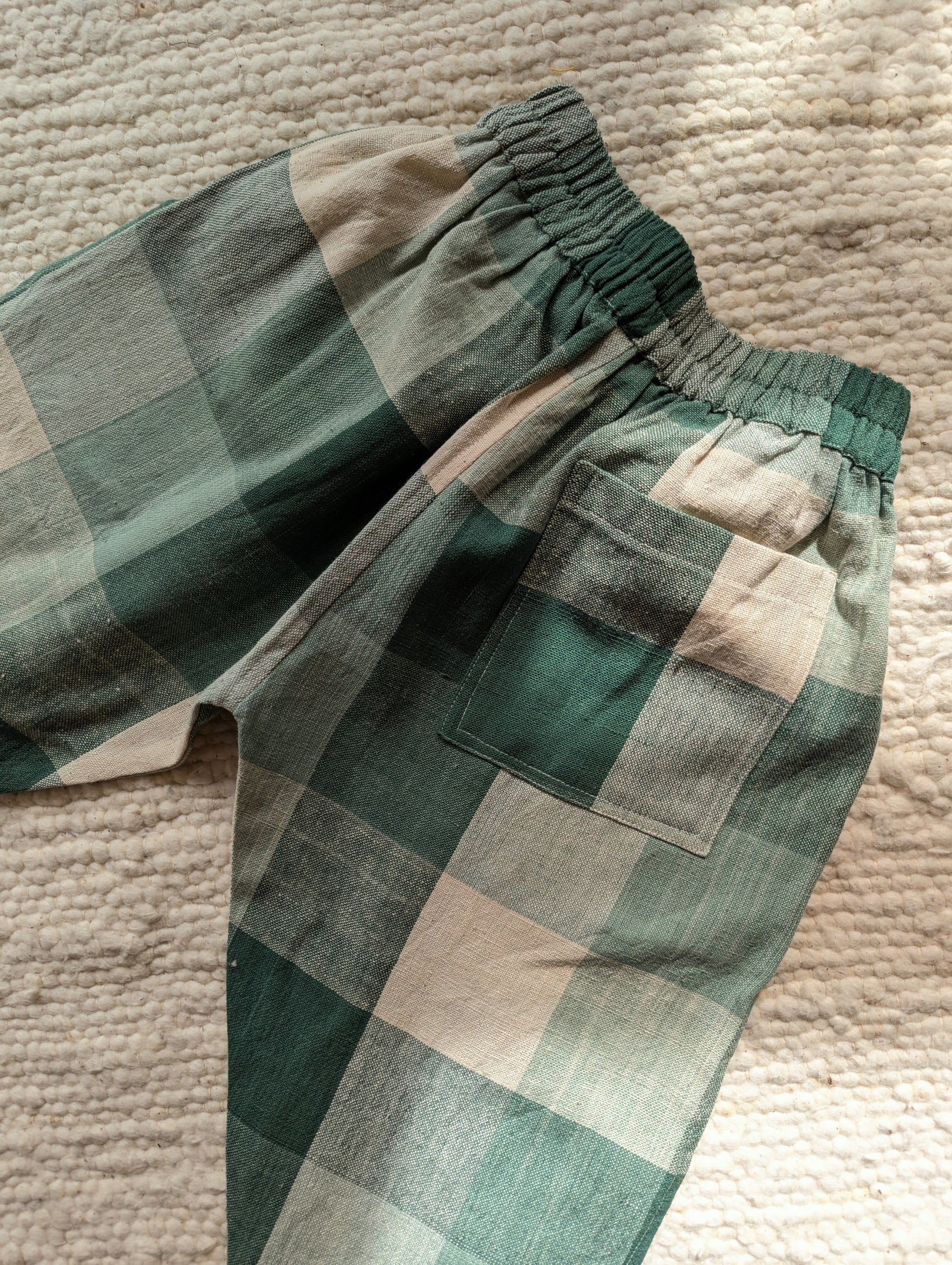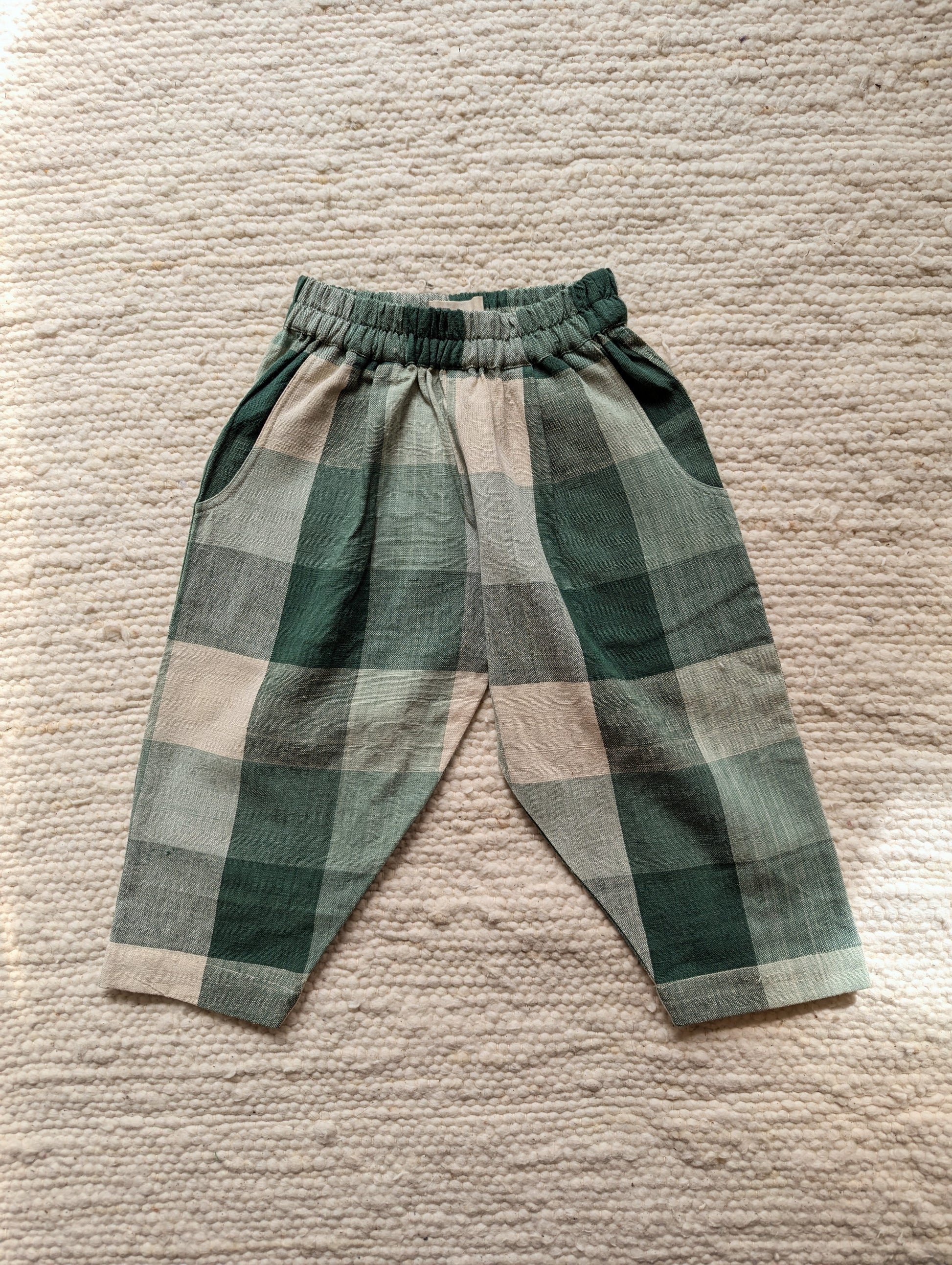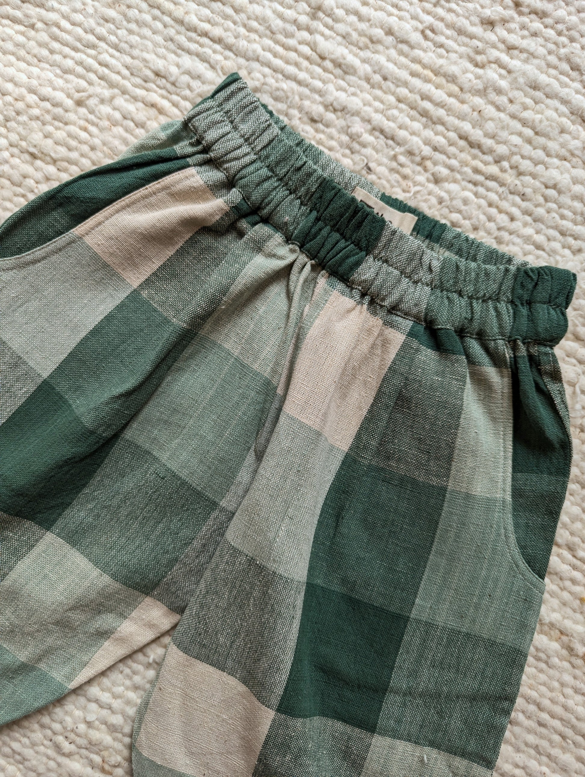 Pine Forest checks is woven in beautiful shades of green and warm ecru. The cotton is thick and durable, perfect for this weather. Designed to be roomy, allowing endless play and adventure. The trousers have elasticated waistbands, gently tapered legs, side pockets, and a back patch pocket for all the little treasures! We strive to give you quality, style and comfort in our trousers.