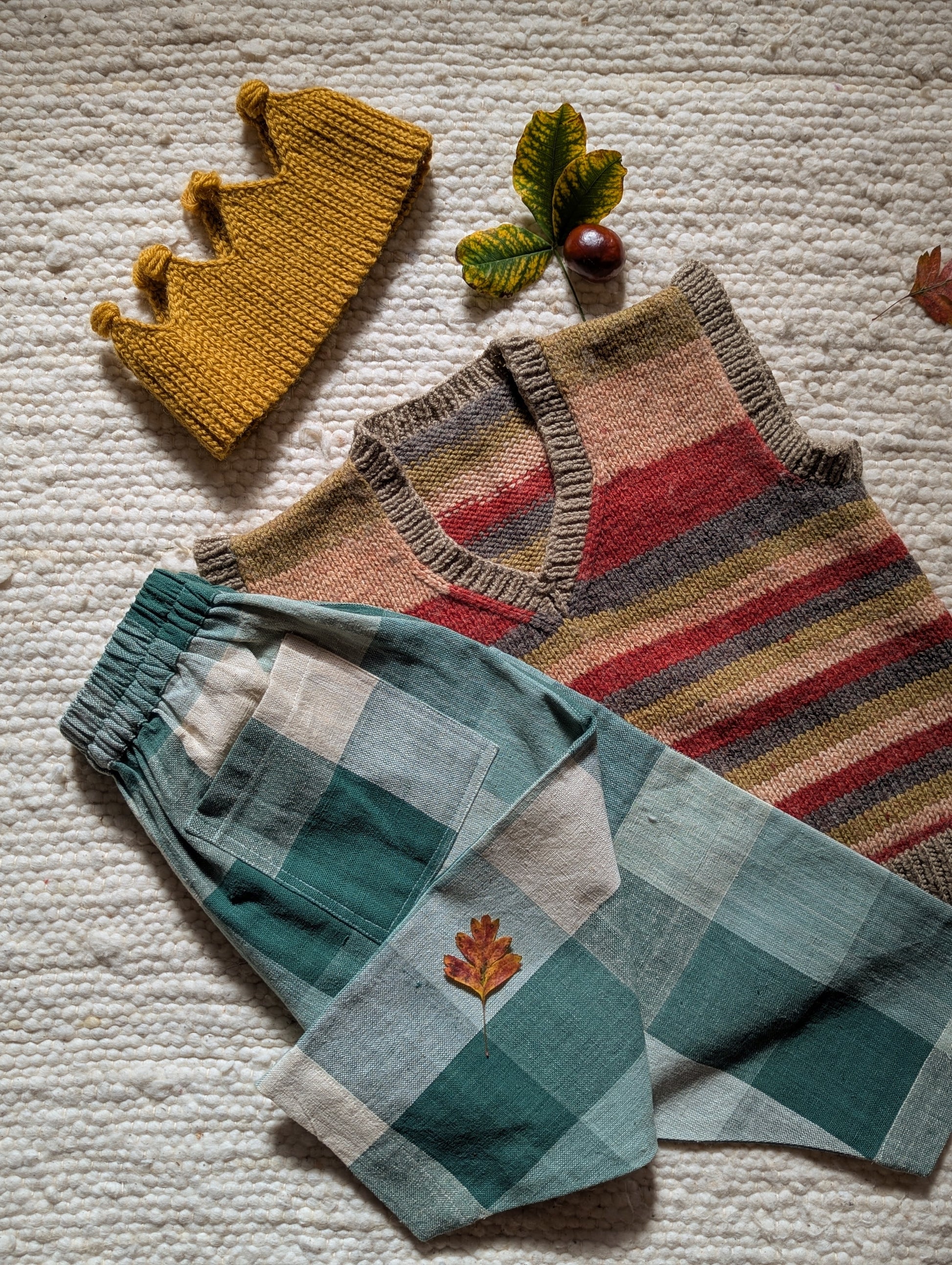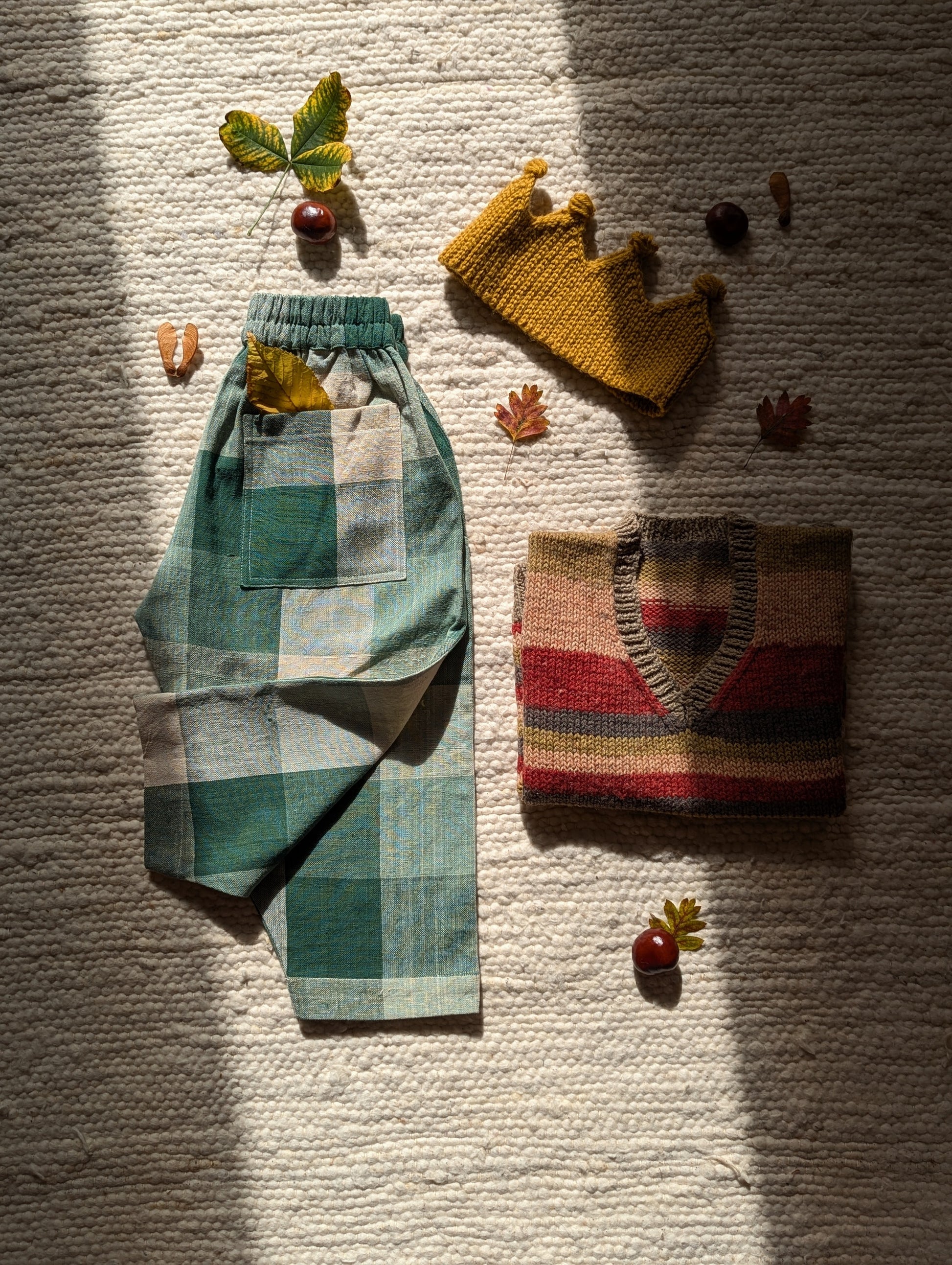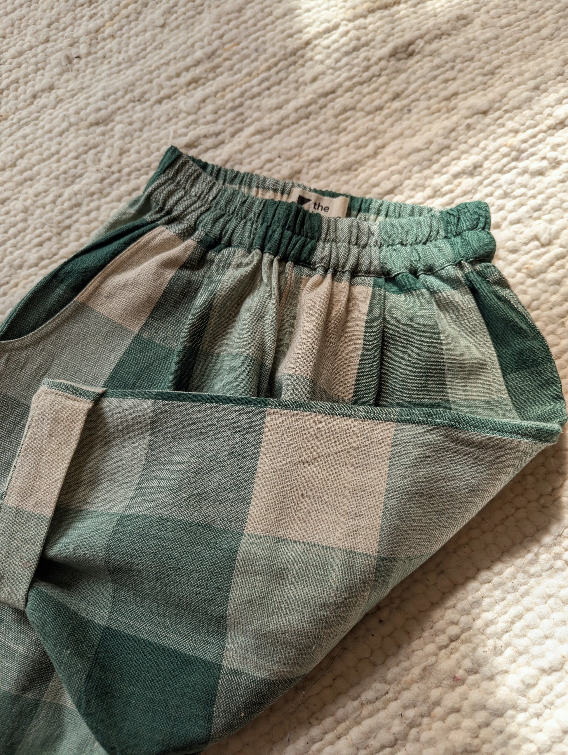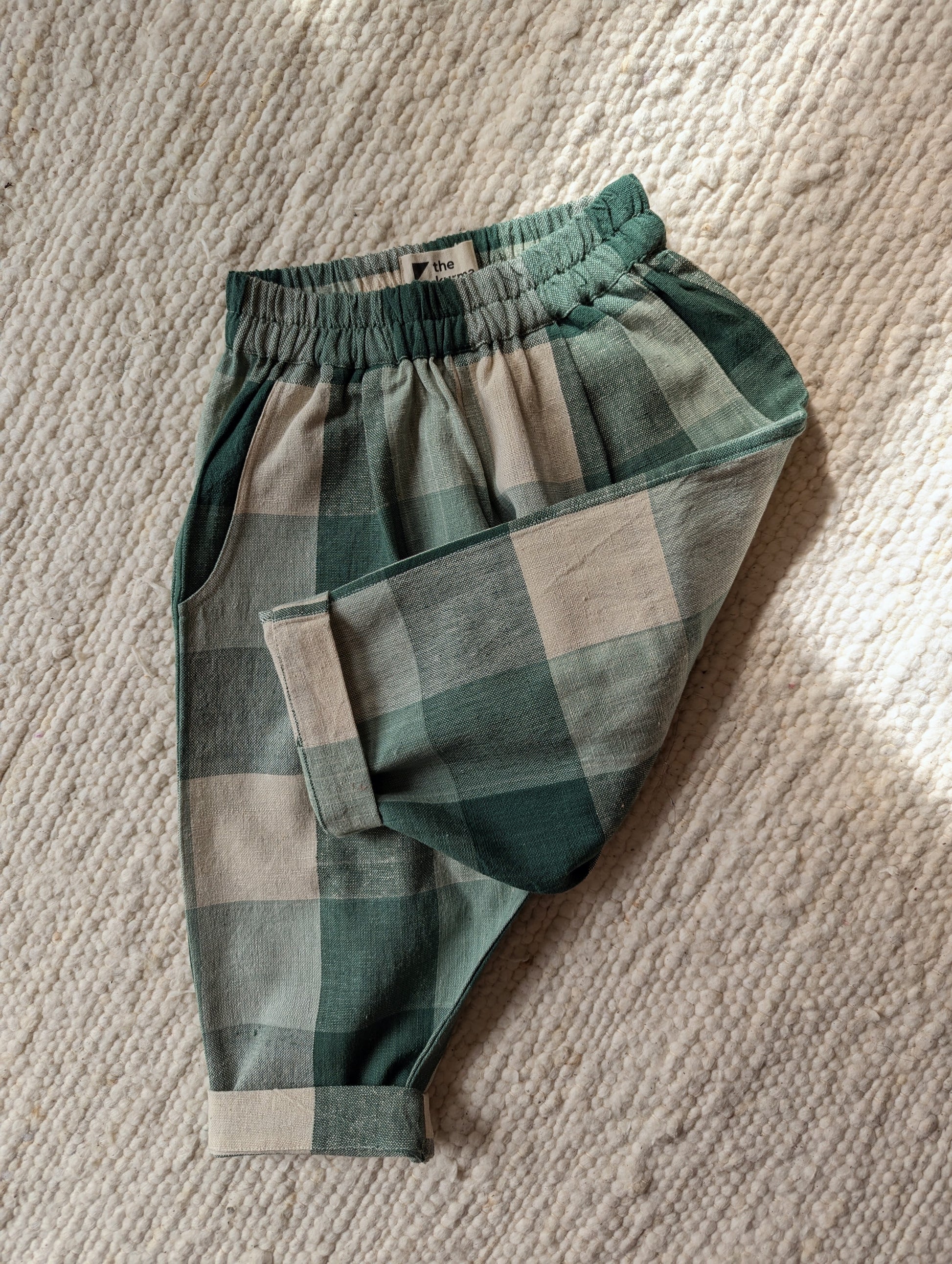 Pine Forest checks is woven in beautiful shades of green and warm ecru. The cotton is thick and durable, perfect for this weather. Designed to be roomy, allowing endless play and adventure. The trousers have elasticated waistbands, gently tapered legs, side pockets, and a back patch pocket for all the little treasures! We strive to give you quality, style and comfort in our trousers.