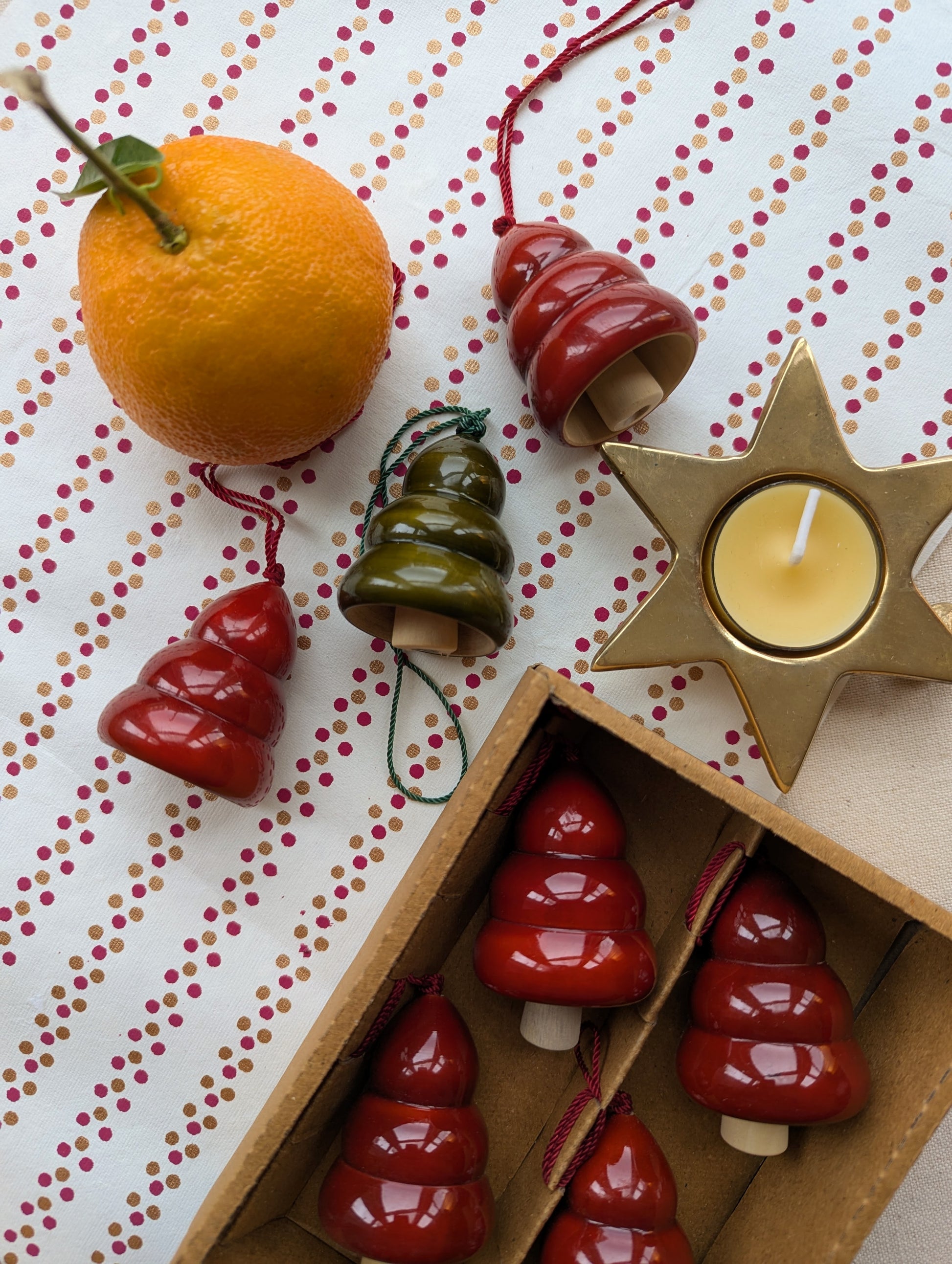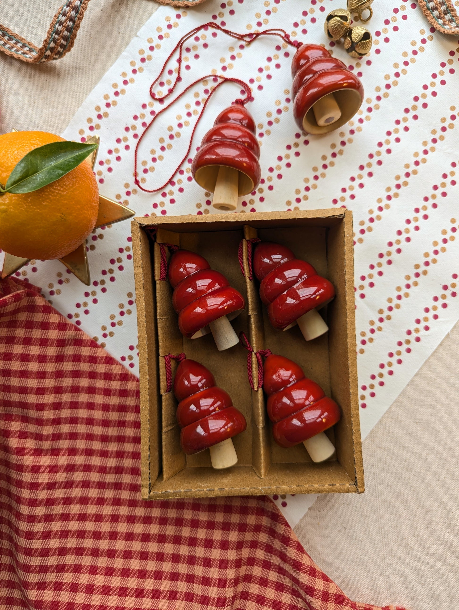 Handmade wooden Christmas tree bells. Available in 2 colour options, Festive Red or Pine Green. They will look lovely anywhere in your home and make such a sweet gift too!